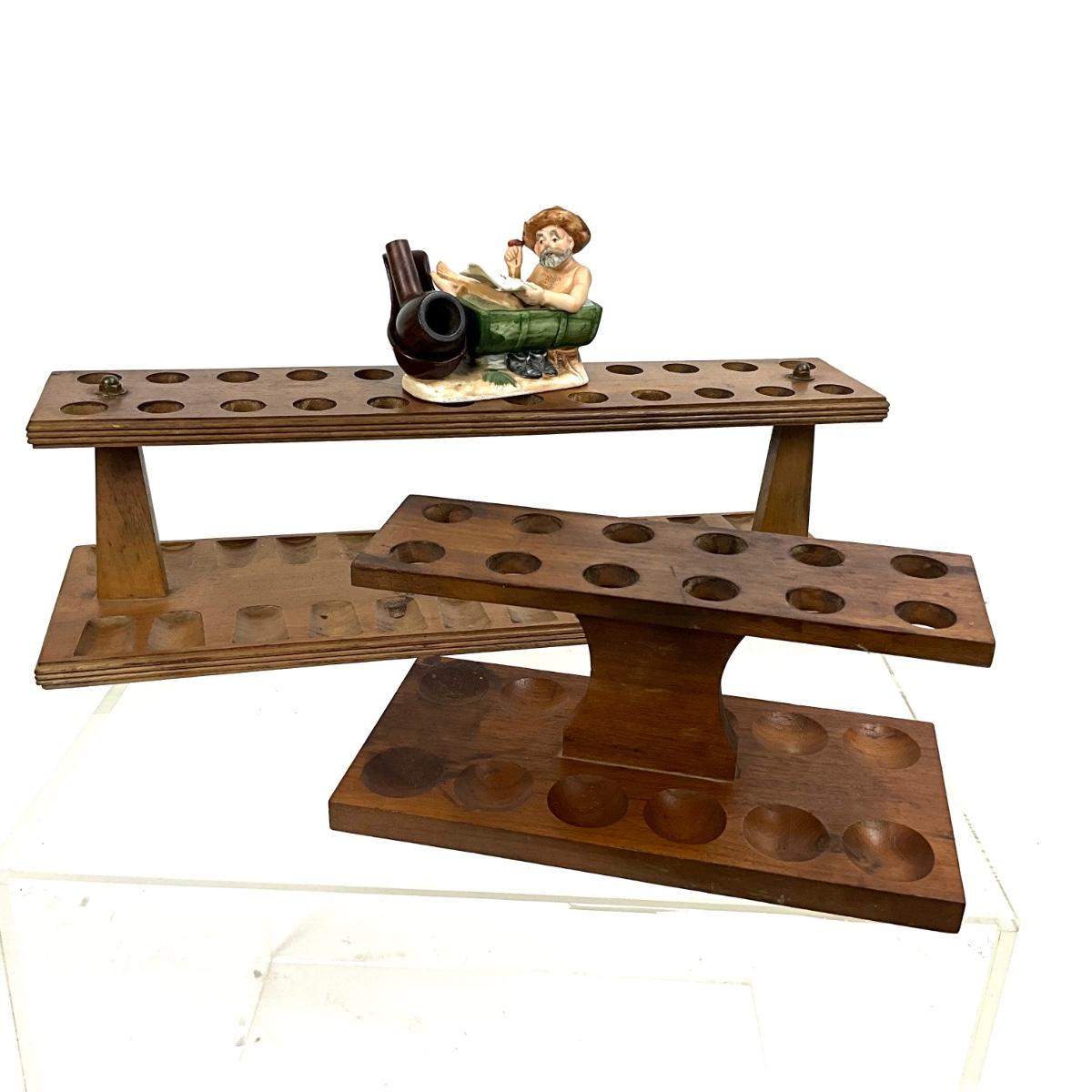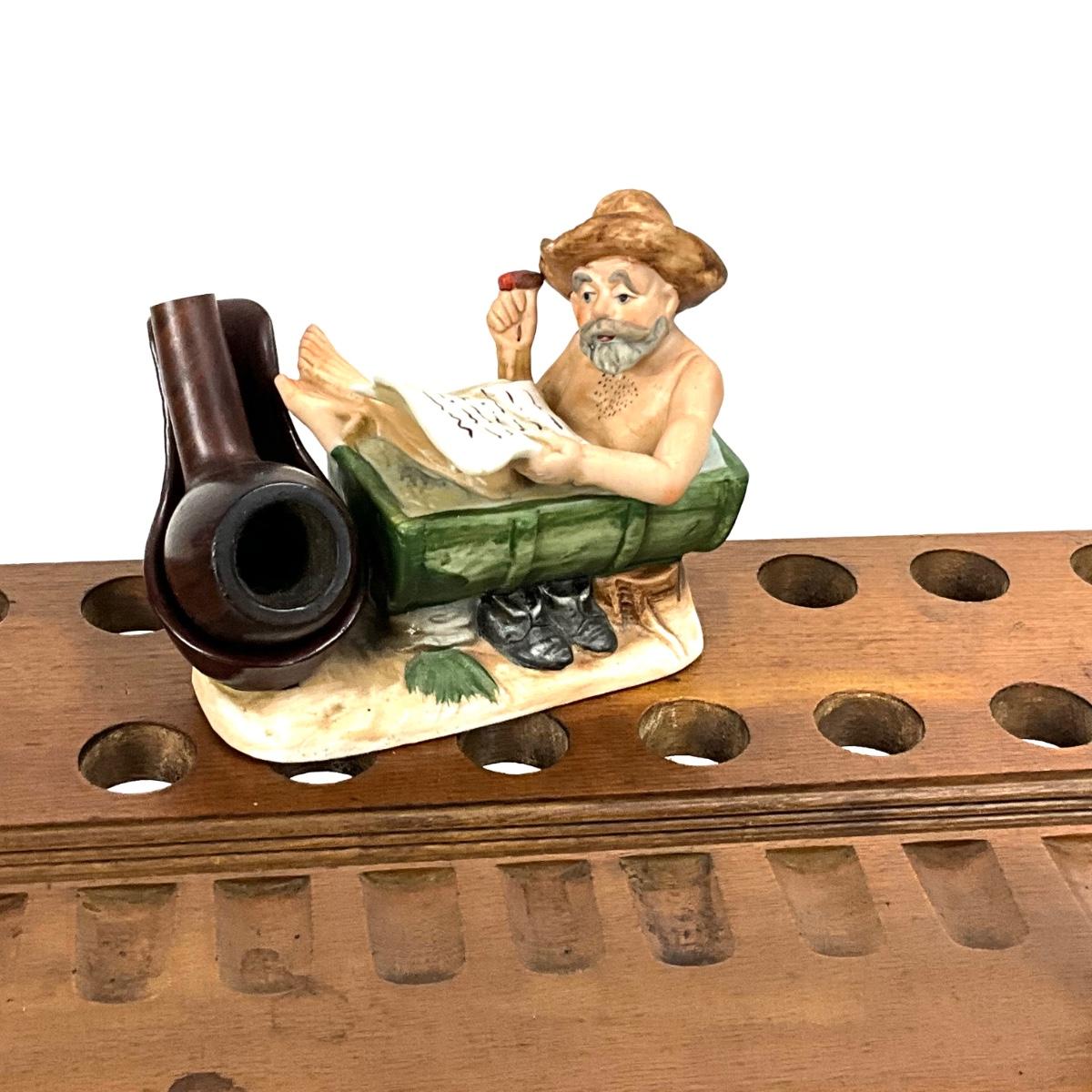 1411 Vintage Wooden Pipe Stands with Porcelain Figural Single Pipe Holder