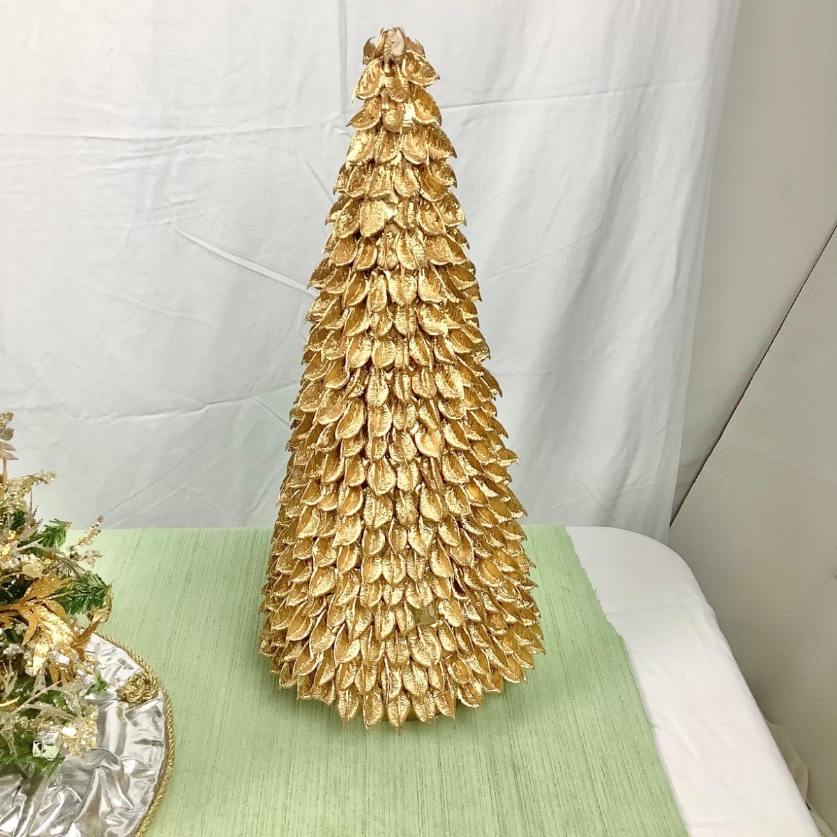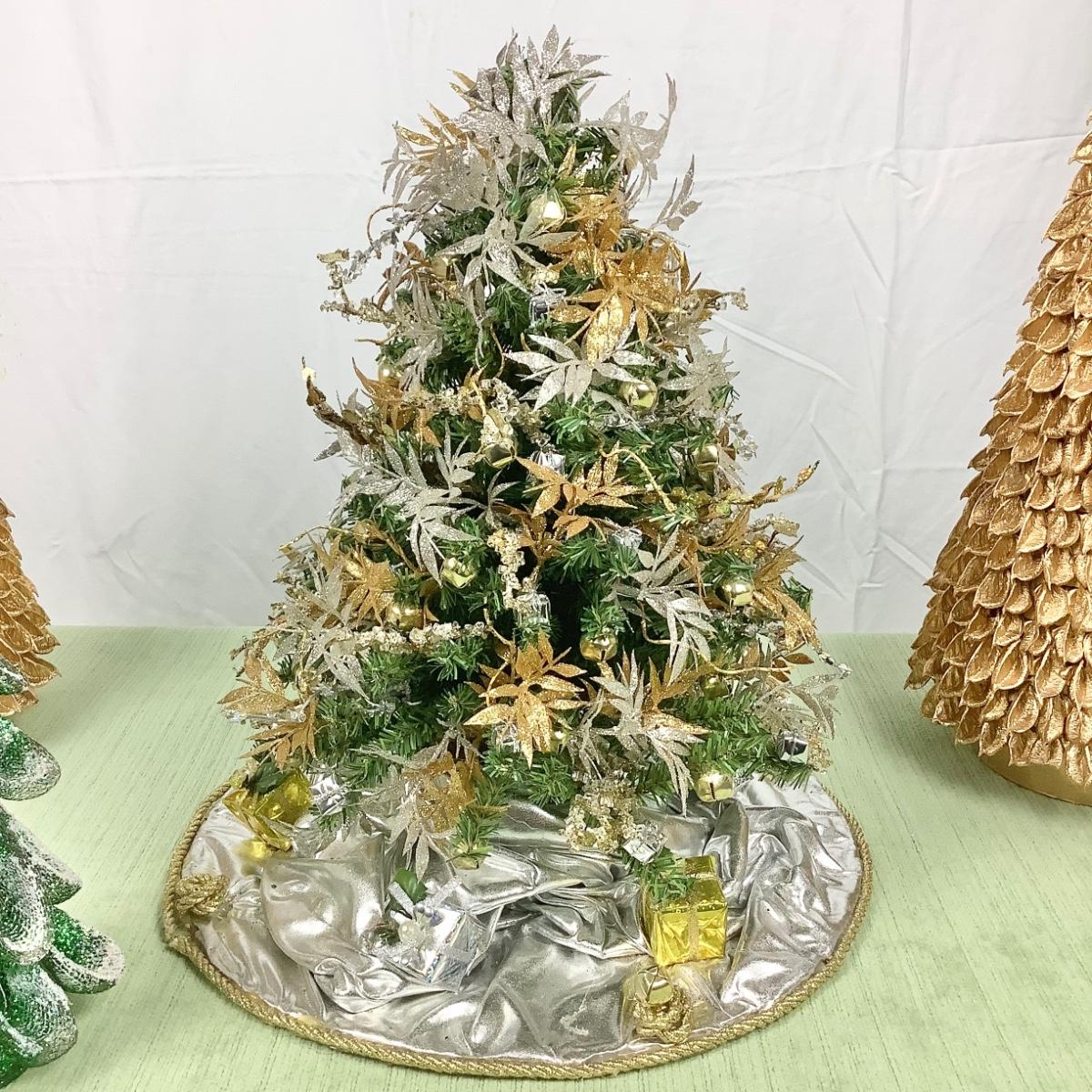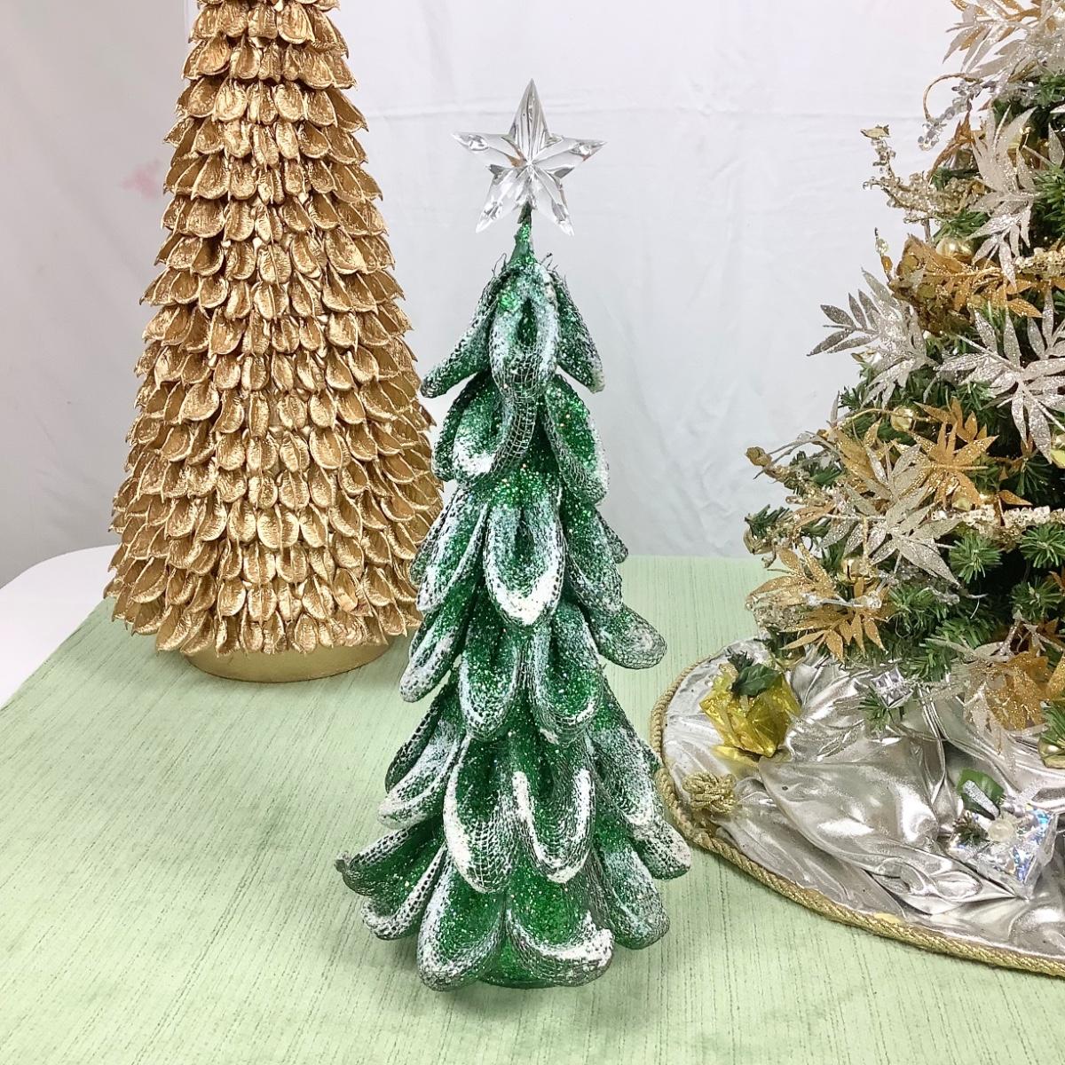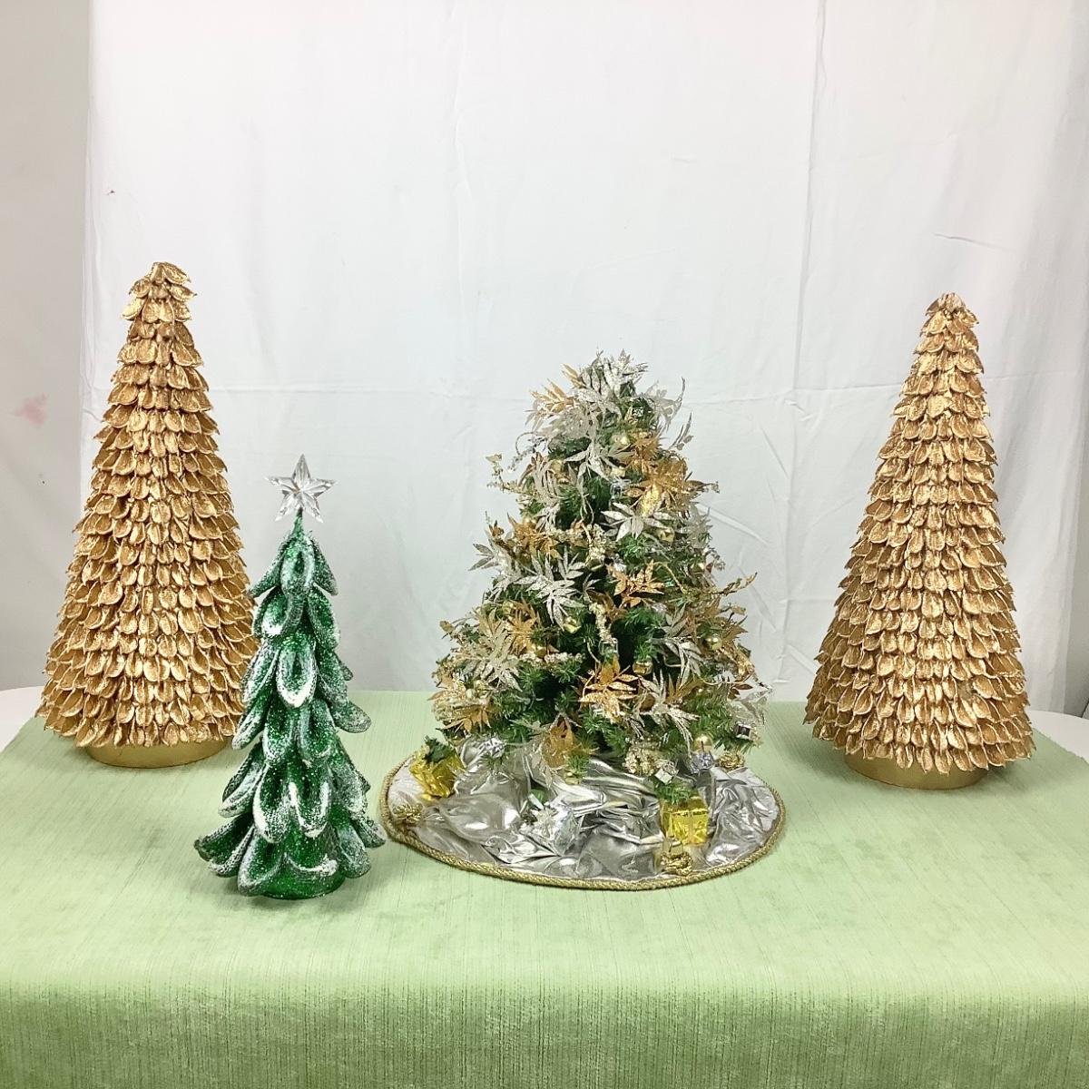One green Glitter tree 13" high and one gold and silver leaf tree with silver skirt measuring 15" high