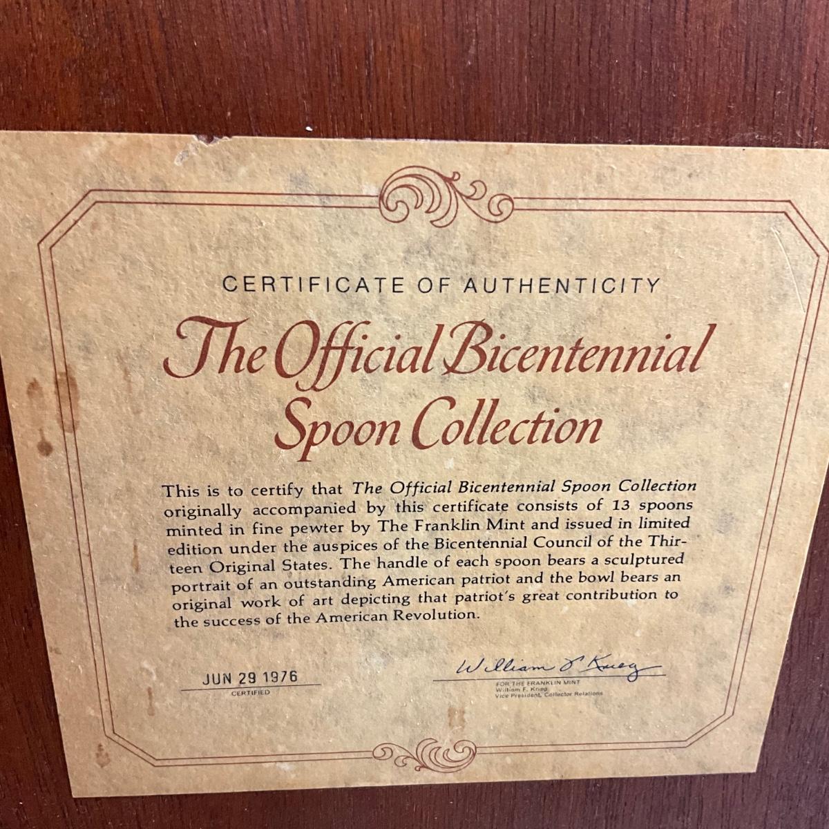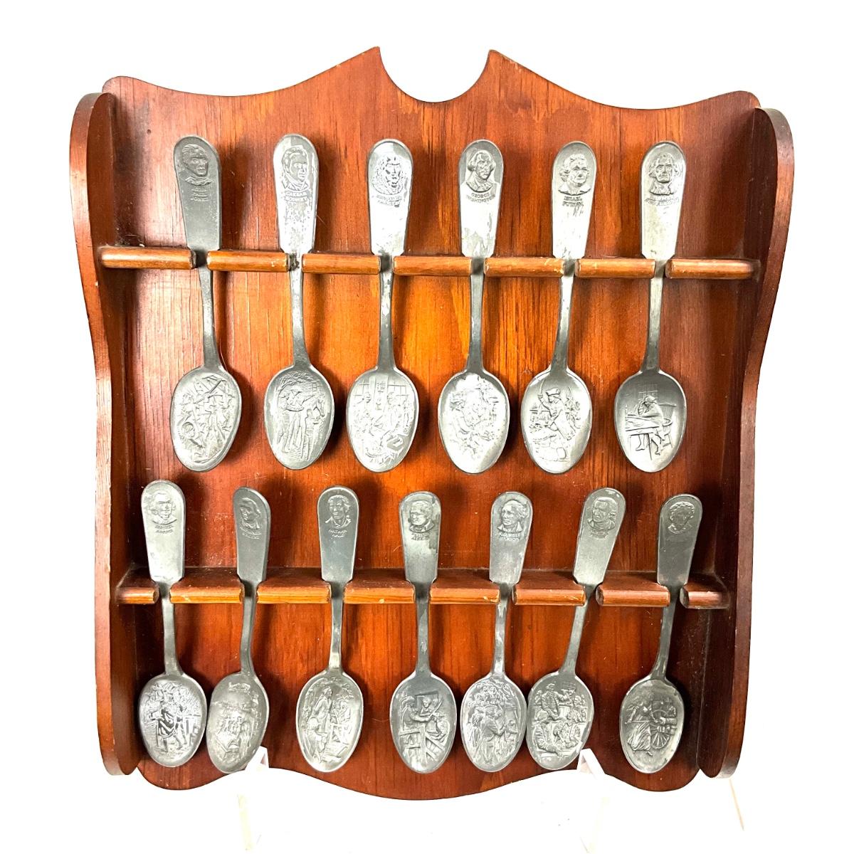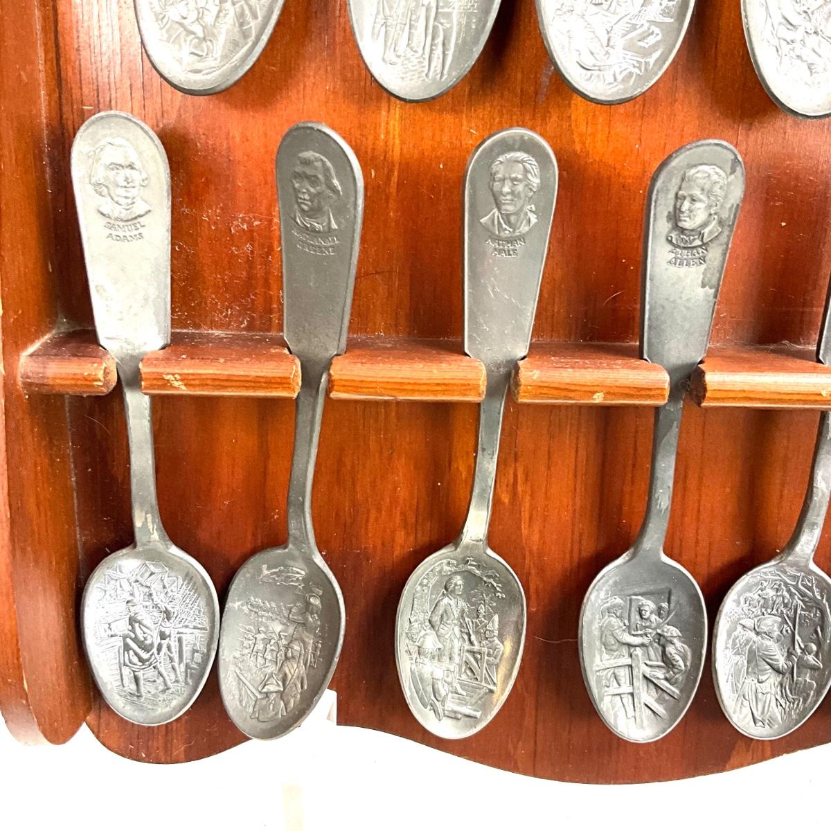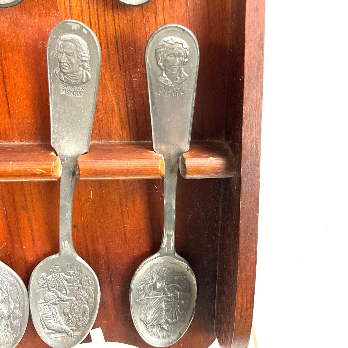 1418 Vintage Bicentennial Pewter Franklin Mint Spoons with Wooden Wall Display