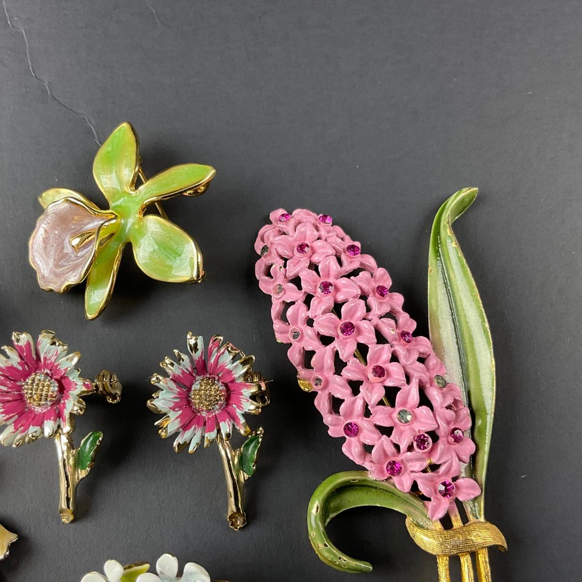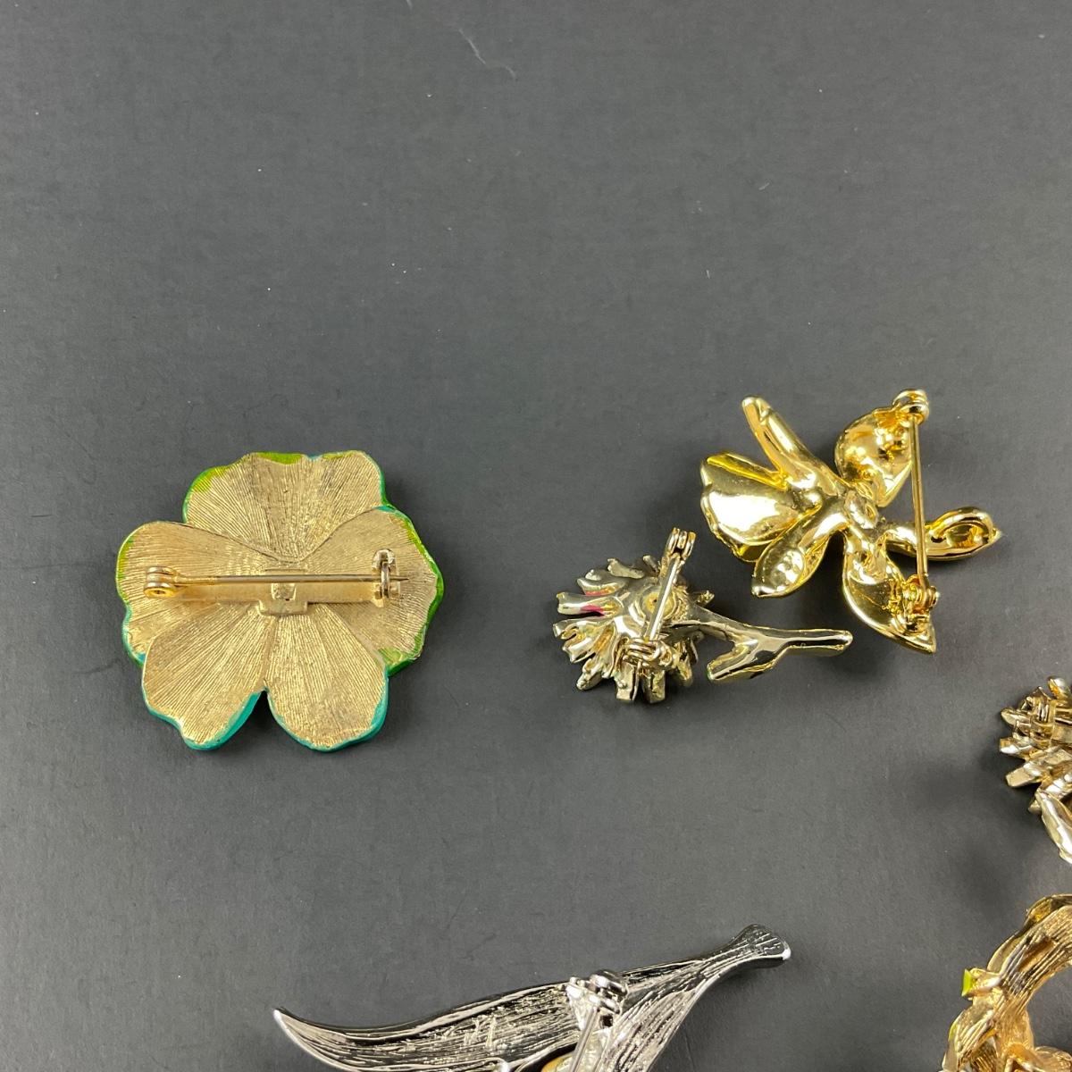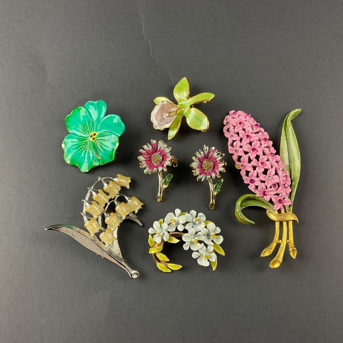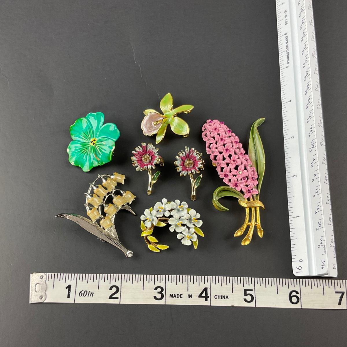 Seven miscellaneous multicolored flower pins some missing rhinestone pieces. A few marked pieces including LC, Art, Weiss. This piece does have some scuffs, scratches, marks, or slight damage, but otherwise appears to be in great shape. Please see photos for details and condition. Any condition statement is given as a courtesy to a client, is an opinion, and should not be treated as a statement of fact. Reference to condition written, oral or within a condition report shall not be regarded as a full account of condition and may not include all defects, alterations, or restorations. Absence of a condition report does not imply a lot is flawless or lacking imperfections or damage. Katherine’s Auction & Appraisal Service shall have no responsibility for any error or omission. Returns shall not be accepted on the basis of condition. ::: Shipping is available on this lot. If you require shipping you must let us know at the close of the auction. We will coordinate with you after the item has been won. Shipping fees will include insurance up to or exceeding the value of all items being mailed. If you have any questions regarding this lot please contact the auctioneer either via this website, by direct email or by phone. PICK UP TIMES and other important information can be found in the TERMS and DESCRIPTION of the auction. Please take a look for pertinent information. Thanks!