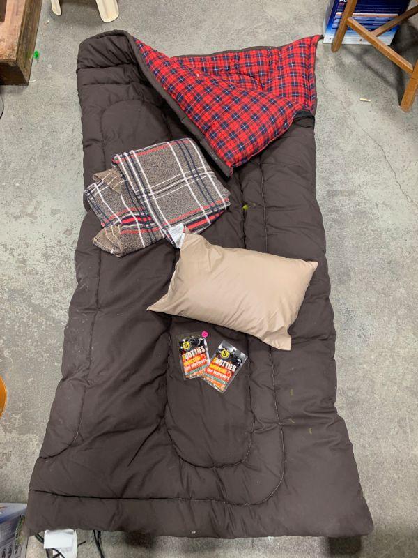 Pillow, flannel blanket and adhesive toe warmers included.