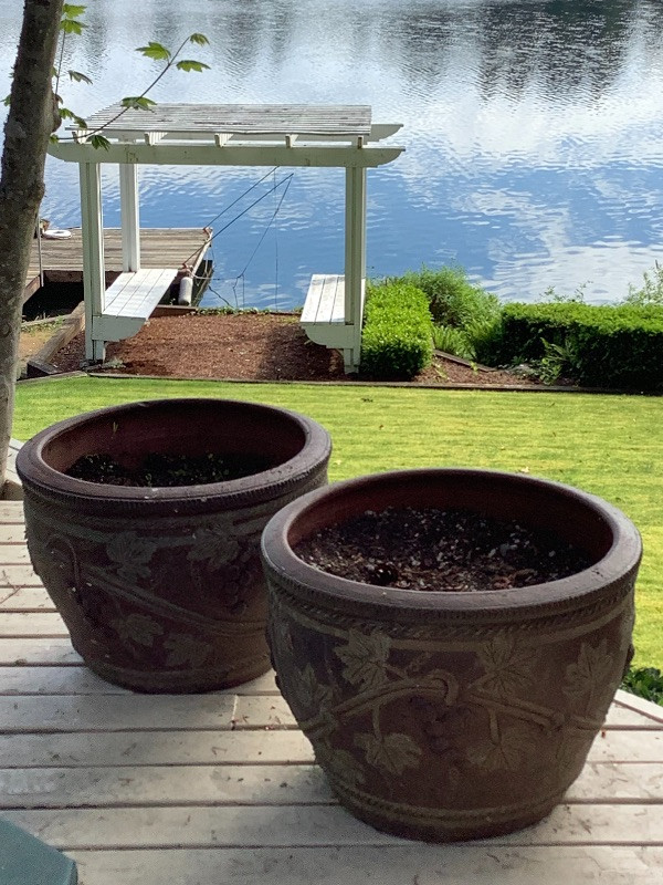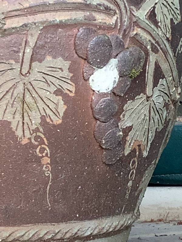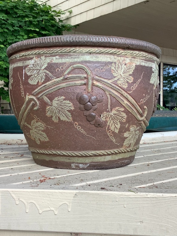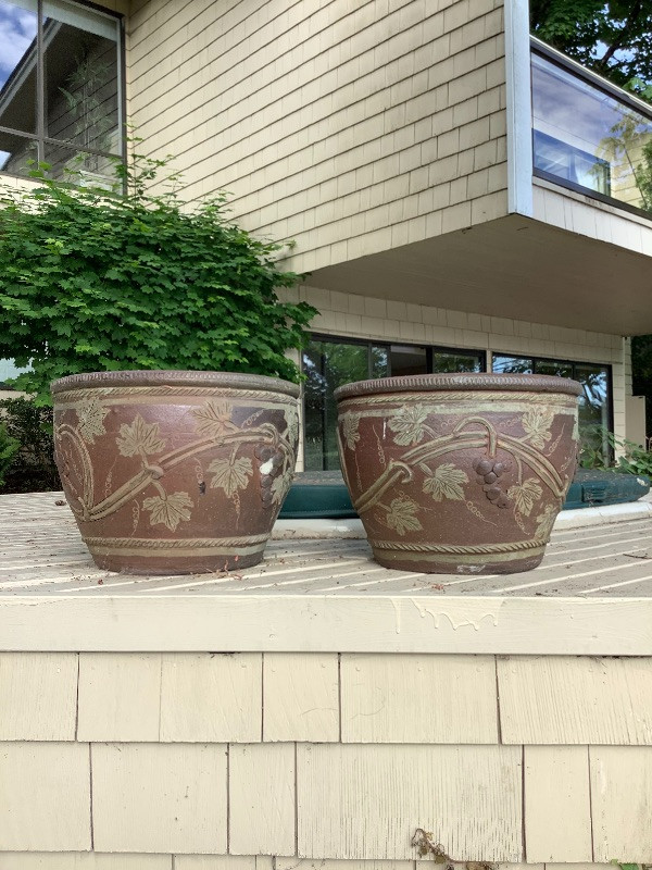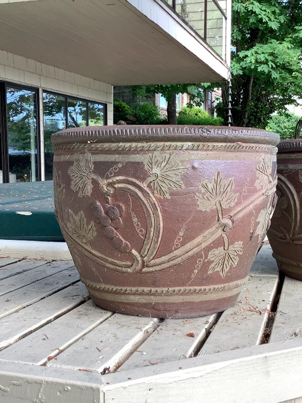Two large and heavy Terra Cotta planters with grape vine design. Planters show some wear as shown in pictures