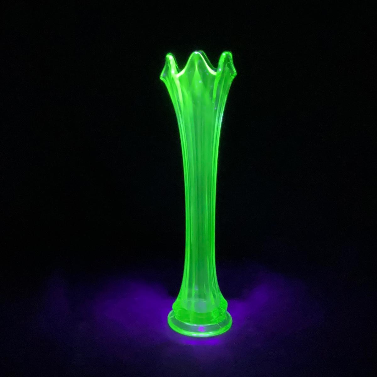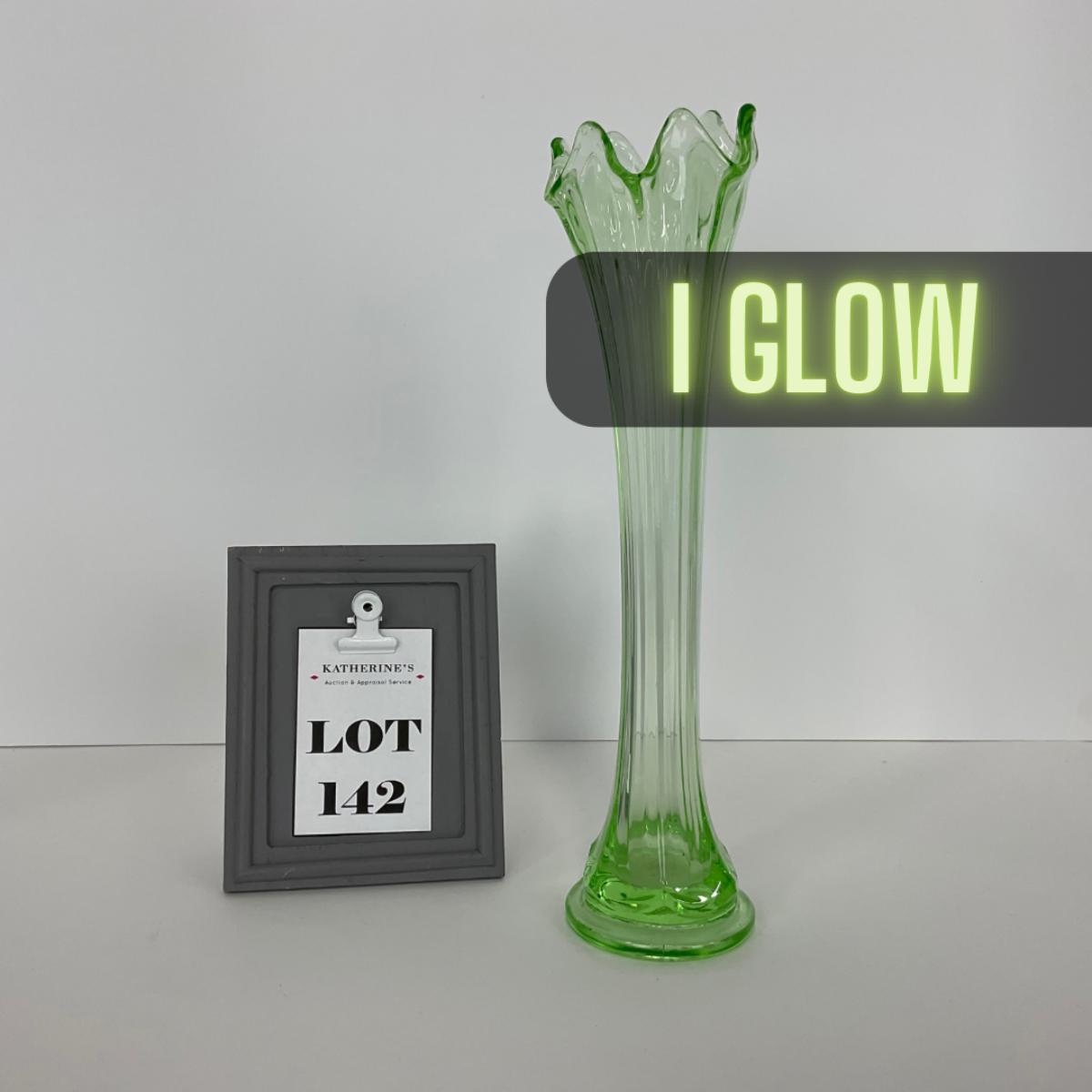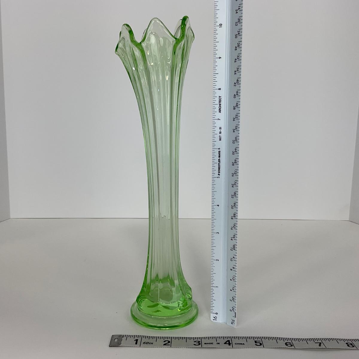 One green mid century modern stretch vase, worn. I am Uranium glass so I DO GLOW under blacklight. Please see photos for details and condition. ::: Shipping is available on this lot. If you require shipping you must let us know at the close of the auction. We will coordinate with you after the item has been won. Shipping fees will include insurance up to or exceeding the value of all items being mailed. If you have any questions regarding this lot please contact the auctioneer either via this website, by direct email or by phone. PICK UP TIMES and other important information can be found in the TERMS and DESCRIPTION of the auction. Please take a look for pertinent information. Thanks!