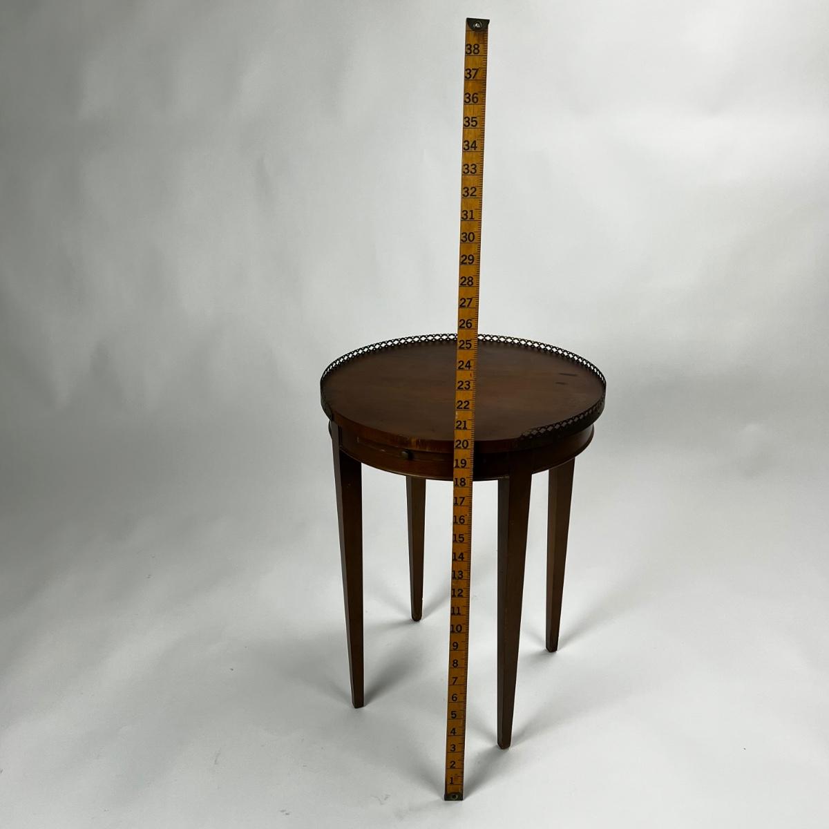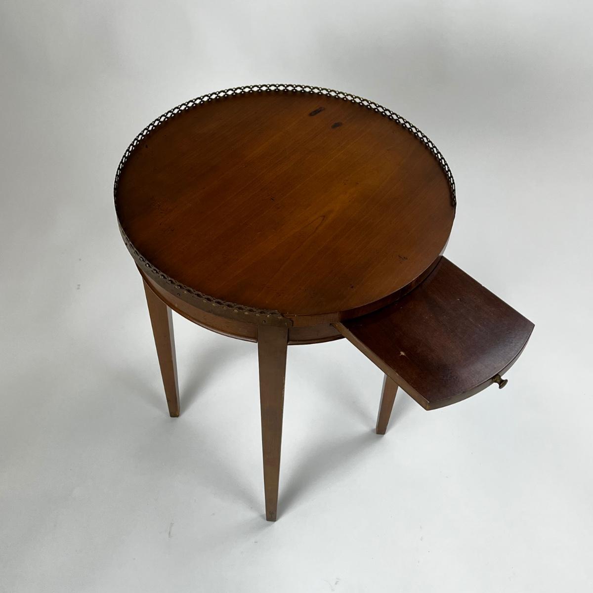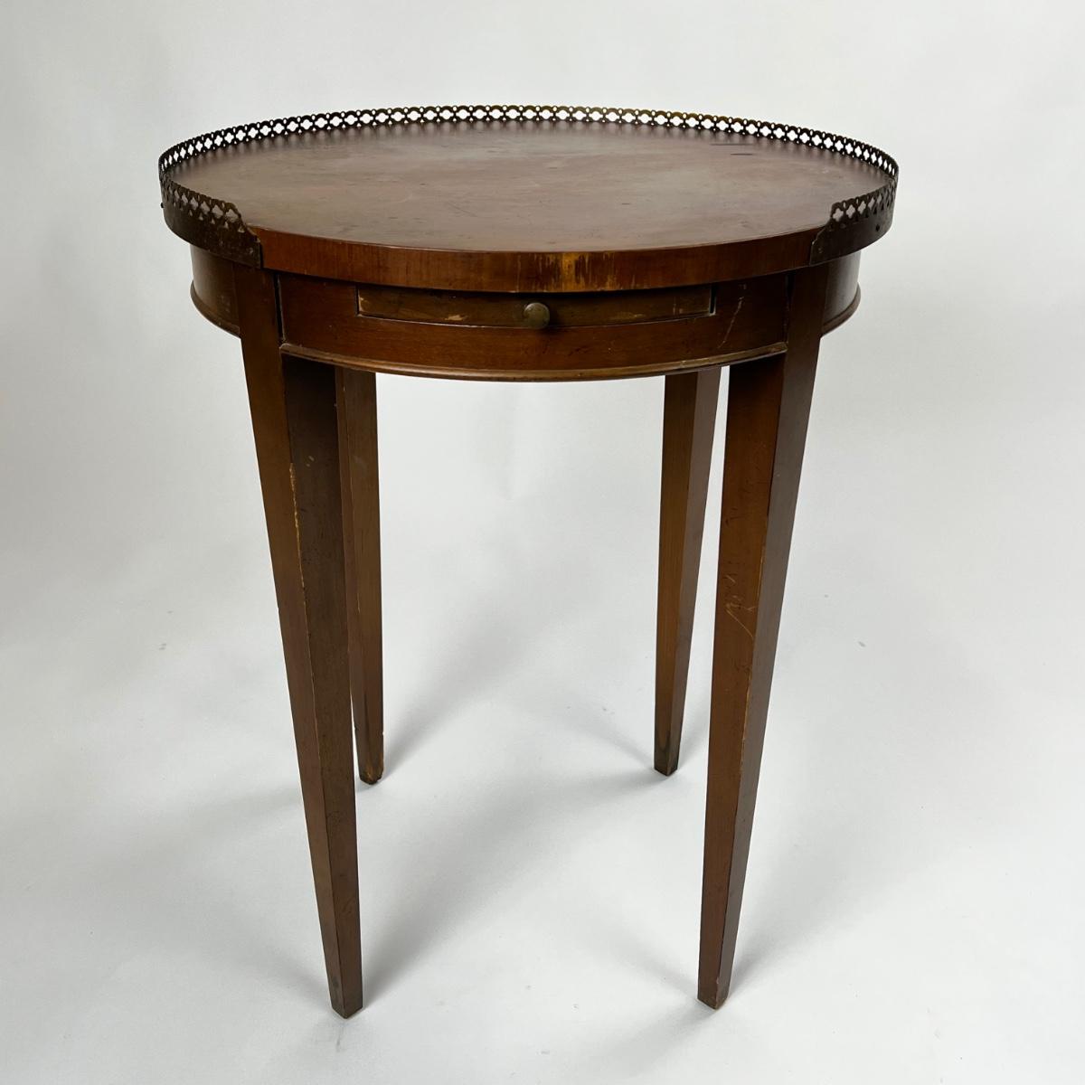 Antique Round Galley Top End Table. Table has one pull out shelf