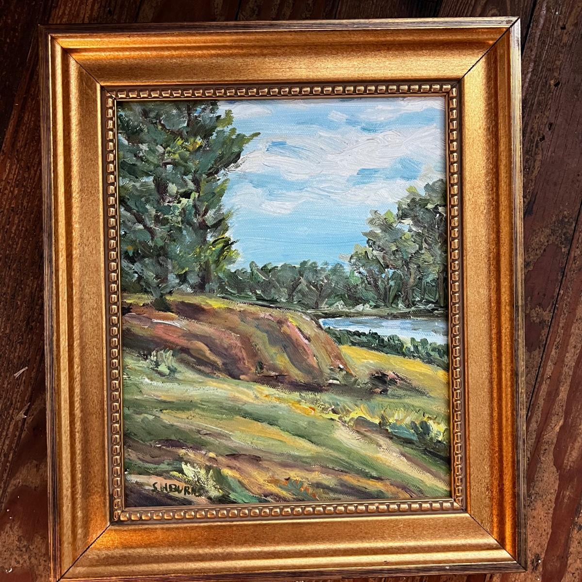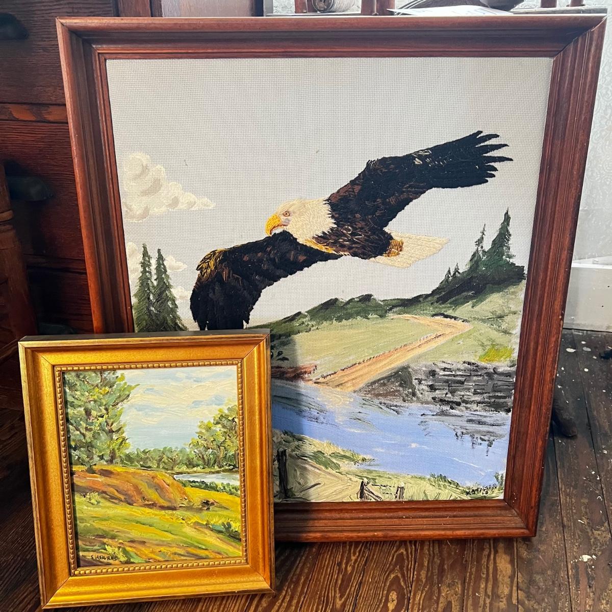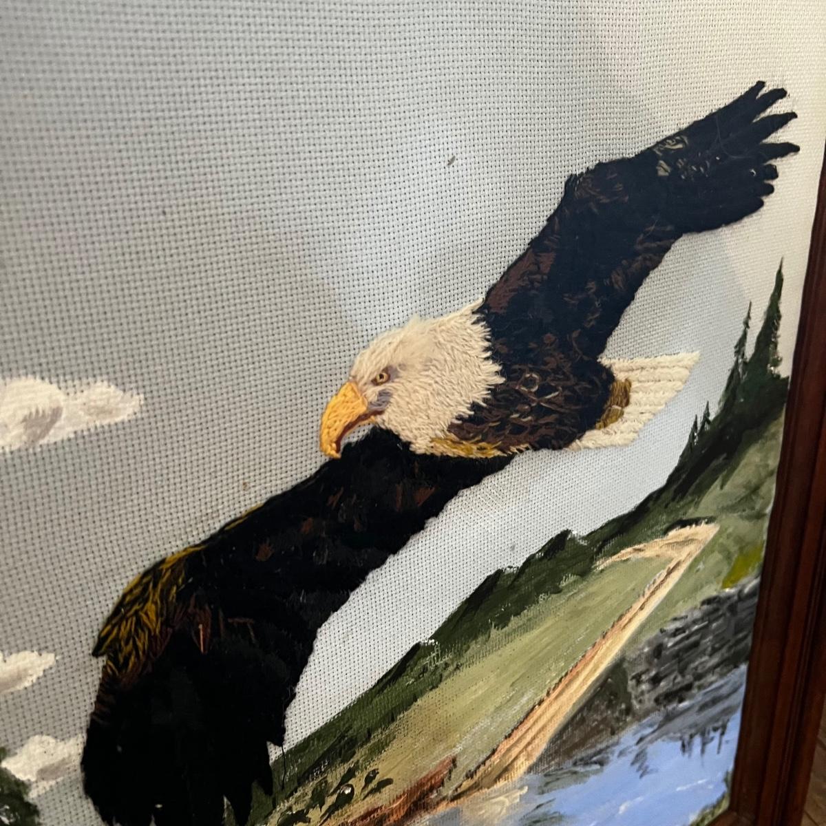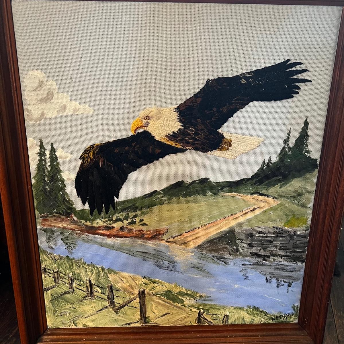1430 Needlepoint Eagle Framed Art with Oil Landscape Painting