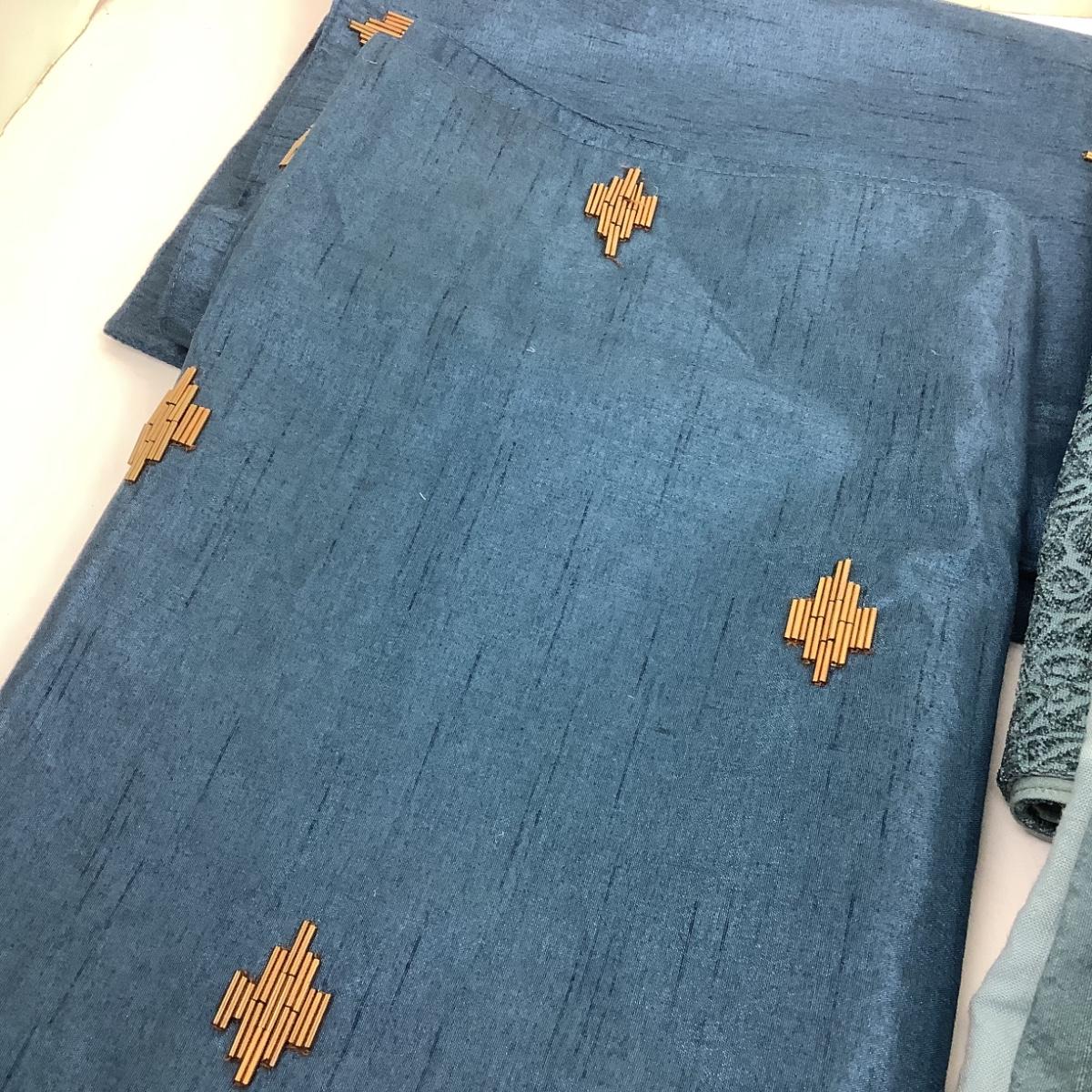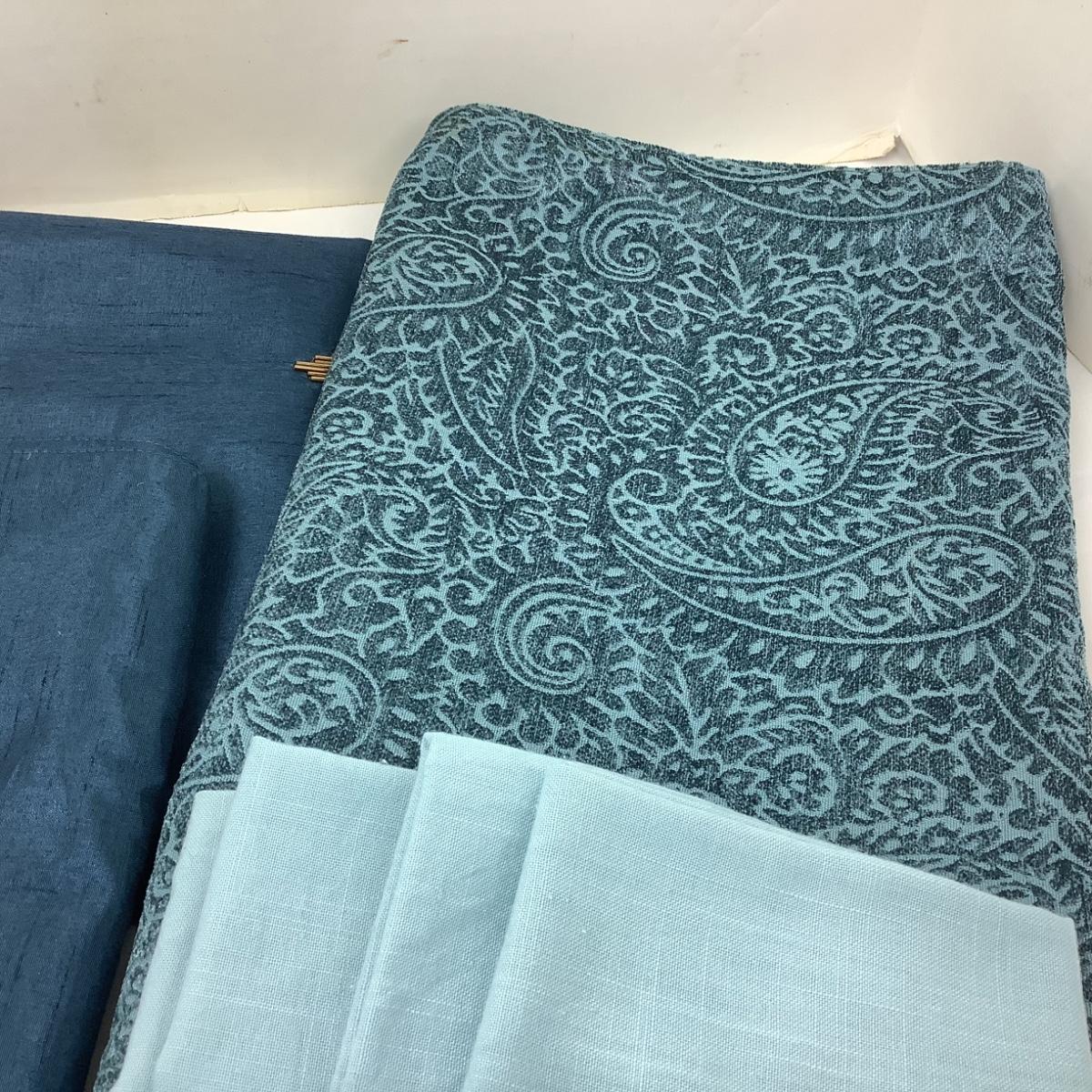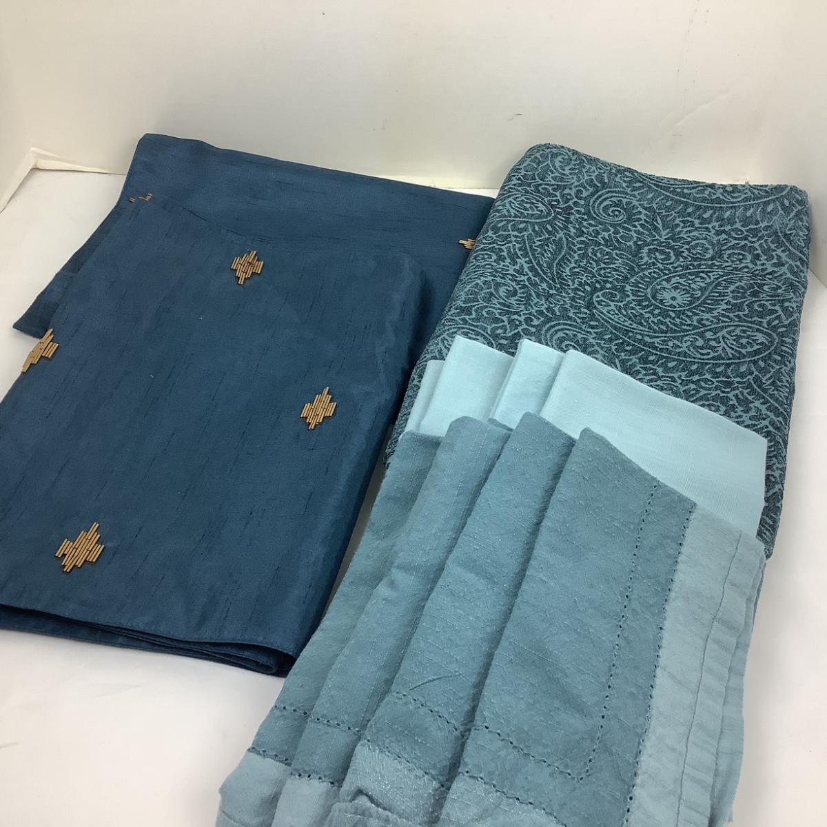 2 matching blue table runners with gold beading, 1 soft paisley runner, 2 sets of blue napkins.