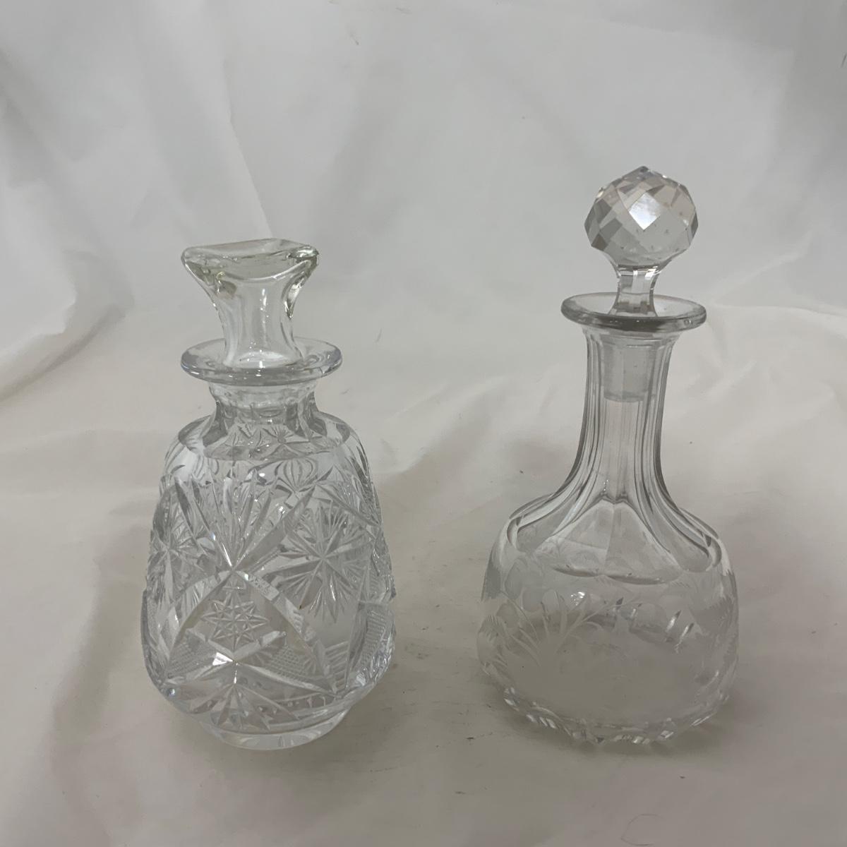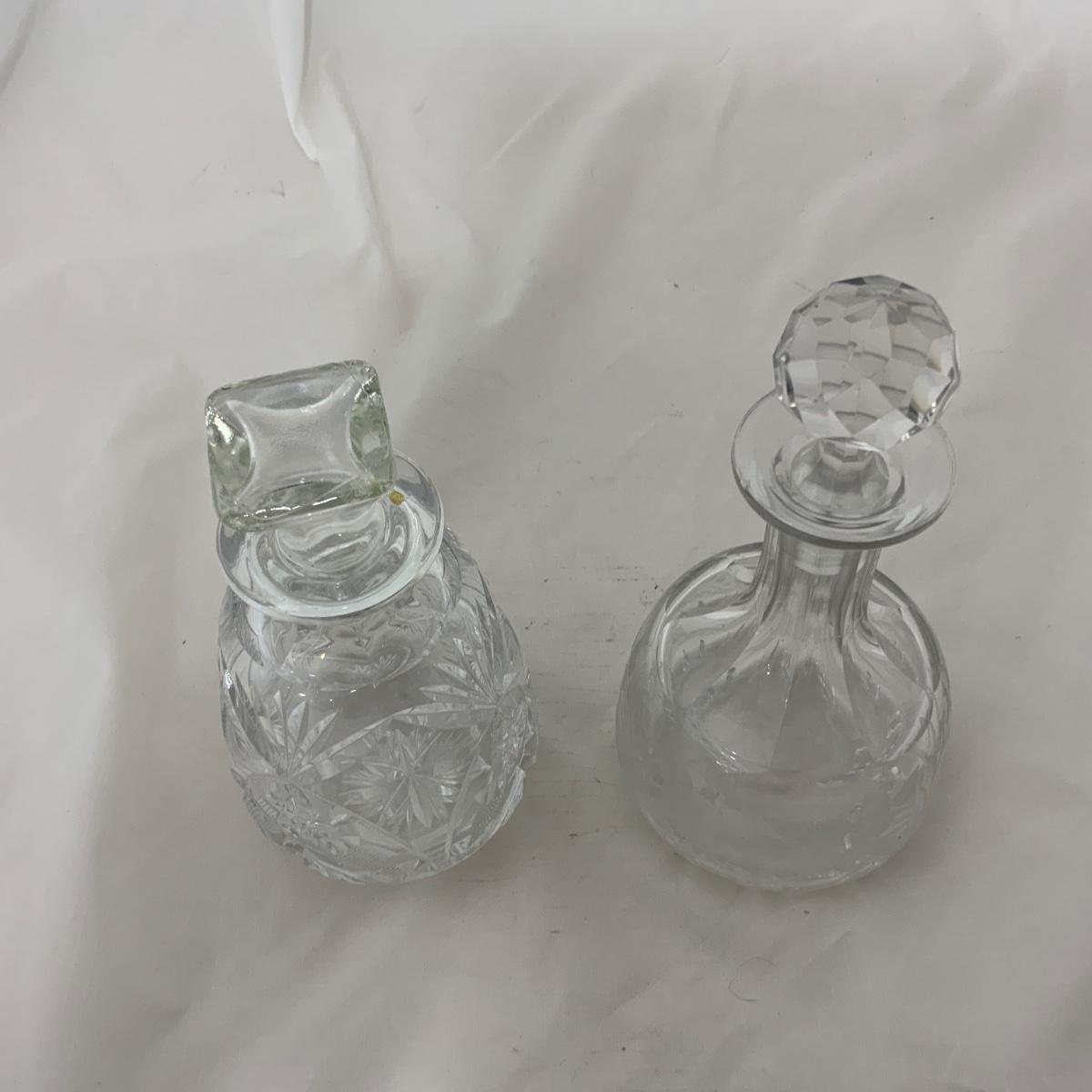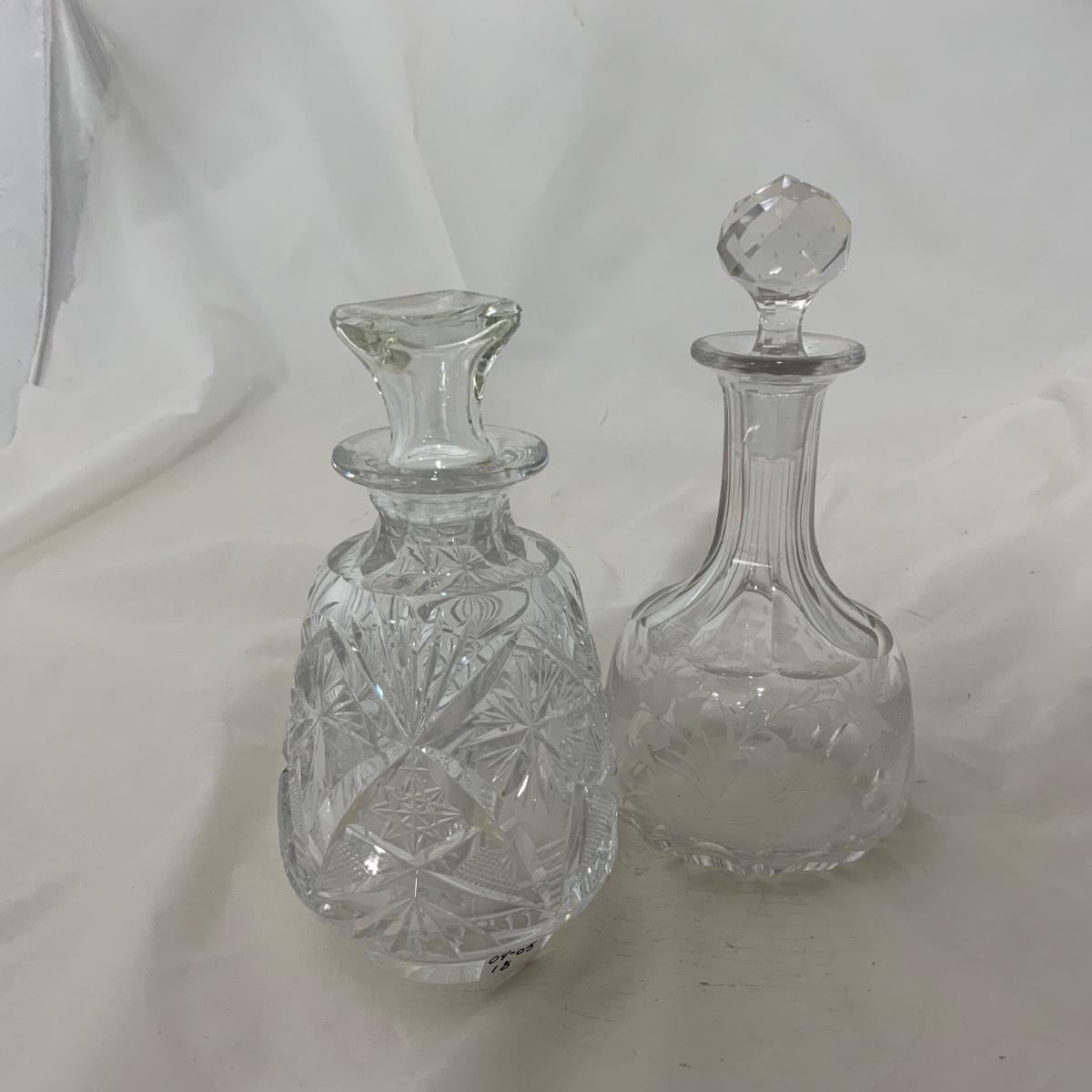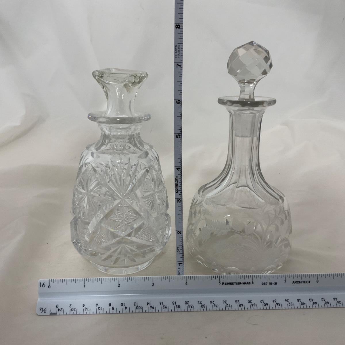 Two Cut Glass Cologne Bottles, both in exceptional condition. They would look stunning sitting on a dresser! The square stopper that is in the more rotund bottle is a replacement, newer stopper. Please see photos for details and condition. ::: Shipping is NOT available on this lot. If you have any questions regarding this lot please contact the auctioneer either via this website, by direct email or by phone. PICK UP TIMES and other important information can be found in the TERMS and DESCRIPTION of the auction. Please take a look for pertinent information. Thanks!