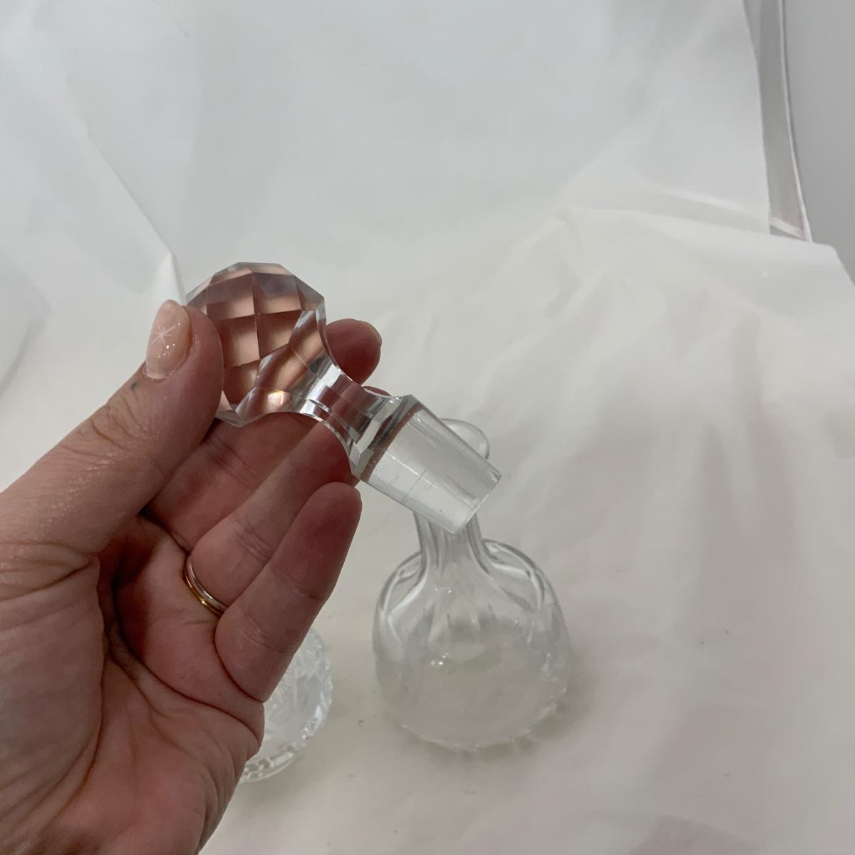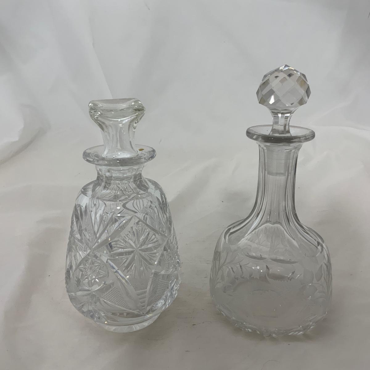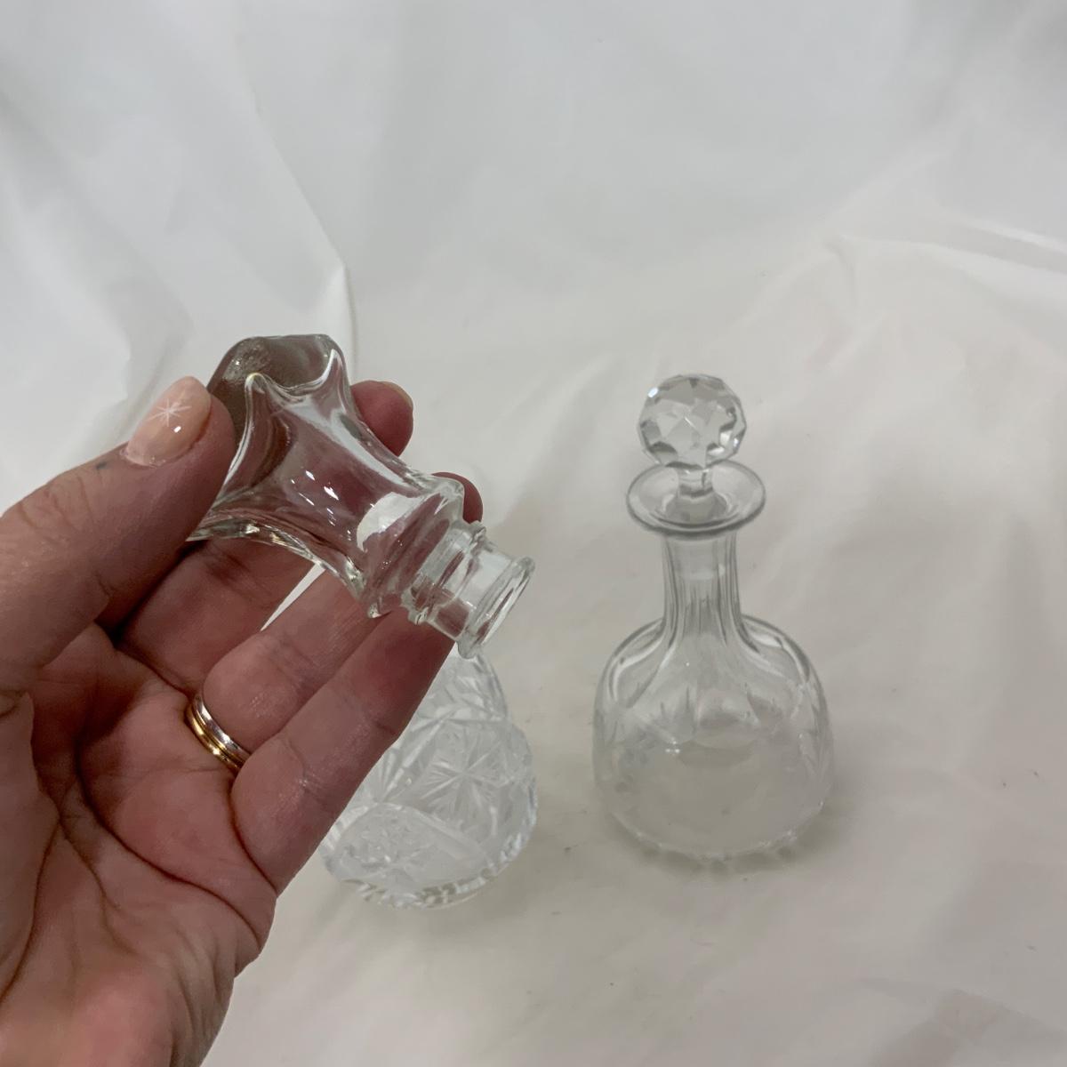 Two Cut Glass Cologne Bottles, both in exceptional condition. They would look stunning sitting on a dresser! The square stopper that is in the more rotund bottle is a replacement, newer stopper. Please see photos for details and condition. ::: Shipping is NOT available on this lot. If you have any questions regarding this lot please contact the auctioneer either via this website, by direct email or by phone. PICK UP TIMES and other important information can be found in the TERMS and DESCRIPTION of the auction. Please take a look for pertinent information. Thanks!