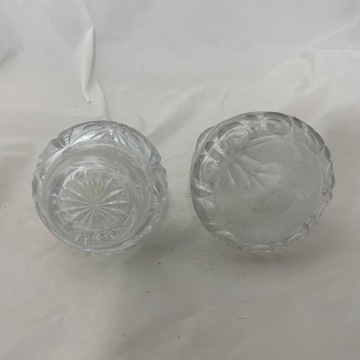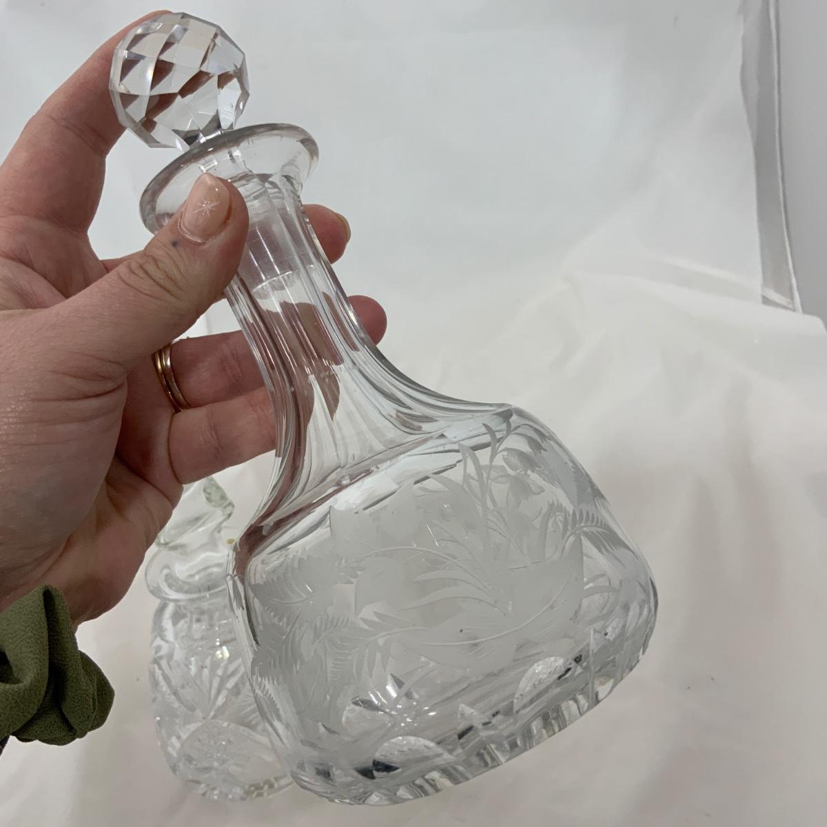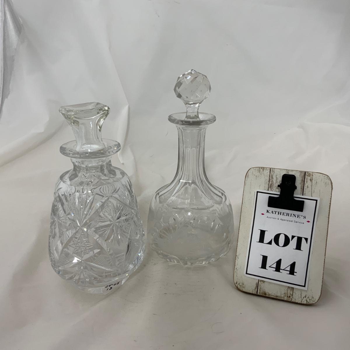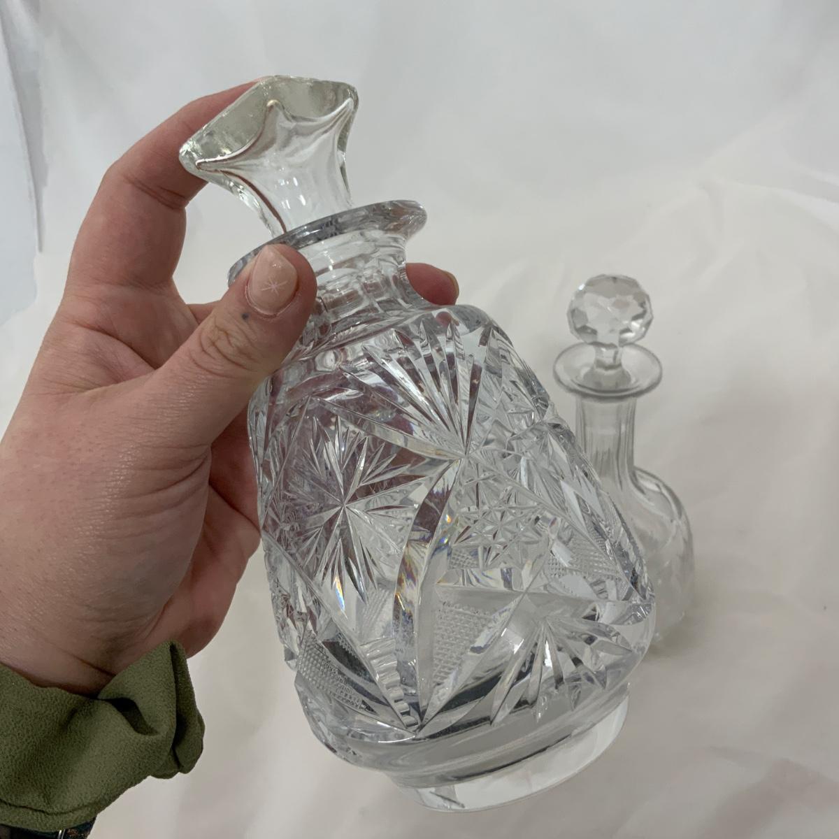 Two Cut Glass Cologne Bottles, both in exceptional condition. They would look stunning sitting on a dresser! The square stopper that is in the more rotund bottle is a replacement, newer stopper. Please see photos for details and condition. ::: Shipping is NOT available on this lot. If you have any questions regarding this lot please contact the auctioneer either via this website, by direct email or by phone. PICK UP TIMES and other important information can be found in the TERMS and DESCRIPTION of the auction. Please take a look for pertinent information. Thanks!