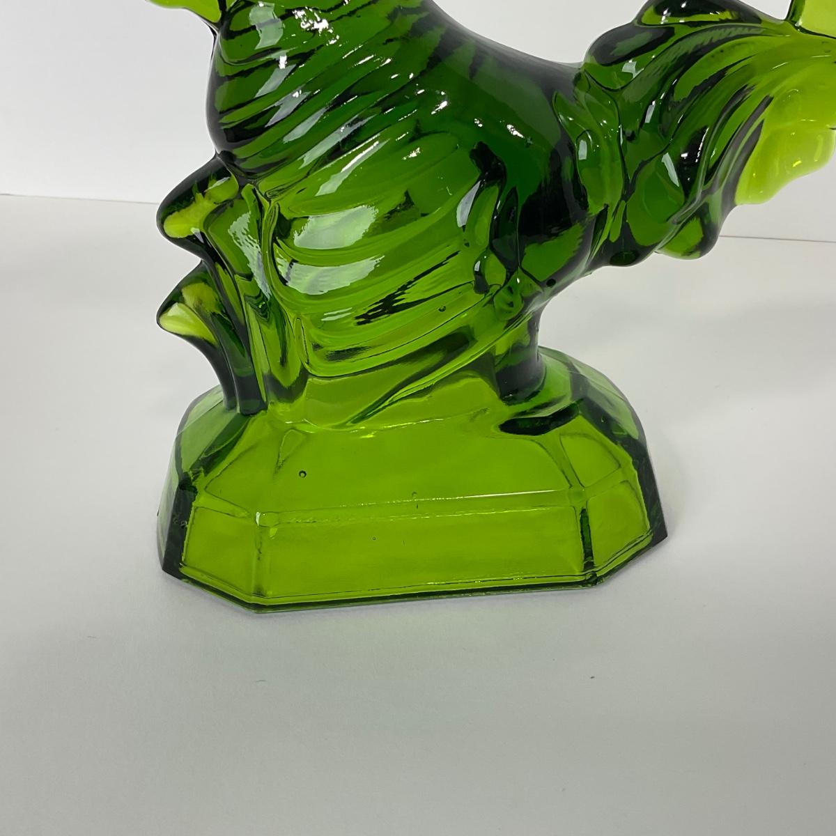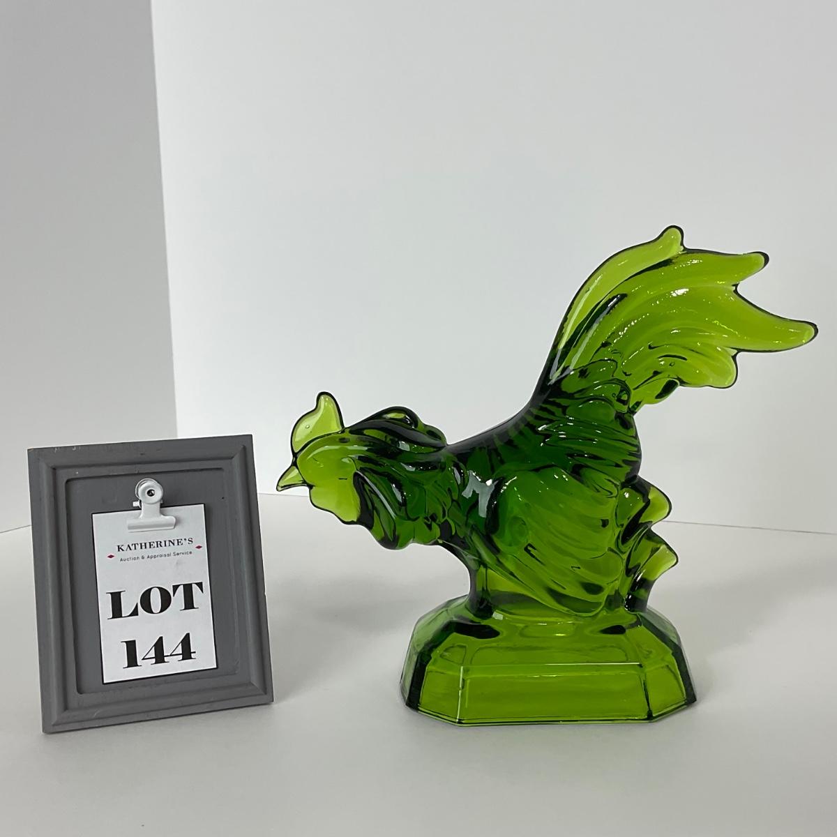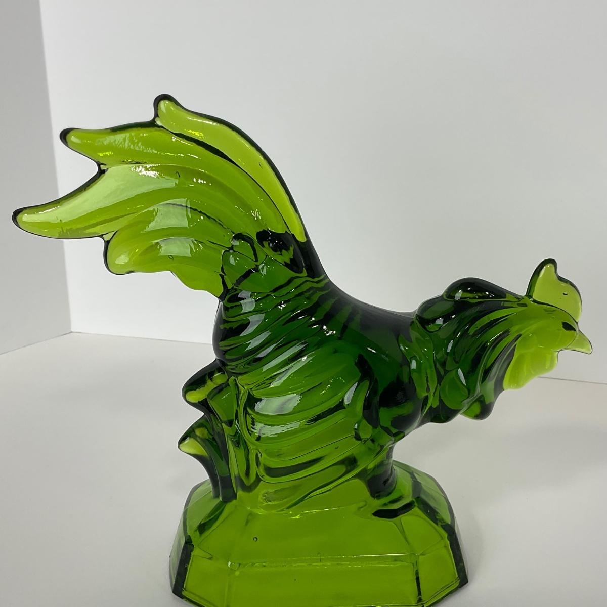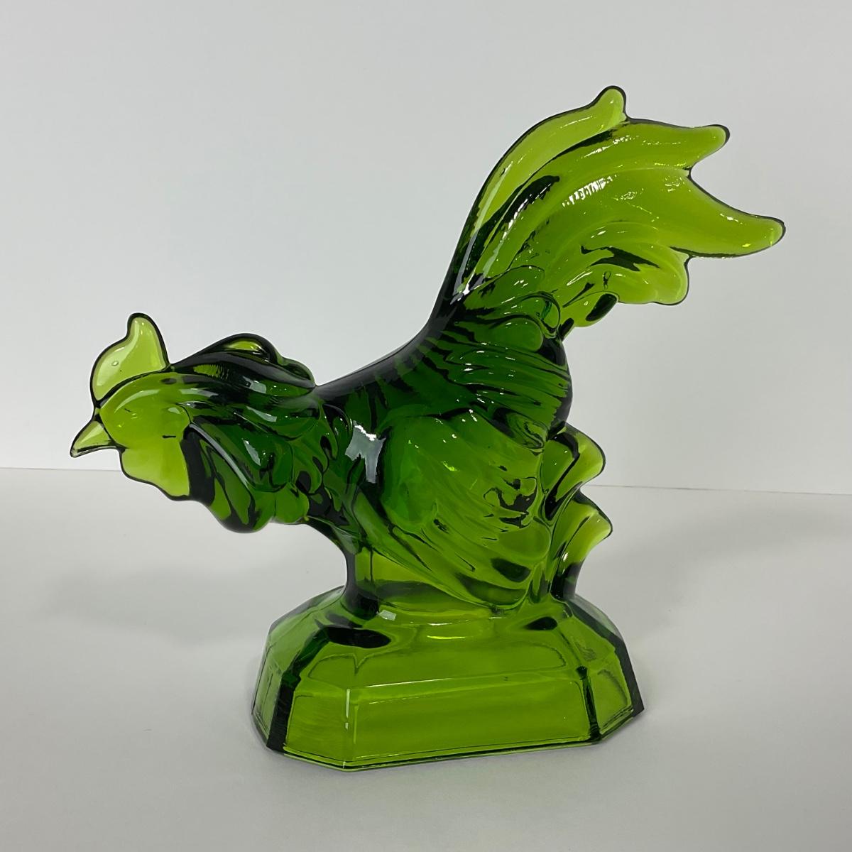 One green LE Smith glass rooster This piece has no damage, and appears to be in great shape with no visable chips, cracks, or broken pieces. 8 1/2 inches tall by 10 inches wide. Please see photos for details and condition. Any condition statement is given as a courtesy to a client, is an opinion, and should not be treated as a statement of fact. Reference to condition written, oral or within a condition report shall not be regarded as a full account of condition and may not include all defects, alterations, or restorations. Absence of a condition report does not imply a lot is flawless or lacking imperfections or damage. Katherine’s Auction & Appraisal Service shall have no responsibility for any error or omission. Returns shall not be accepted on the basis of condition. ::: Shipping is available on this lot. If you require shipping you must let us know at the close of the auction. We will coordinate with you after the item has been won. Shipping fees will include insurance up to or exceeding the value of all items being mailed. If you have any questions regarding this lot please contact the auctioneer either via this website, by direct email or by phone. PICK UP TIMES and other important information can be found in the TERMS and DESCRIPTION of the auction. Please take a look for pertinent information. Thanks!