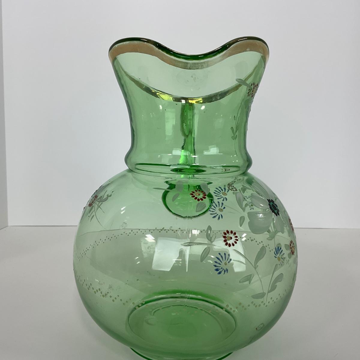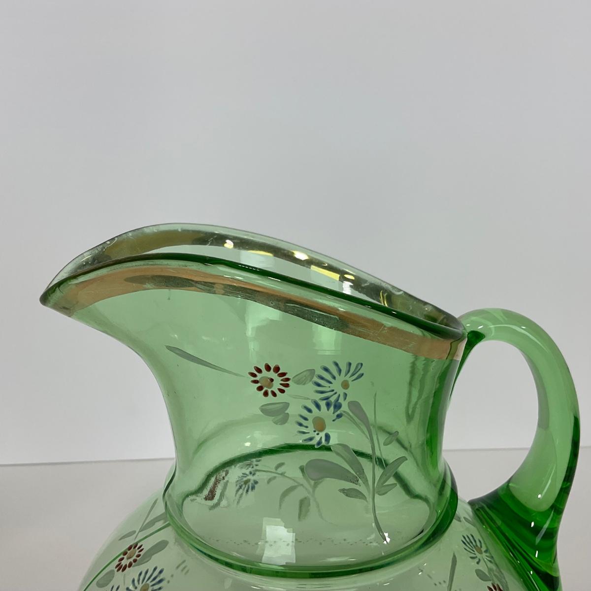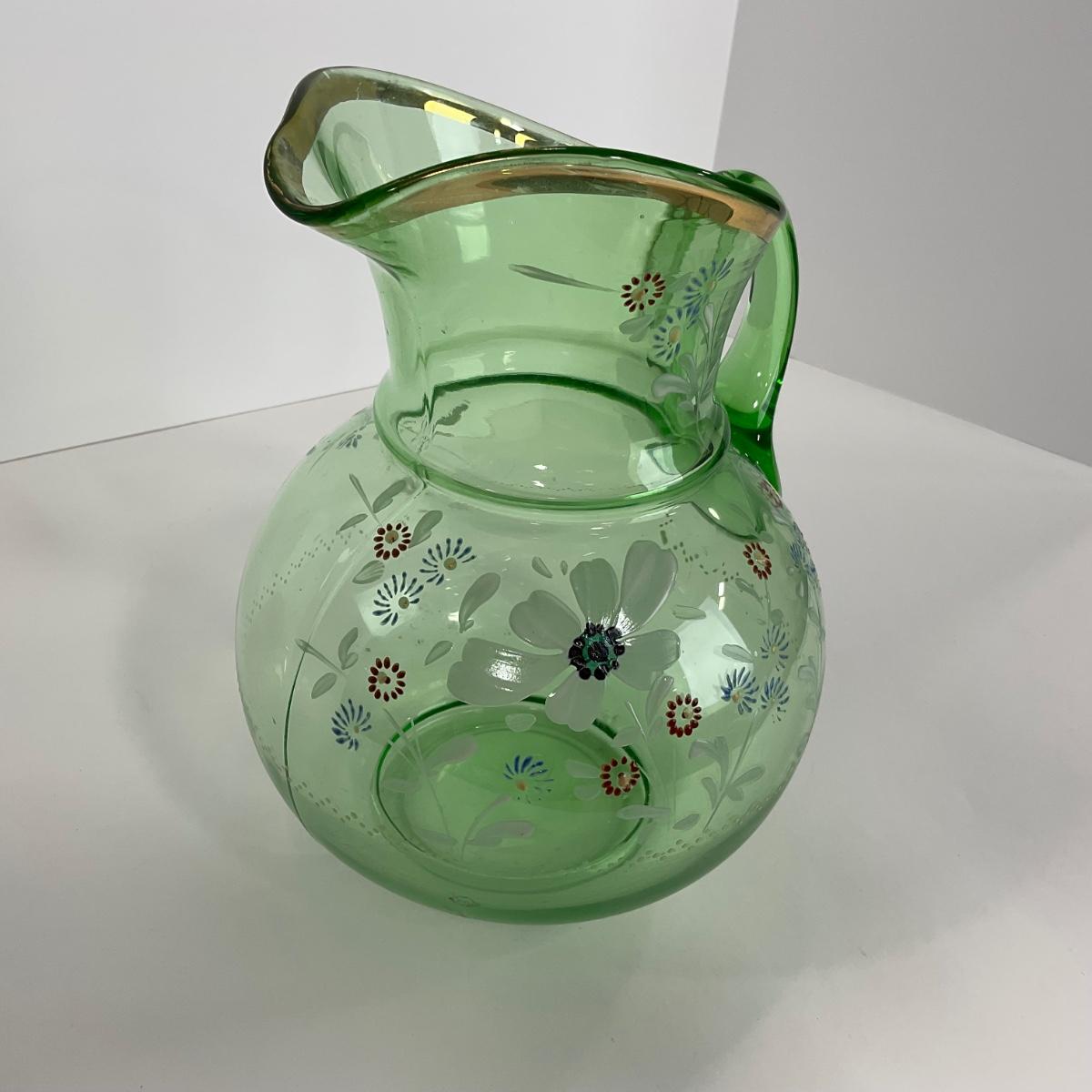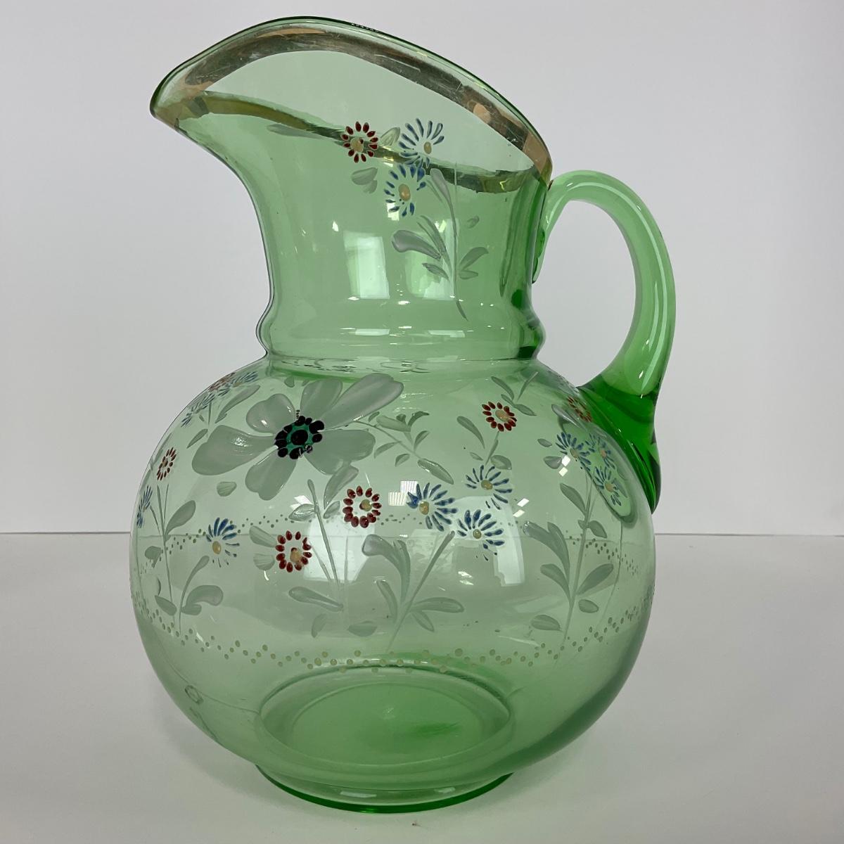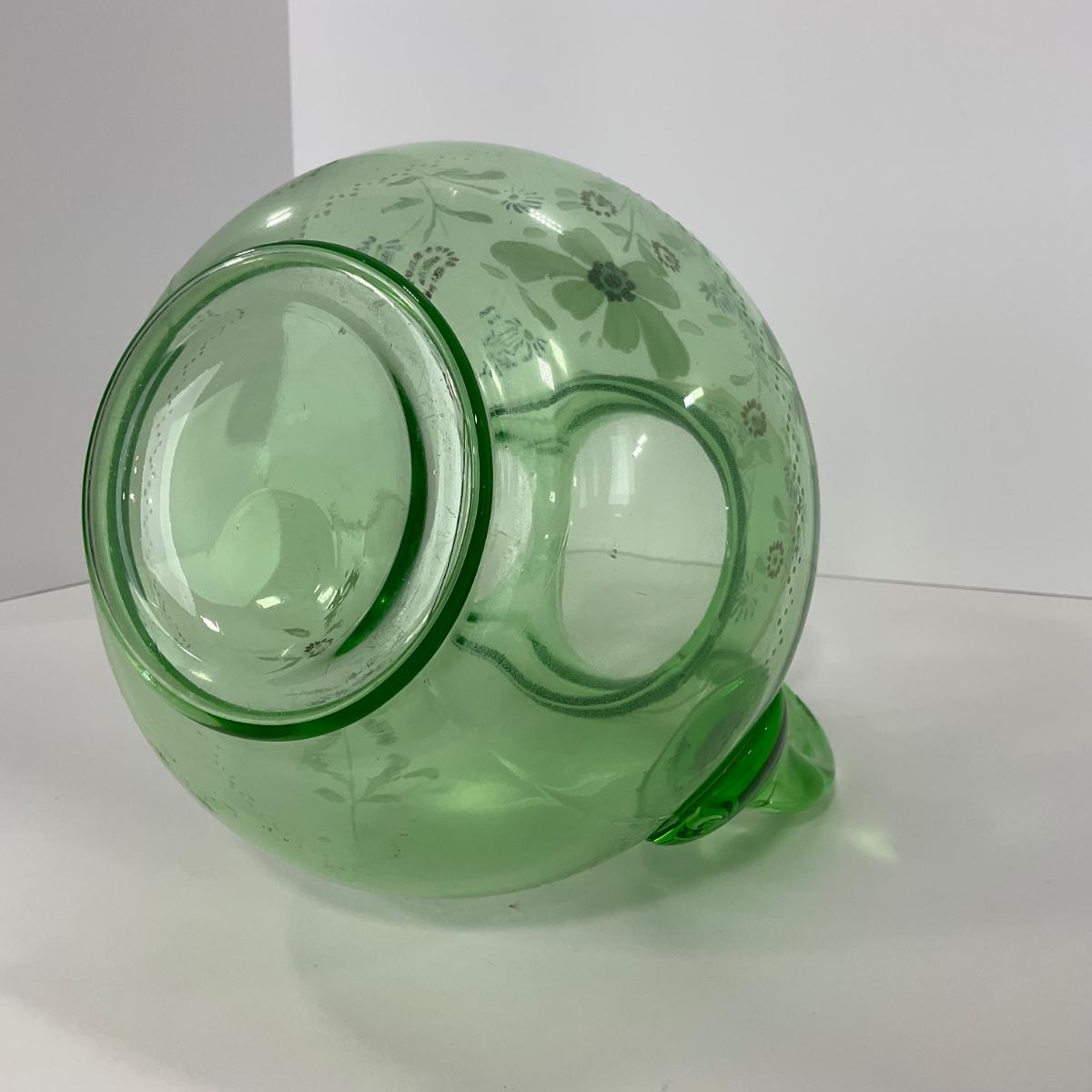 -144- URANIUM | Green Depression Hand Painted Flowers Pitcher