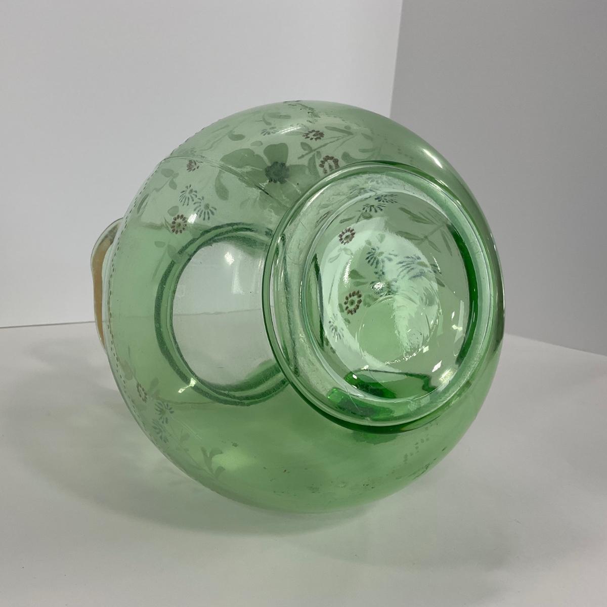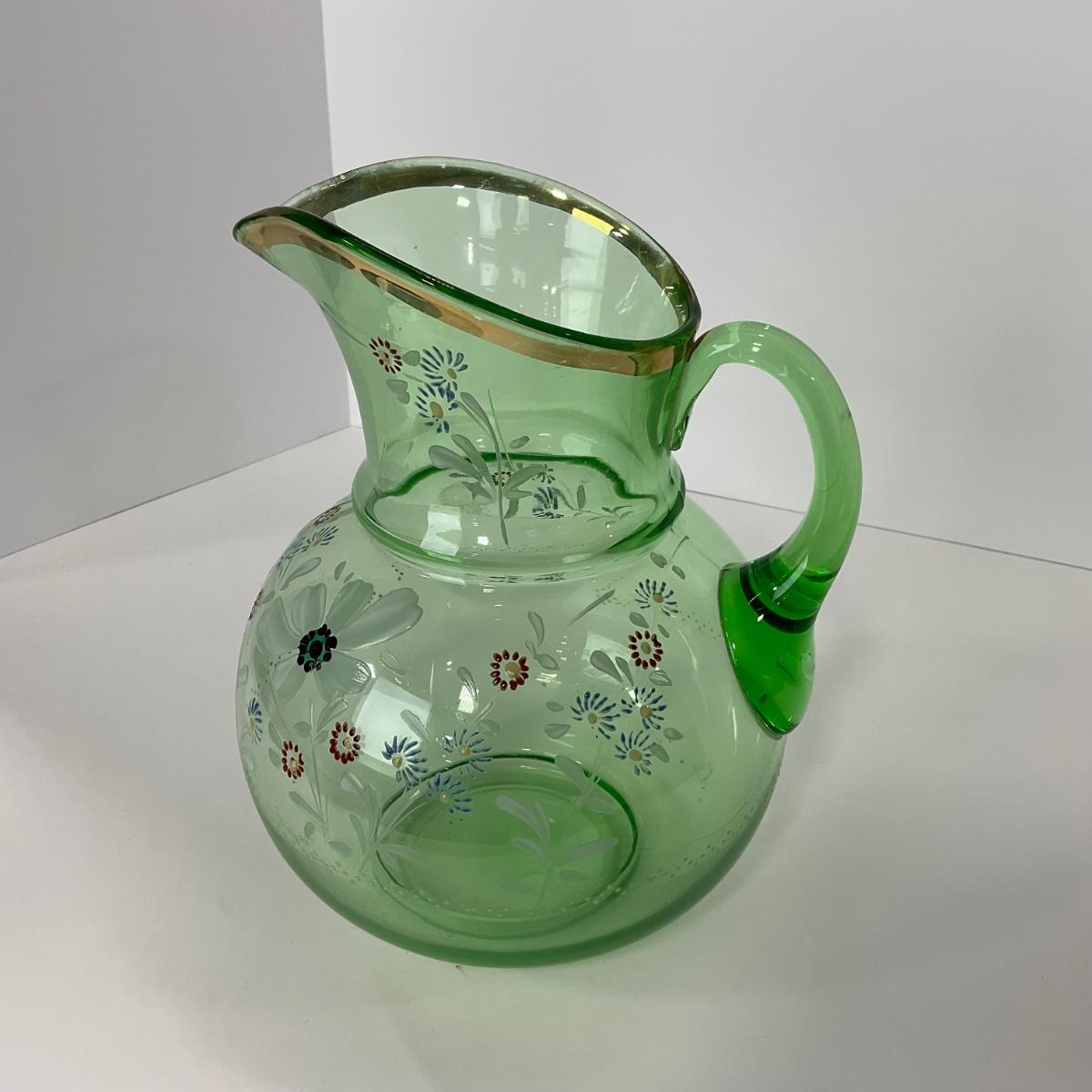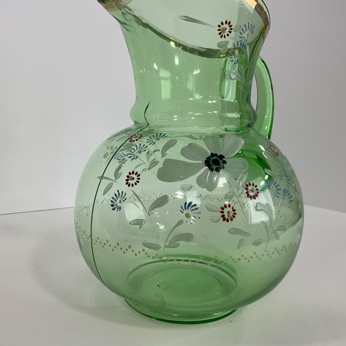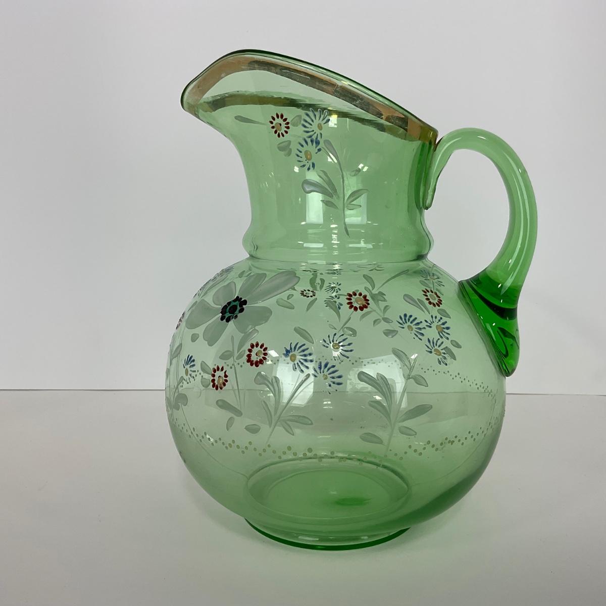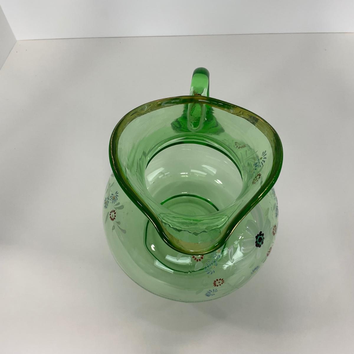 -144- URANIUM | Green Depression Hand Painted Flowers Pitcher
