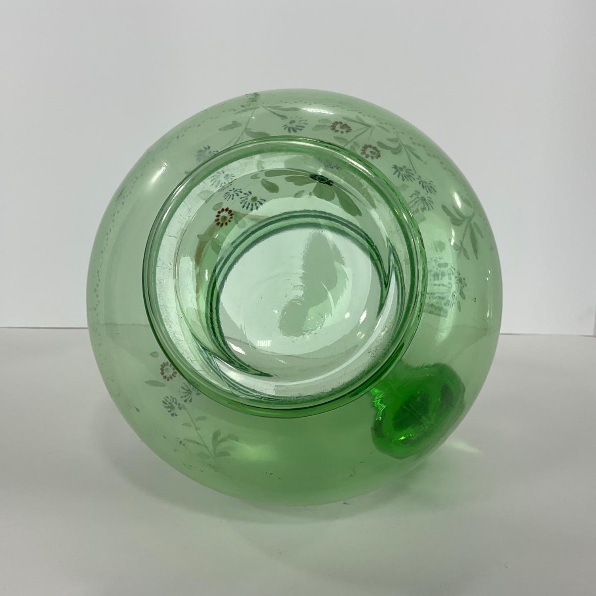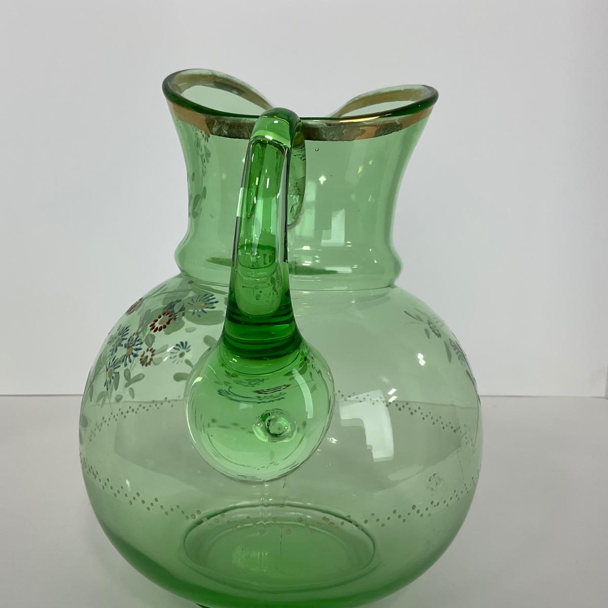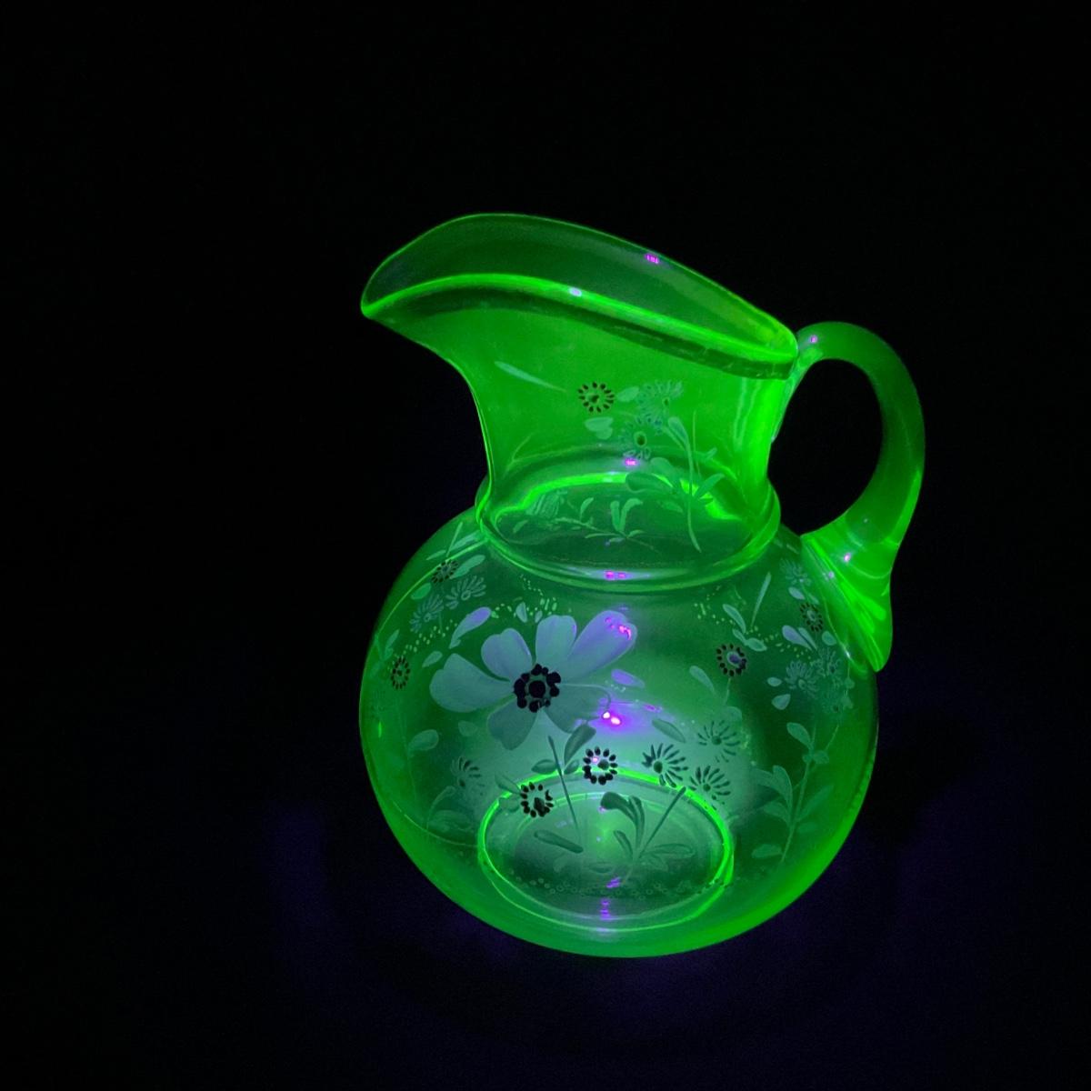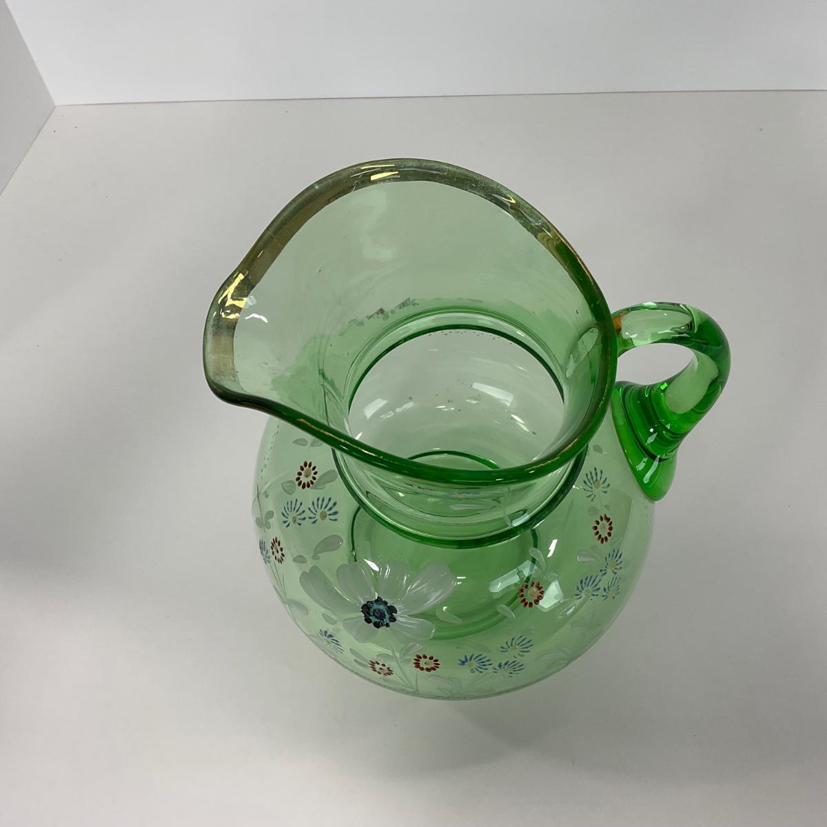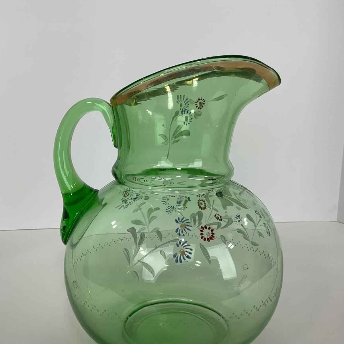 -144- URANIUM | Green Depression Hand Painted Flowers Pitcher