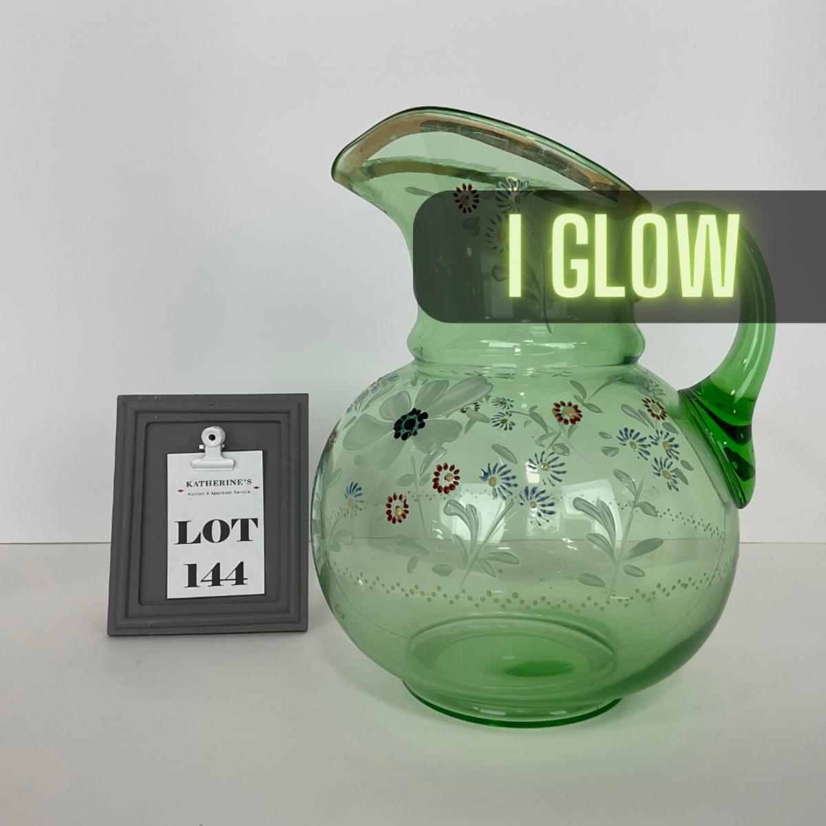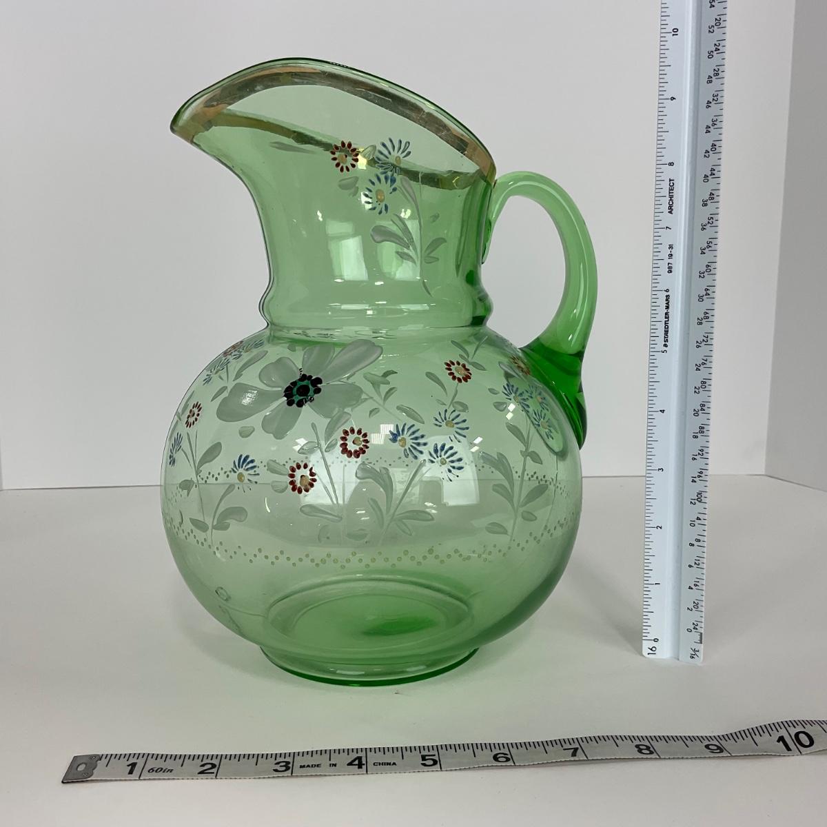 One vintage green depression pitcher with hand painted flowers. I am Uranium glass so I DO GLOW under blacklight. Please see photos for details and condition. ::: Shipping is available on this lot. If you require shipping you must let us know at the close of the auction. We will coordinate with you after the item has been won. Shipping fees will include insurance up to or exceeding the value of all items being mailed. If you have any questions regarding this lot please contact the auctioneer either via this website, by direct email or by phone. PICK UP TIMES and other important information can be found in the TERMS and DESCRIPTION of the auction. Please take a look for pertinent information. Thanks!