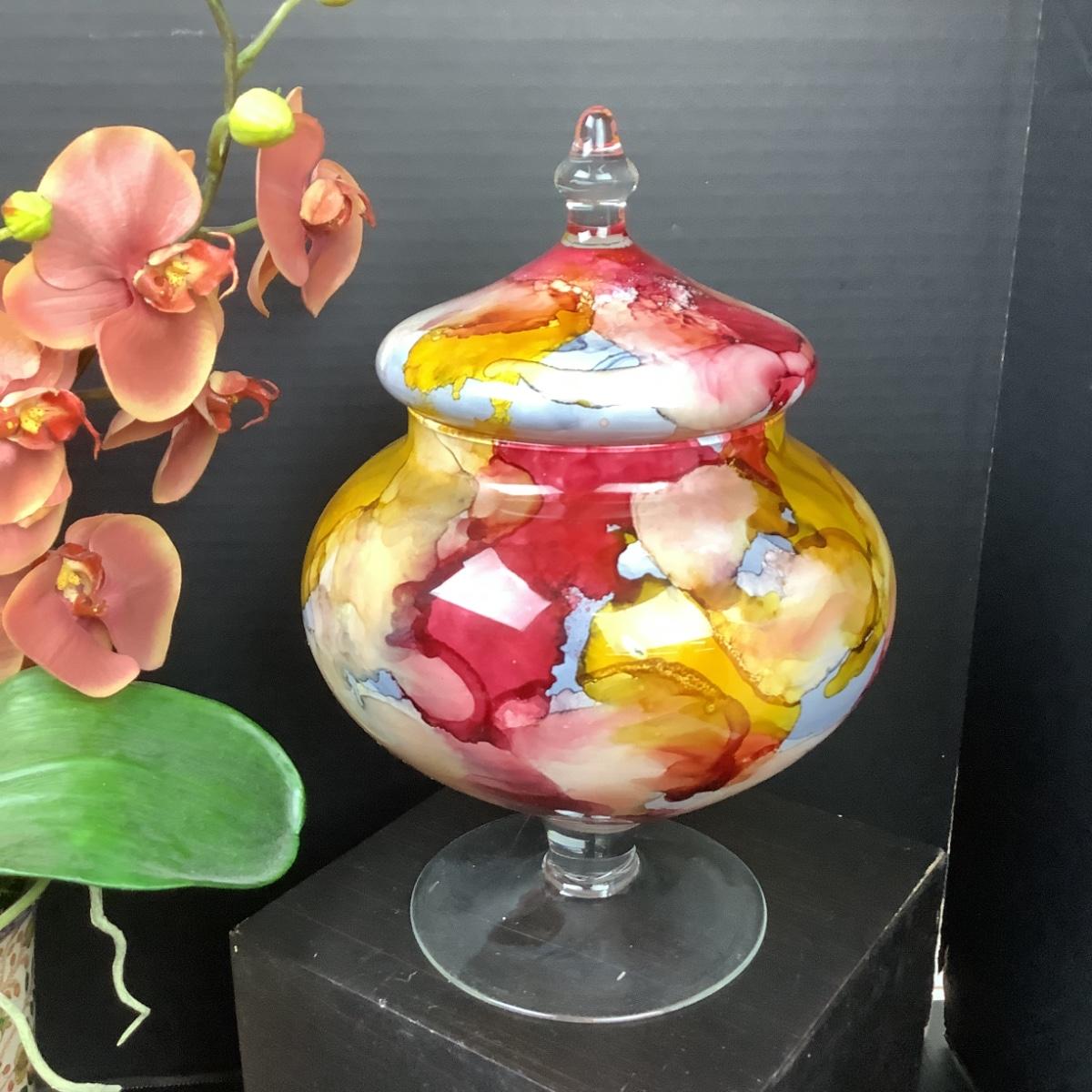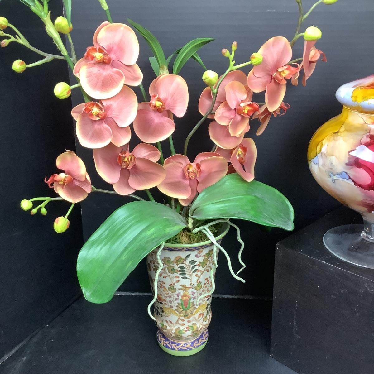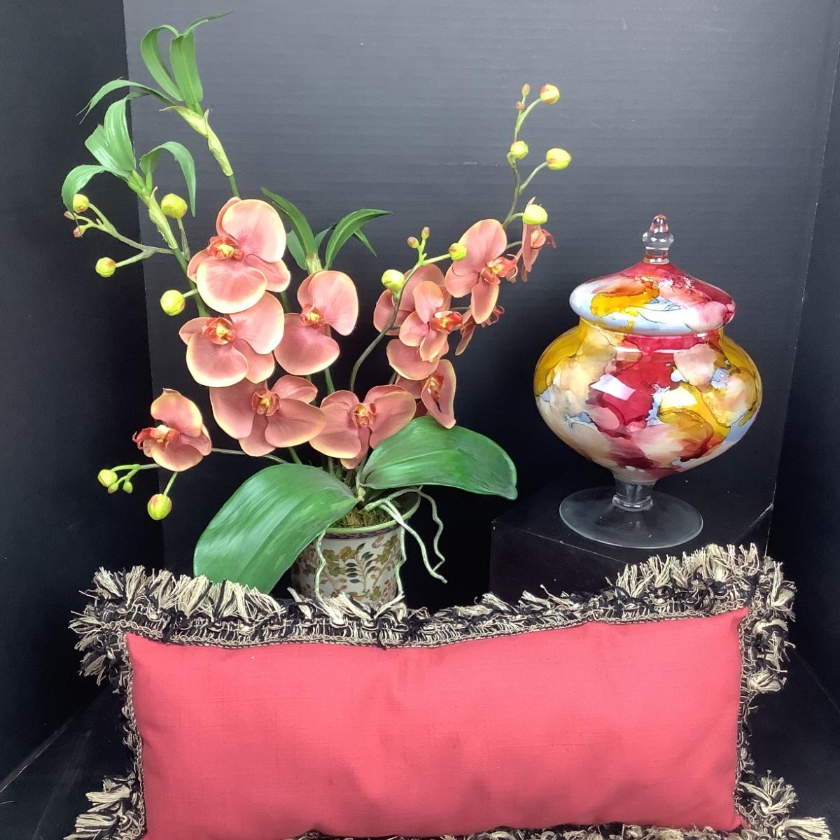 Faux Orchid in detailed vase that is 20" tall, custom lumbar pillow 21" x 8" and decorative glass jar with lid that is 10" x 6".