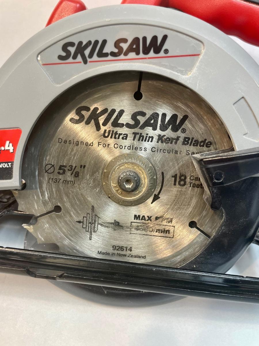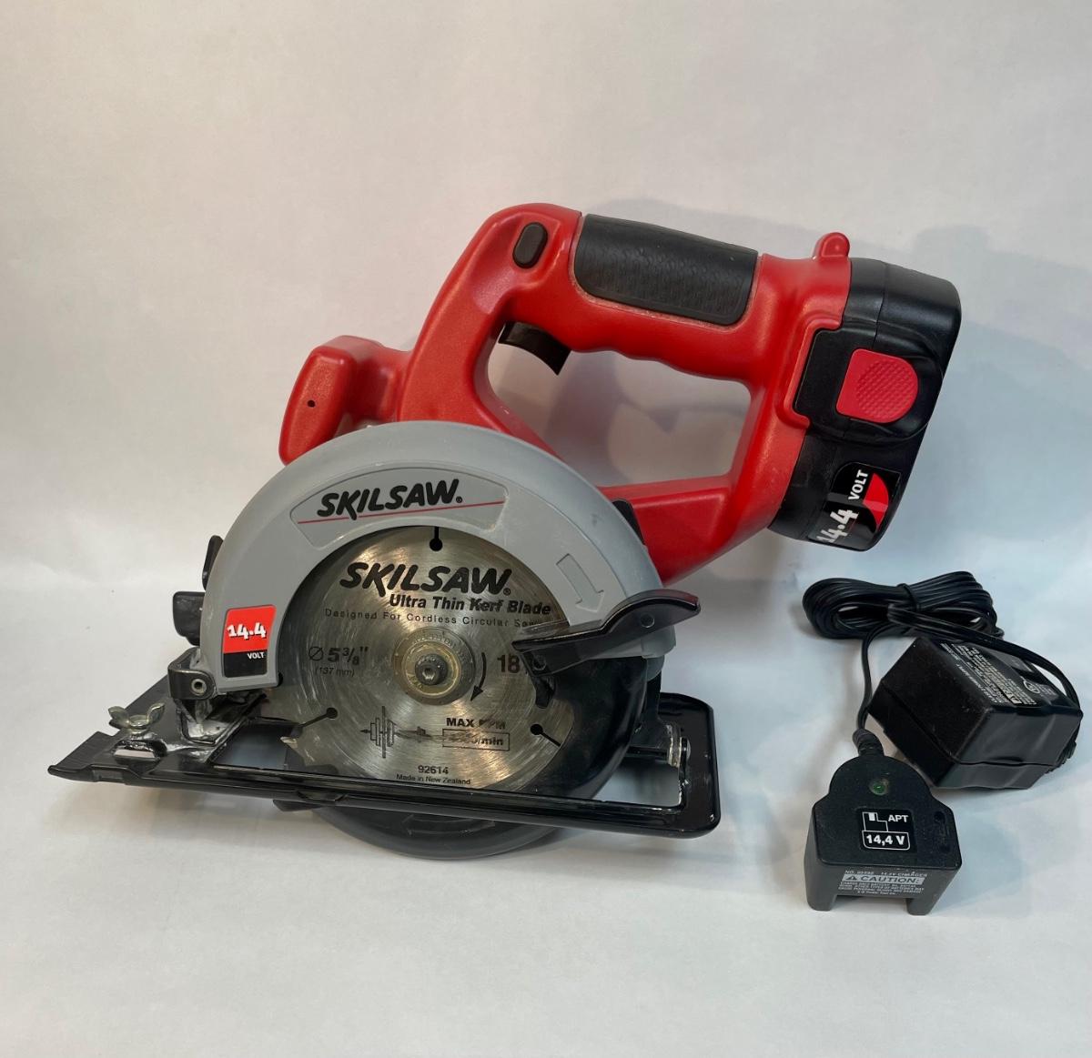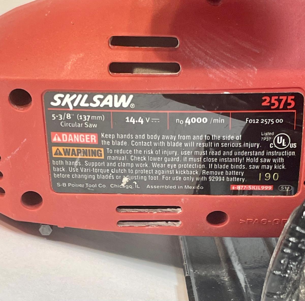 Saw is in very good used condition. Uses a 5 3/8" blade.. Model 2575. Works well. NOTE: battery charger unit is heat-damaged, does not work. This can be replaced, or the battery can be charged in a compatible Skil 14.4v charger.
