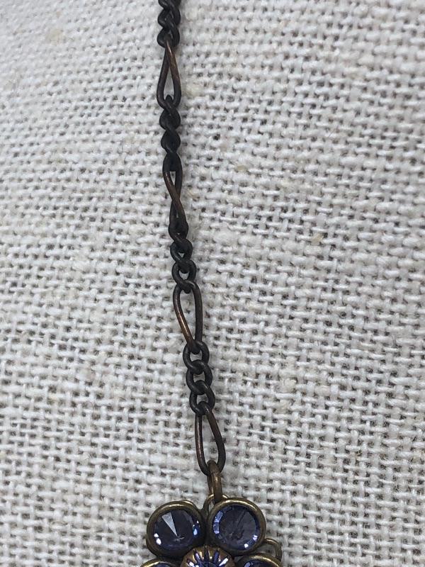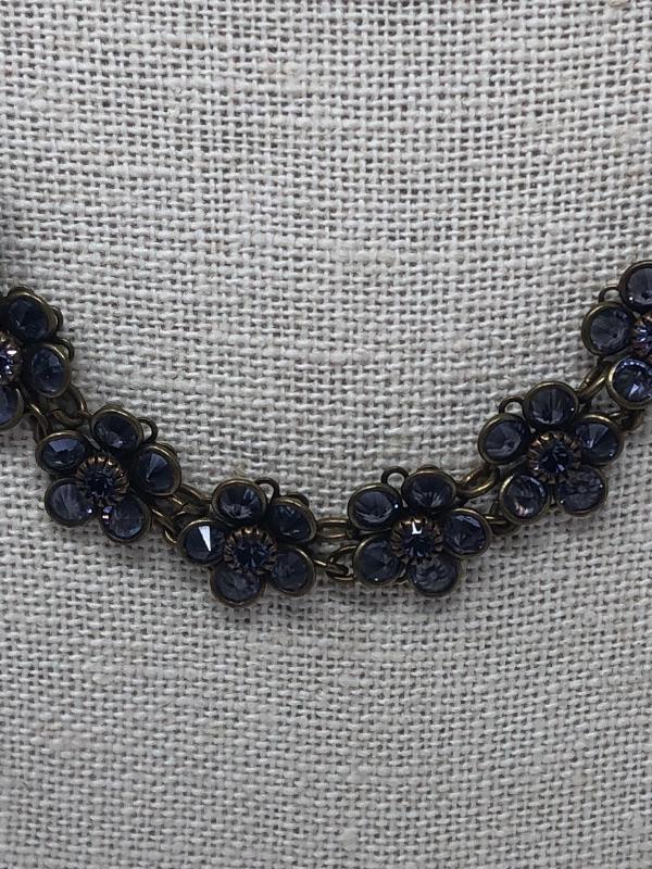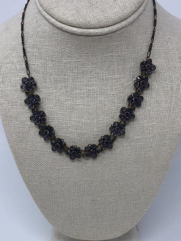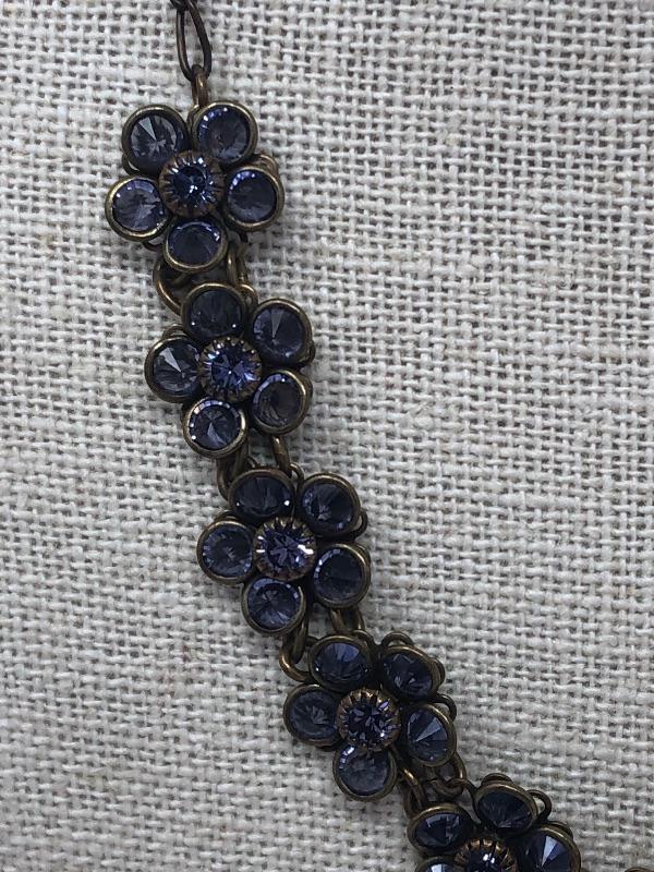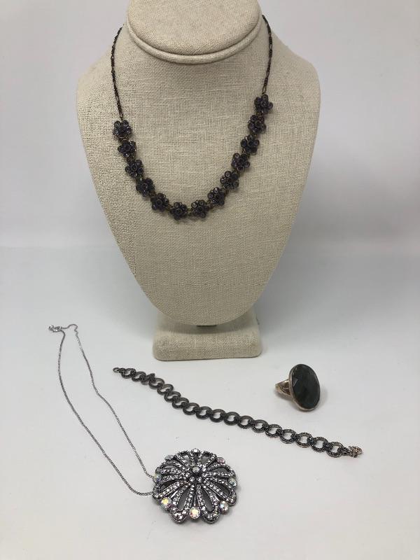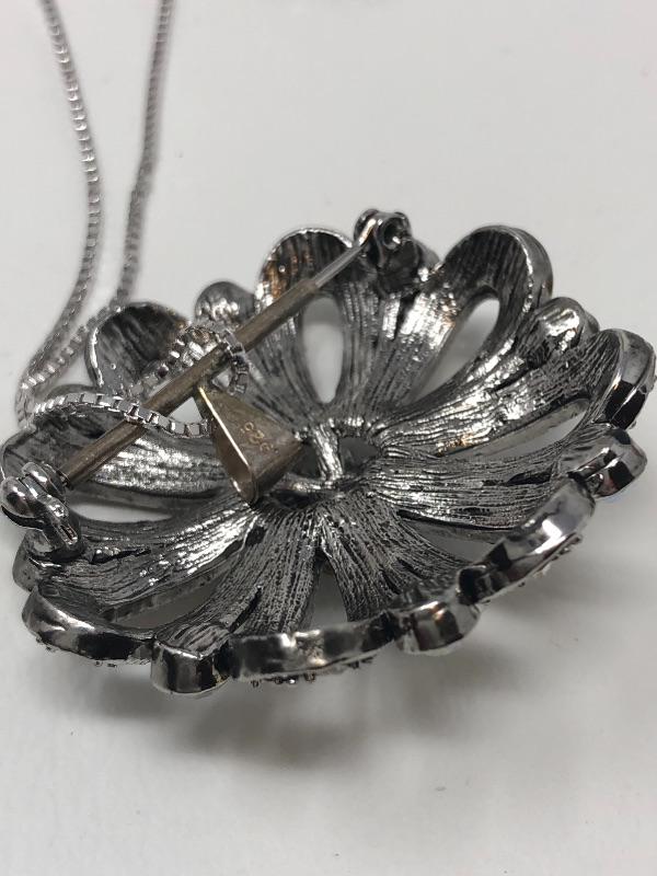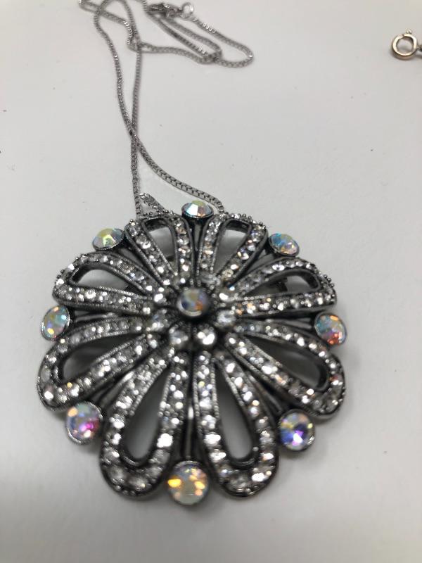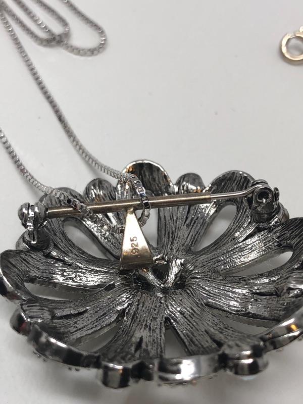 Lizpaiacios Blue Rhinestone Floral Necklace, S.F. .925 Bracelet studded with rhinestones, Brooch/pendant necklace read .925 in pendant. Ring has large green stone. Size 6