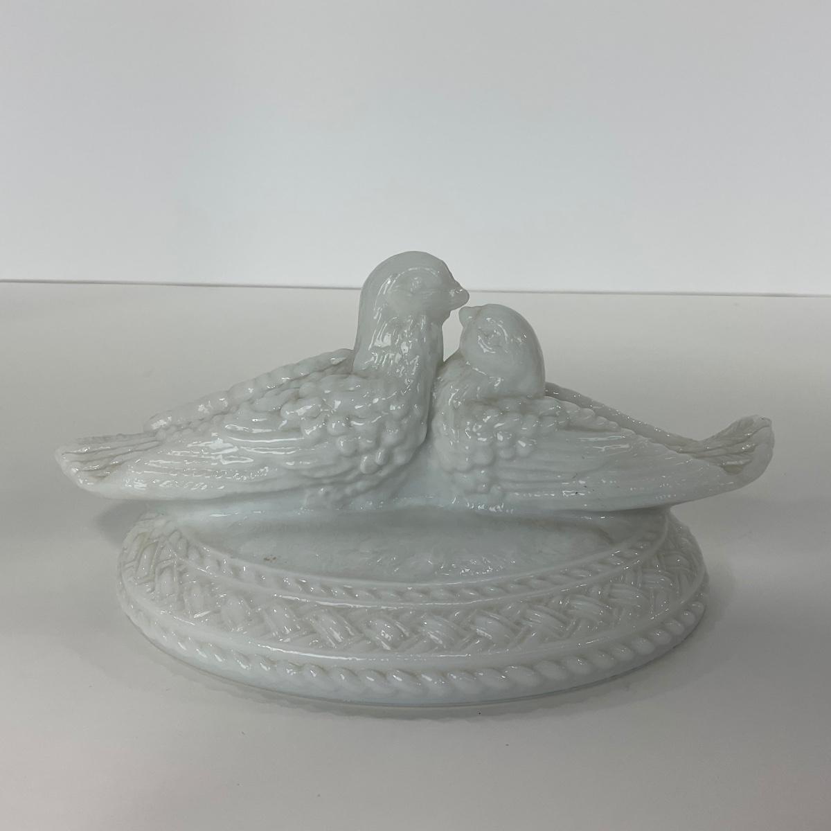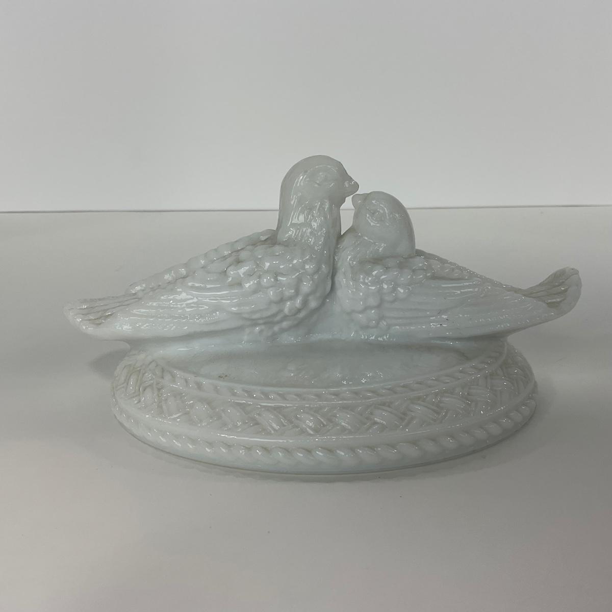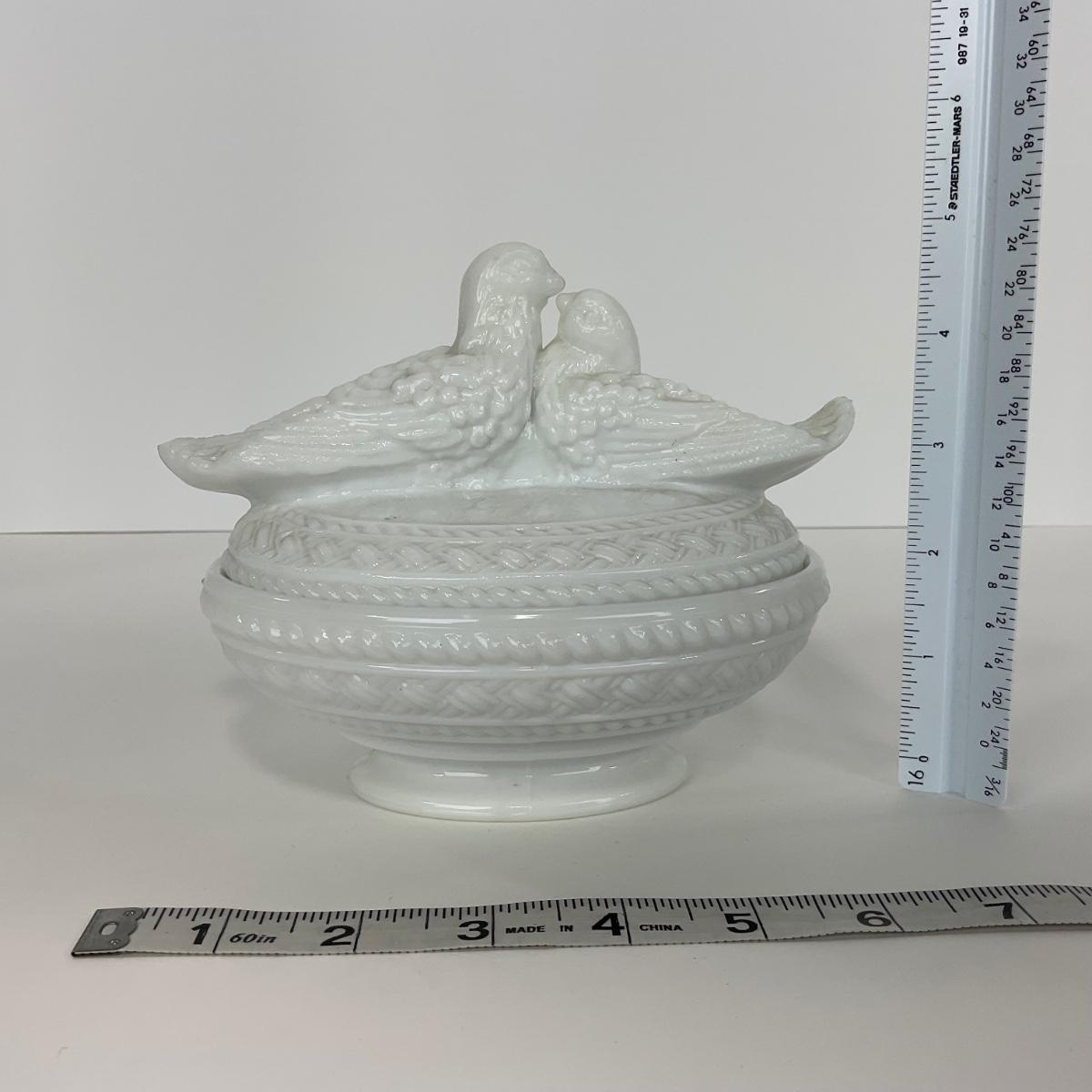 One two piece milk glass covered bird dish. To add your candies or trinkets too! Please see photos for details and condition. ::: Shipping is available on this lot. If you require shipping you must let us know at the close of the auction. We will coordinate with you after the item has been won. Shipping fees will include insurance up to or exceeding the value of all items being mailed. If you have any questions regarding this lot please contact the auctioneer either via this website, by direct email or by phone. PICK UP TIMES and other important information can be found in the TERMS and DESCRIPTION of the auction. Please take a look for pertinent information. Thanks!