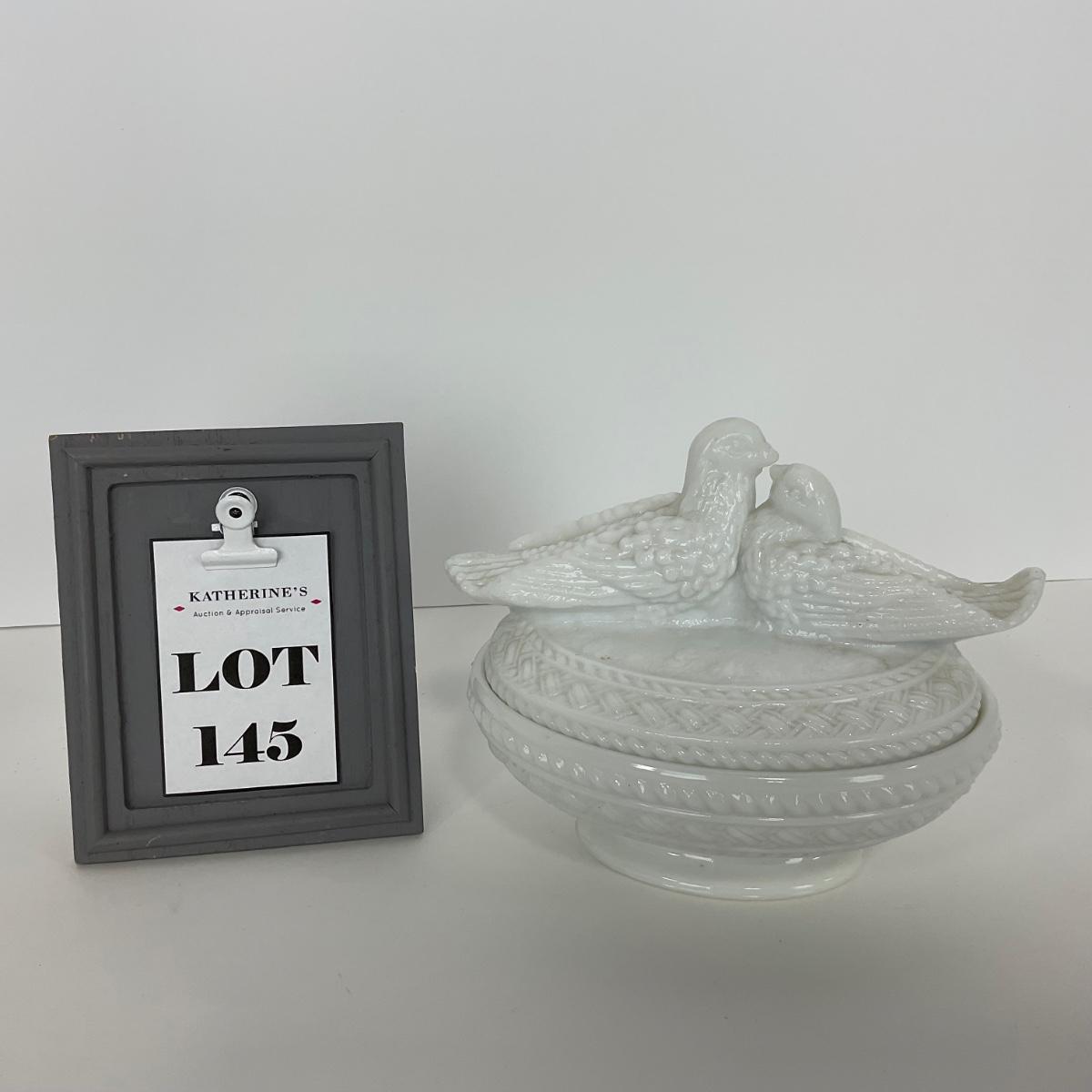 -145- GLASSWARE | Milk Glass Bird Covered Dish