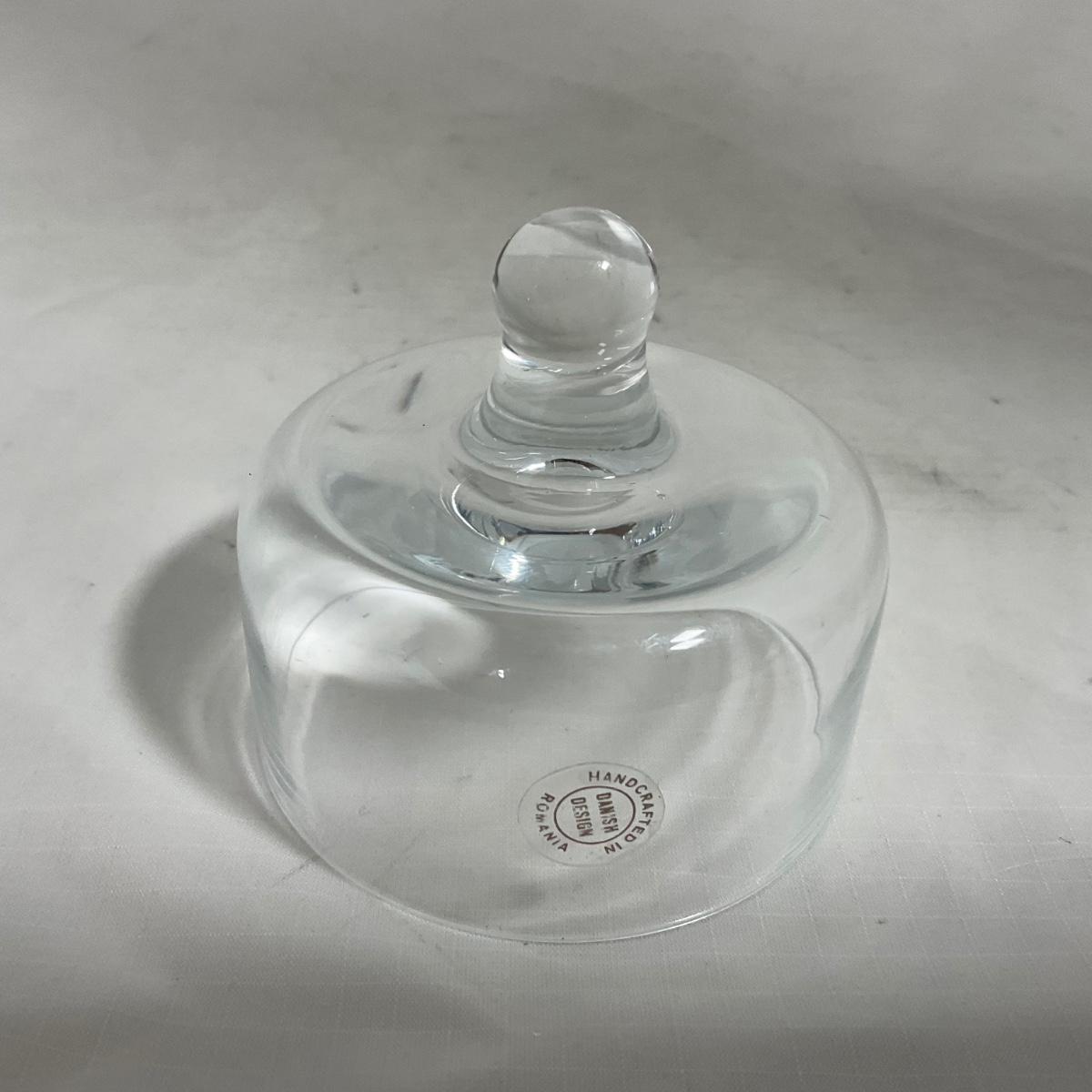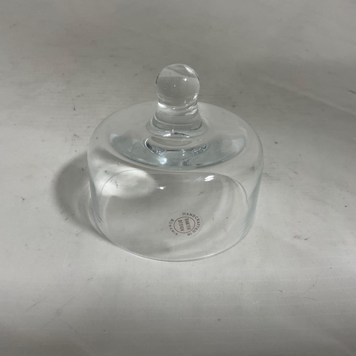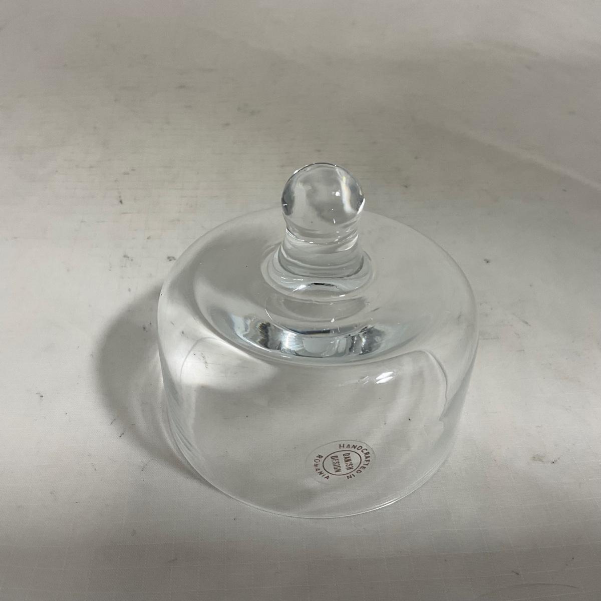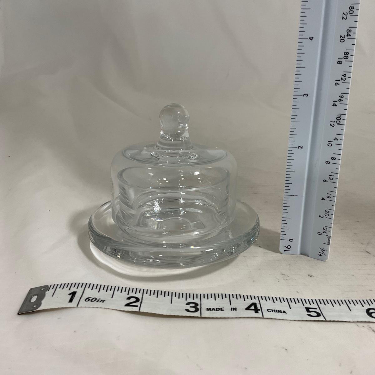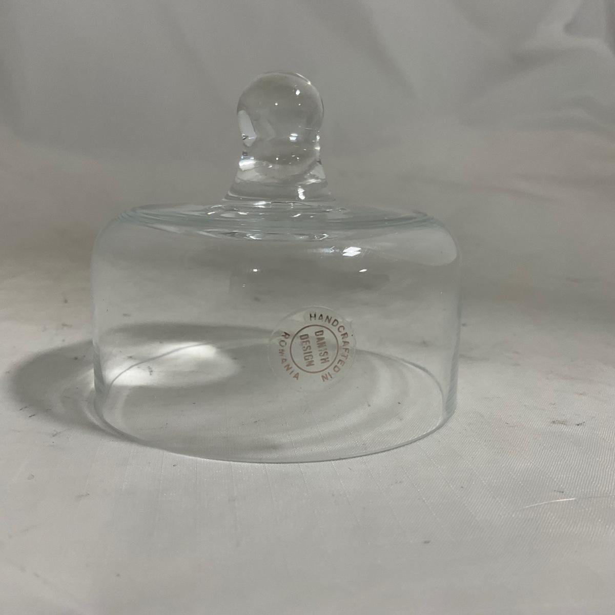 One extra small clear glass covered butter dish. With a sticker marked handcrafted danish design Romania. Piece is in amazing condition. Please see photos for details and condition. ::: Shipping is available on this lot. If you require shipping you must let us know at the close of the auction. We will coordinate with you after the item has been won. Shipping fees will include insurance up to or exceeding the value of all items being mailed. If you have any questions regarding this lot please contact the auctioneer either via this website, by direct email or by phone. PICK UP TIMES and other important information can be found in the TERMS and DESCRIPTION of the auction. Please take a look for pertinent information. Thanks!