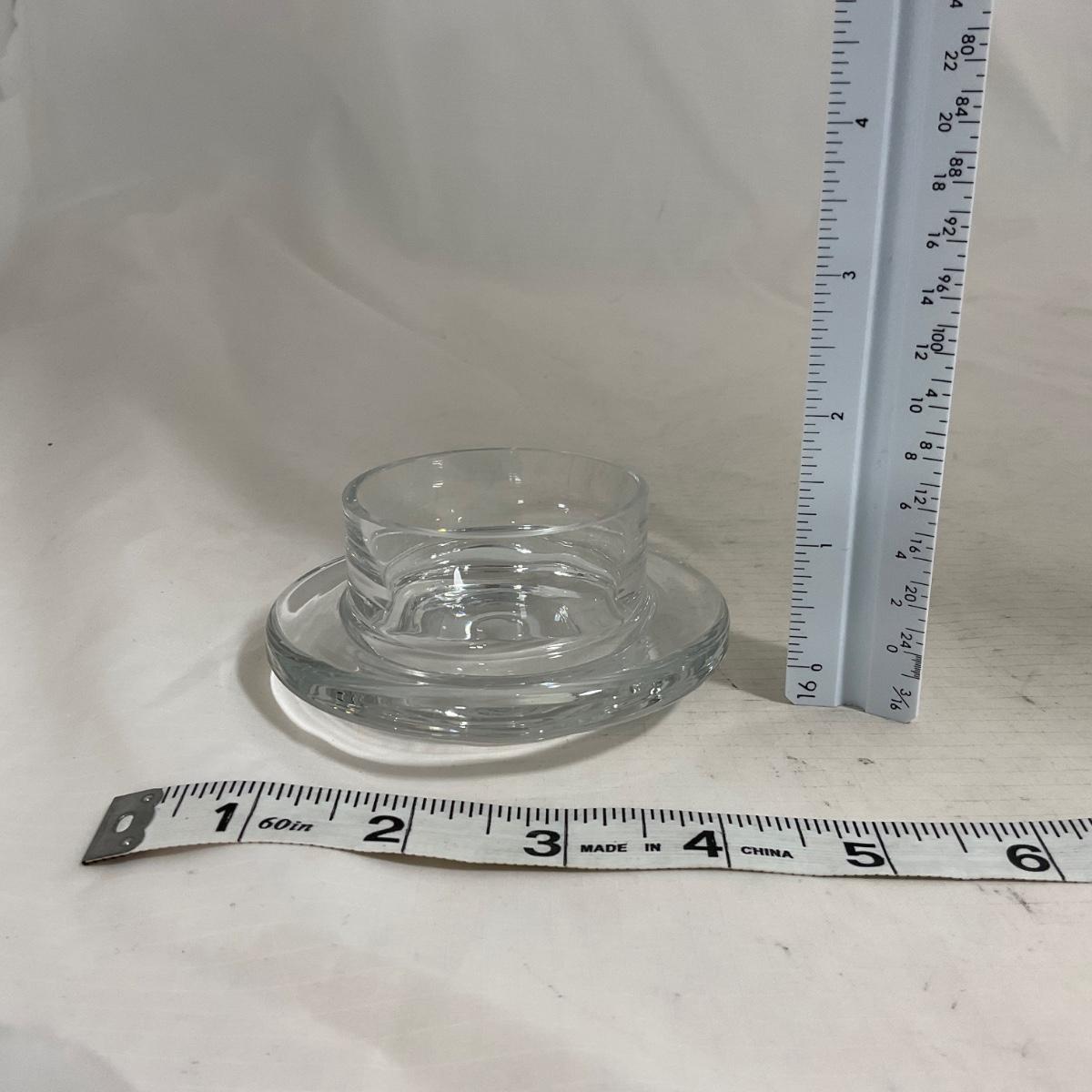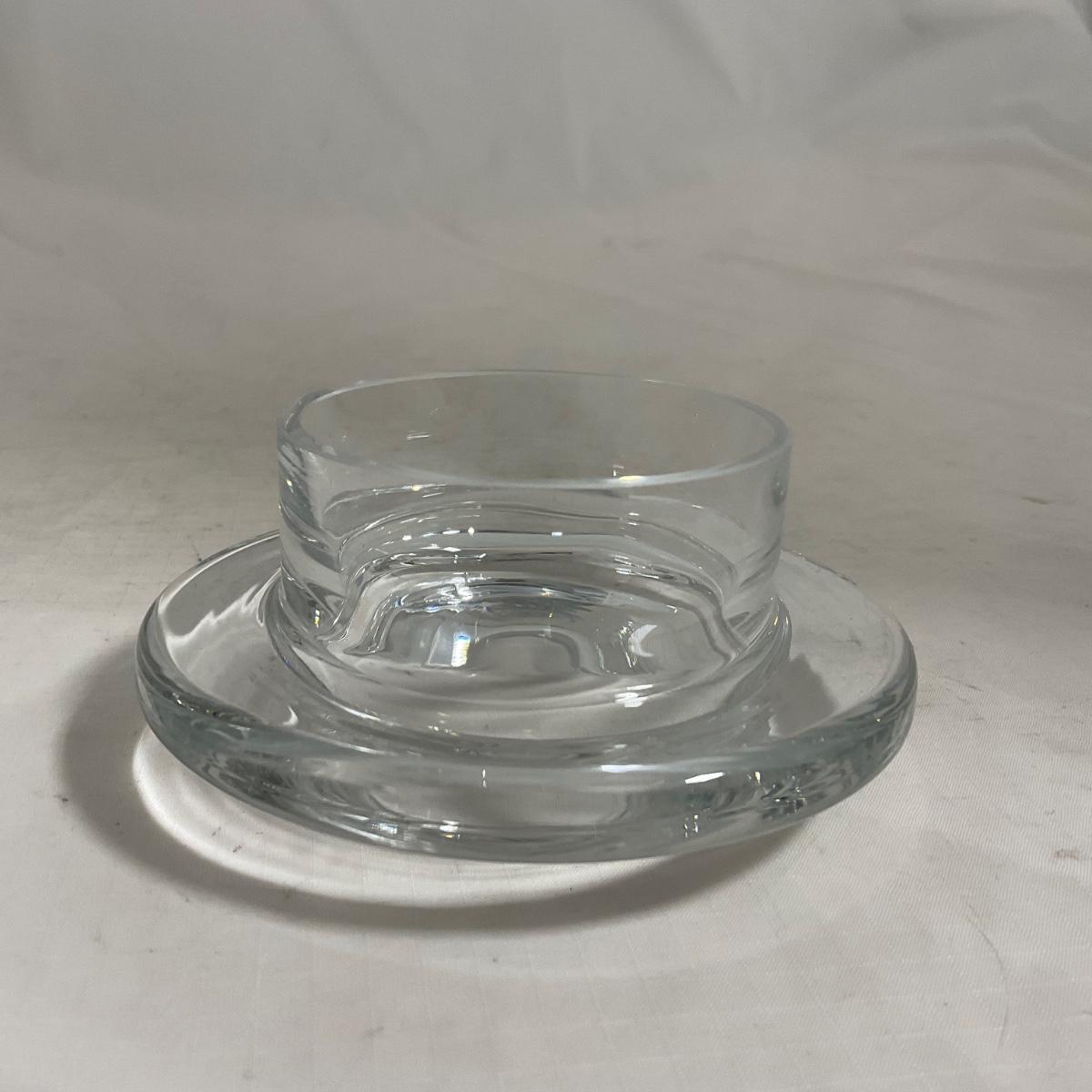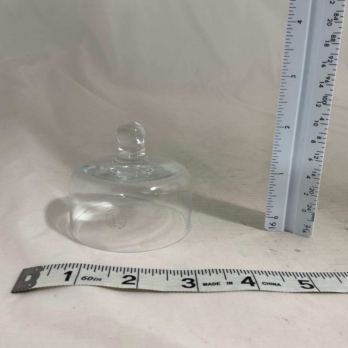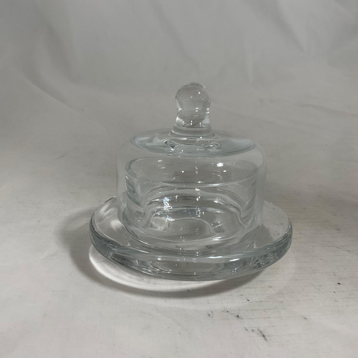 One extra small clear glass covered butter dish. With a sticker marked handcrafted danish design Romania. Piece is in amazing condition. Please see photos for details and condition. ::: Shipping is available on this lot. If you require shipping you must let us know at the close of the auction. We will coordinate with you after the item has been won. Shipping fees will include insurance up to or exceeding the value of all items being mailed. If you have any questions regarding this lot please contact the auctioneer either via this website, by direct email or by phone. PICK UP TIMES and other important information can be found in the TERMS and DESCRIPTION of the auction. Please take a look for pertinent information. Thanks!