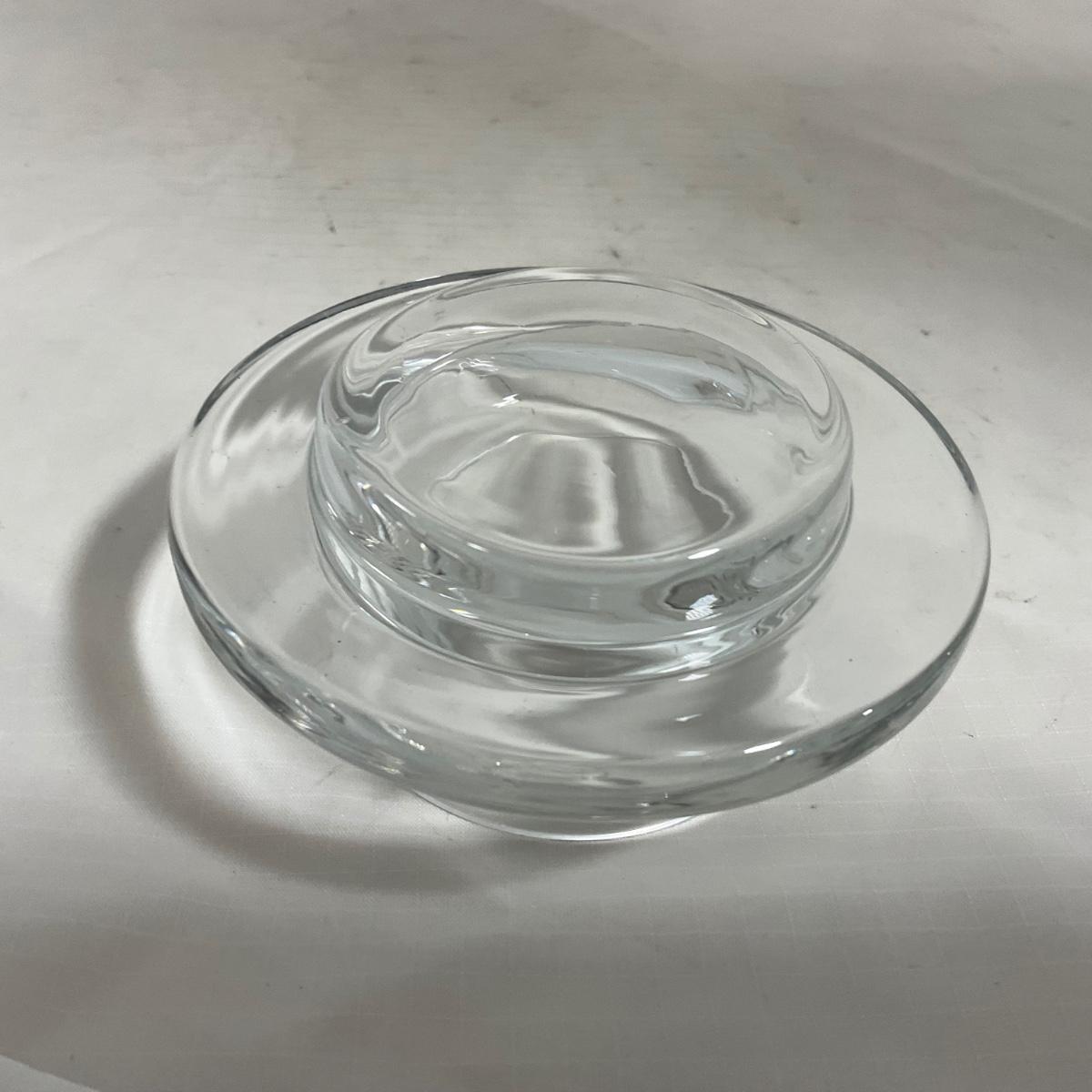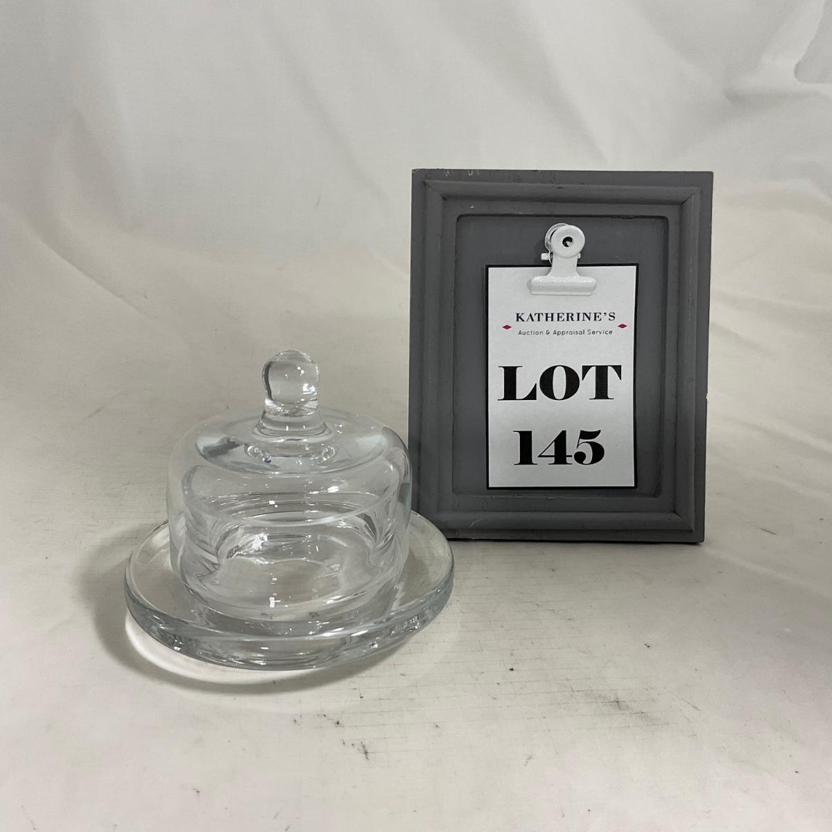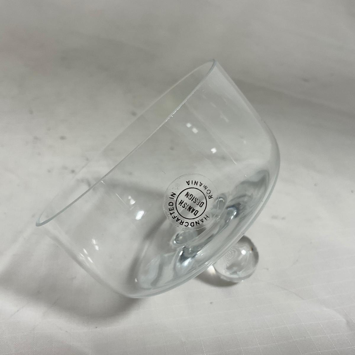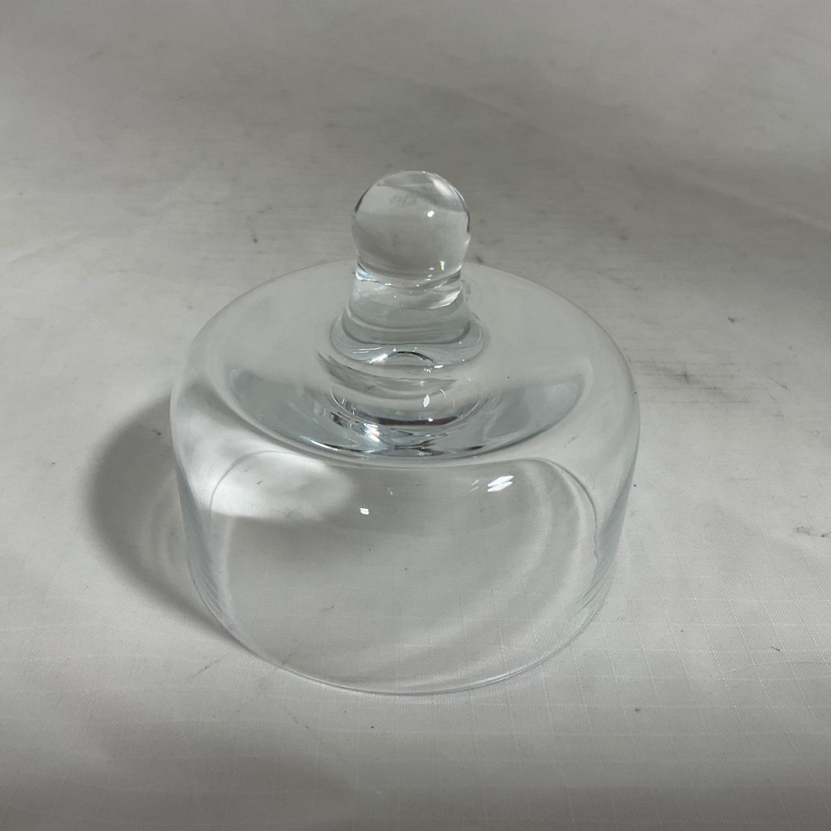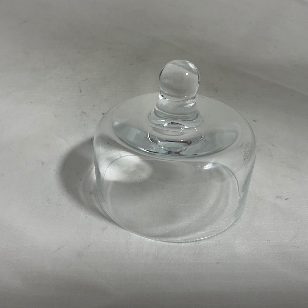 One extra small clear glass covered butter dish. With a sticker marked handcrafted danish design Romania. Piece is in amazing condition. Please see photos for details and condition. ::: Shipping is available on this lot. If you require shipping you must let us know at the close of the auction. We will coordinate with you after the item has been won. Shipping fees will include insurance up to or exceeding the value of all items being mailed. If you have any questions regarding this lot please contact the auctioneer either via this website, by direct email or by phone. PICK UP TIMES and other important information can be found in the TERMS and DESCRIPTION of the auction. Please take a look for pertinent information. Thanks!