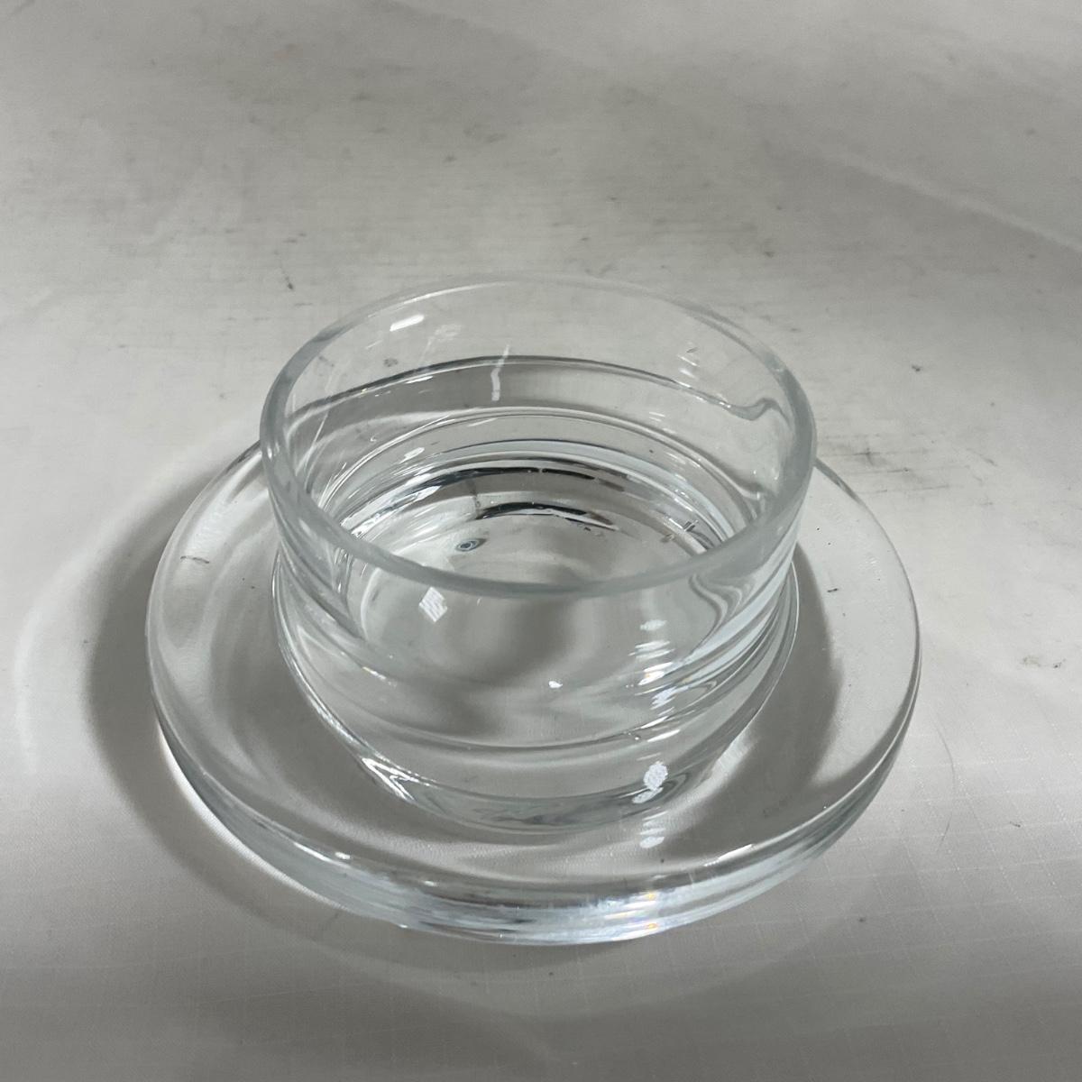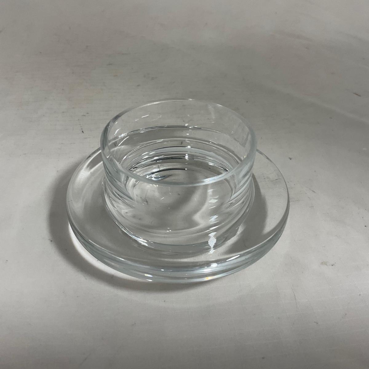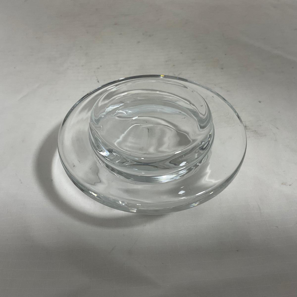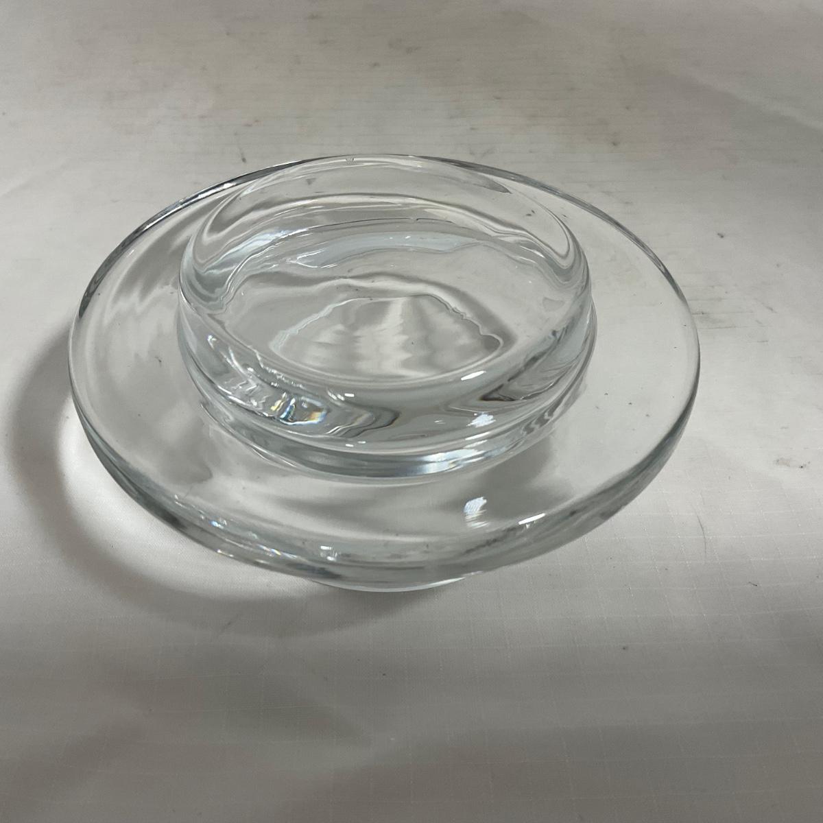 One extra small clear glass covered butter dish. With a sticker marked handcrafted danish design Romania. Piece is in amazing condition. Please see photos for details and condition. ::: Shipping is available on this lot. If you require shipping you must let us know at the close of the auction. We will coordinate with you after the item has been won. Shipping fees will include insurance up to or exceeding the value of all items being mailed. If you have any questions regarding this lot please contact the auctioneer either via this website, by direct email or by phone. PICK UP TIMES and other important information can be found in the TERMS and DESCRIPTION of the auction. Please take a look for pertinent information. Thanks!