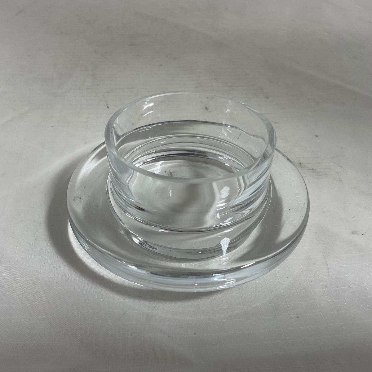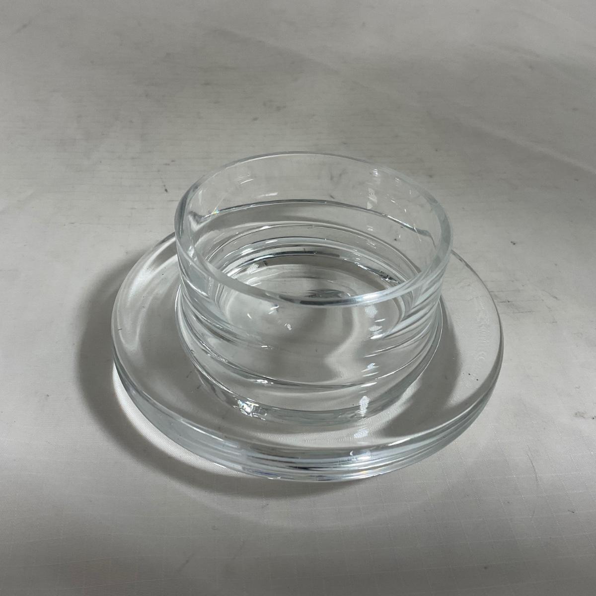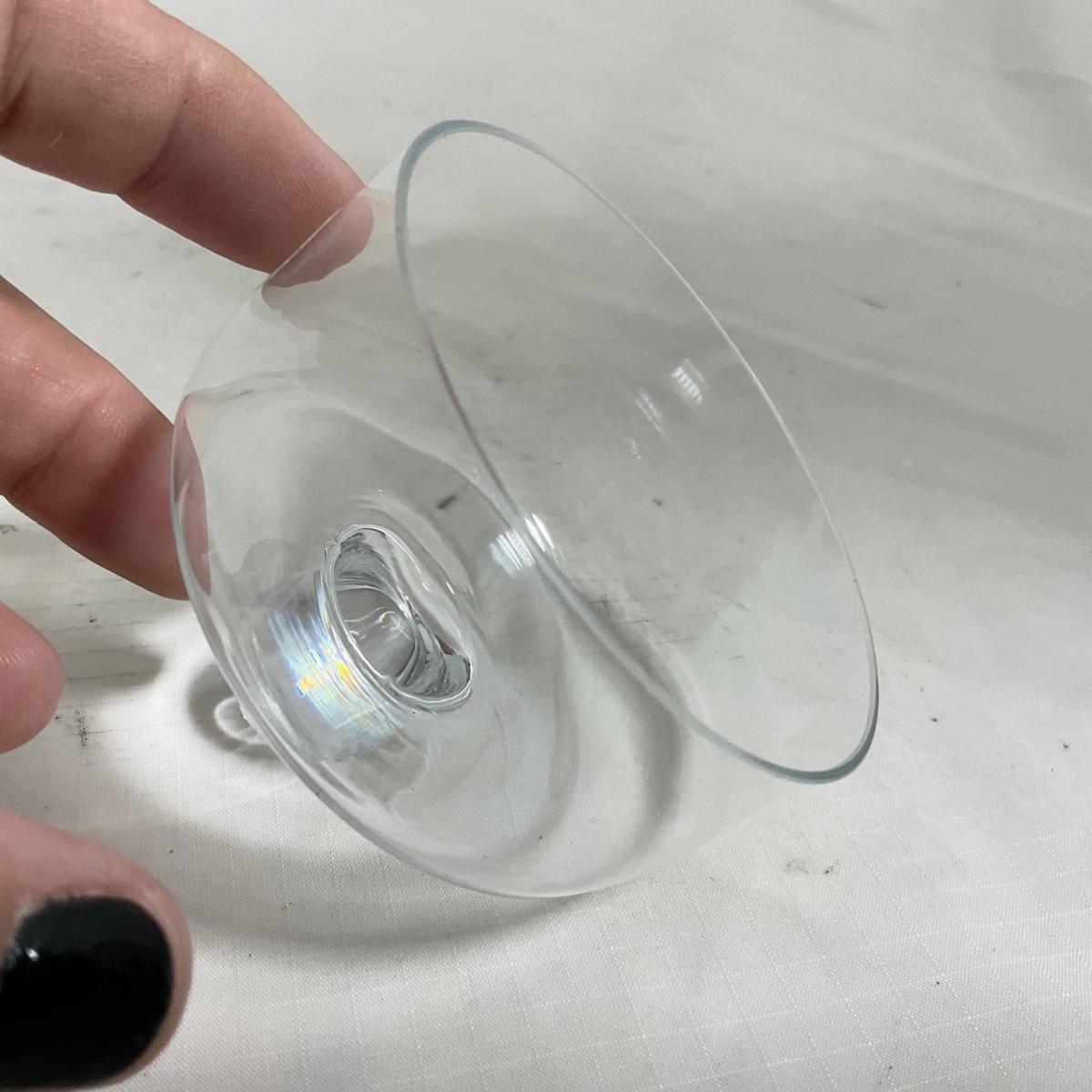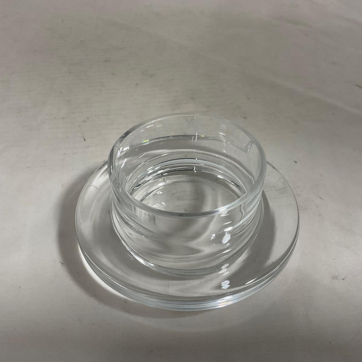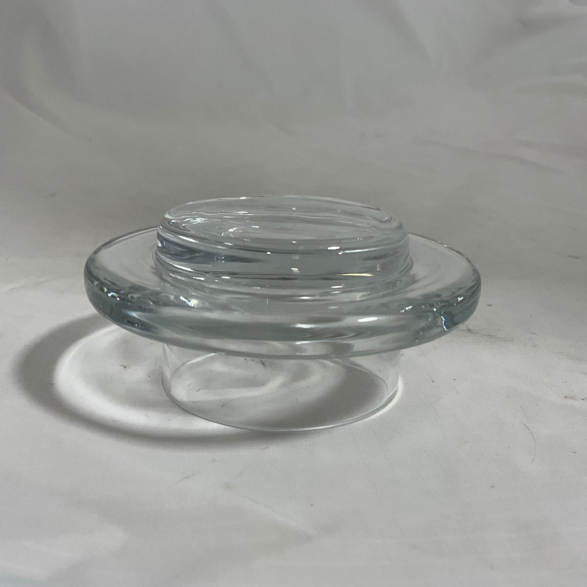 One extra small clear glass covered butter dish. With a sticker marked handcrafted danish design Romania. Piece is in amazing condition. Please see photos for details and condition. ::: Shipping is available on this lot. If you require shipping you must let us know at the close of the auction. We will coordinate with you after the item has been won. Shipping fees will include insurance up to or exceeding the value of all items being mailed. If you have any questions regarding this lot please contact the auctioneer either via this website, by direct email or by phone. PICK UP TIMES and other important information can be found in the TERMS and DESCRIPTION of the auction. Please take a look for pertinent information. Thanks!