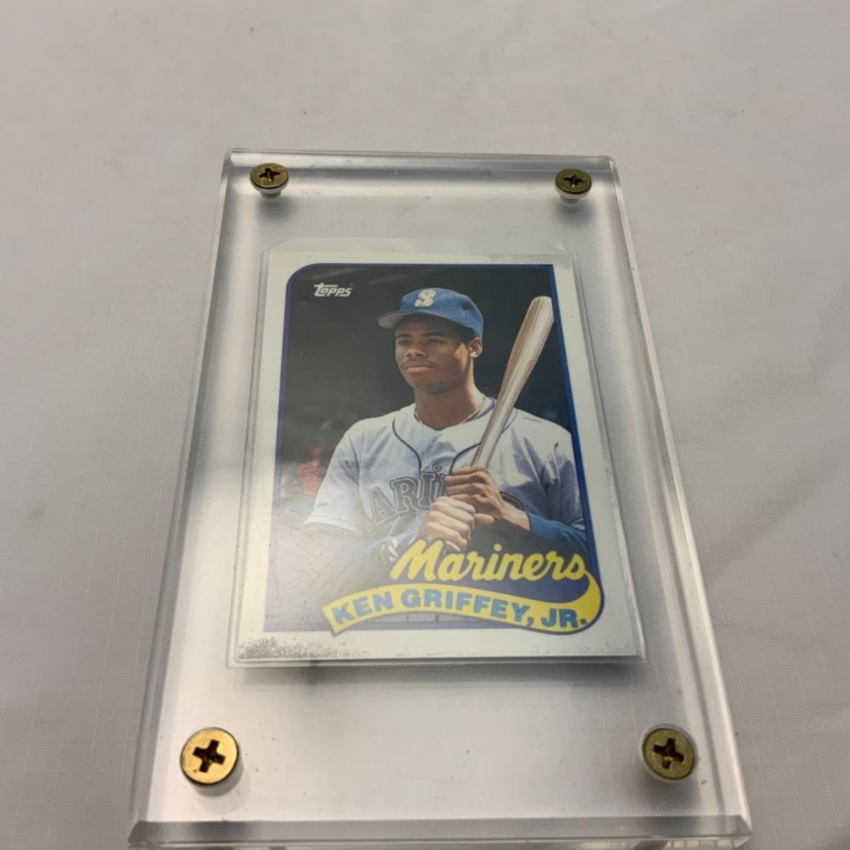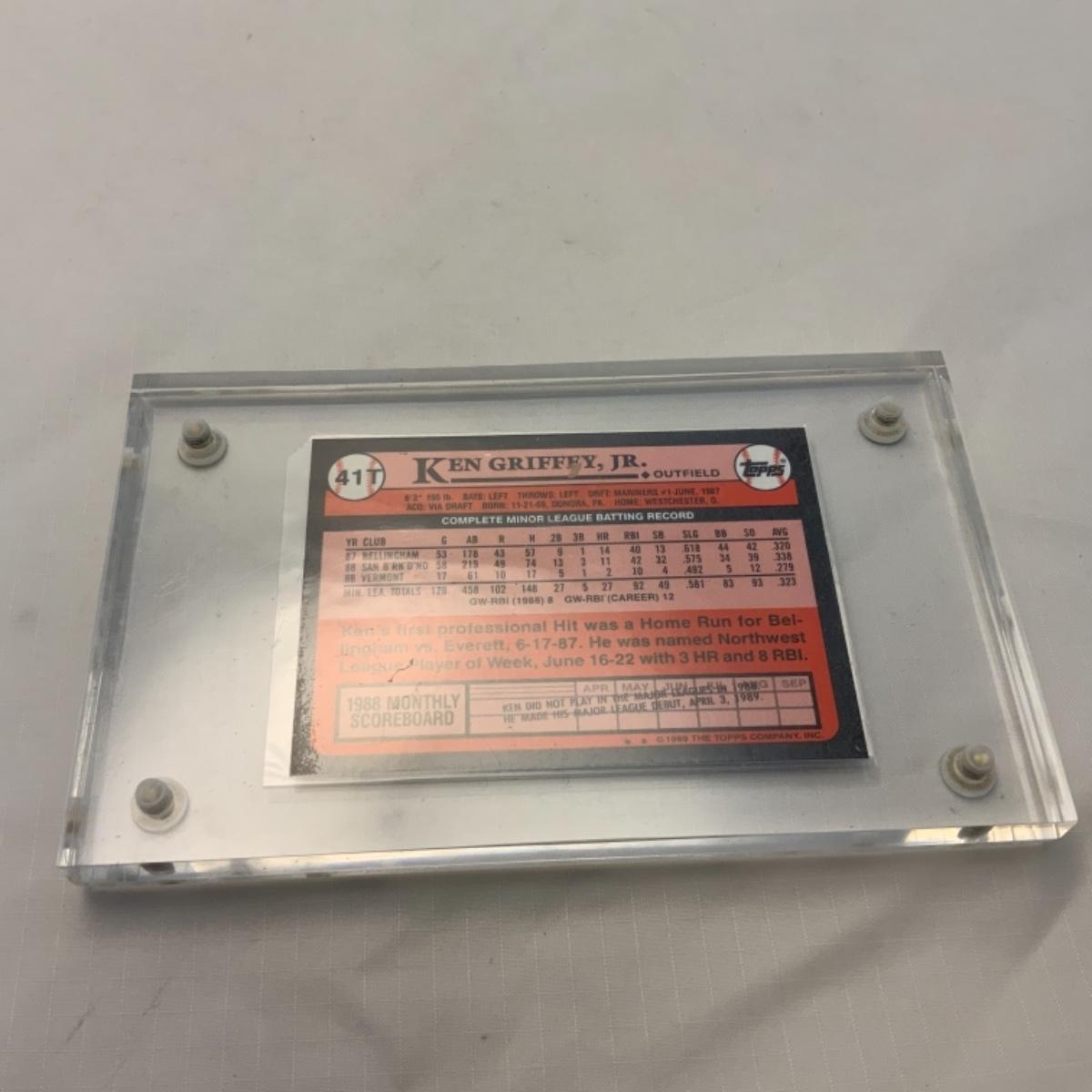 Ken Griffey Jr. TOPPS Card #41T from the 1989 Series, in acrylic Plaque. Card could be removed and sent in for grading, it is in exceptional condition. Please see photos for details and condition. ::: Shipping is available on this lot. If you require shipping you must let us know at the close of the auction. We will coordinate with you after the item has been won. Shipping fees will include insurance up to or exceeding the value of all items being mailed. If you have any questions regarding this lot please contact the auctioneer either via this website, by direct email or by phone. PICK UP TIMES and other important information can be found in the TERMS and DESCRIPTION of the auction. Please take a look for pertinent information. Thanks!