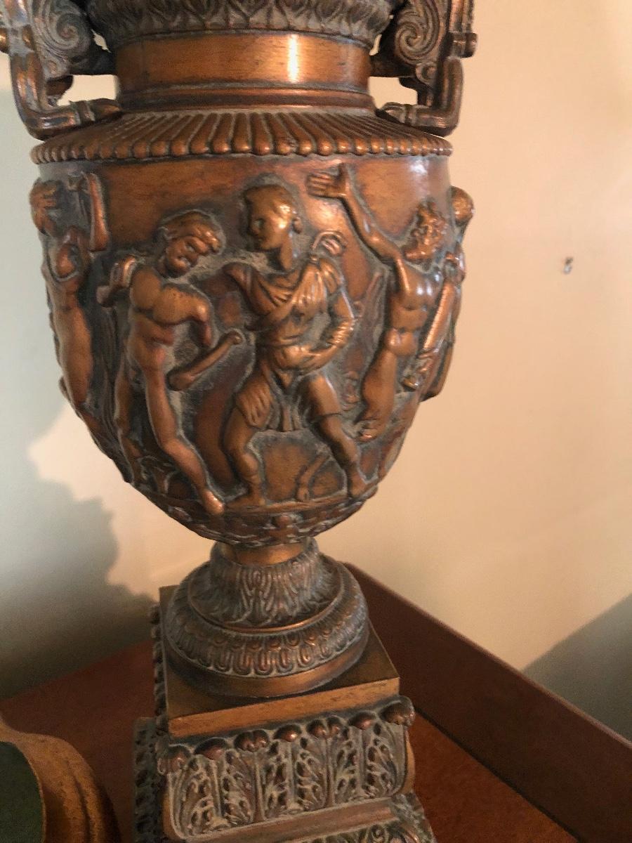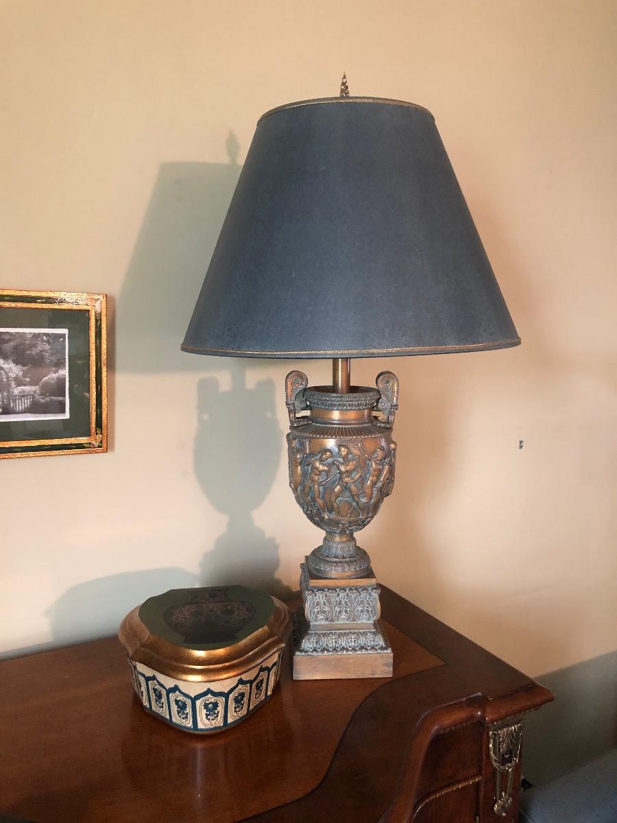 #145- Lamp with Greek inspired men and box with bass gold ornate solid lampÊ