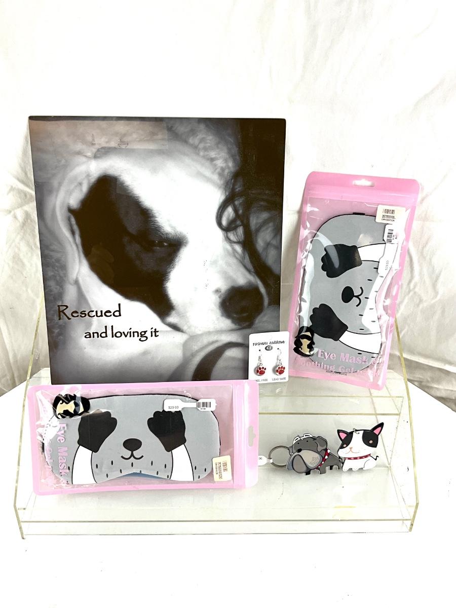 145 RESCUED & LOVING IT Picture with Eye Masks and Dog Keychains