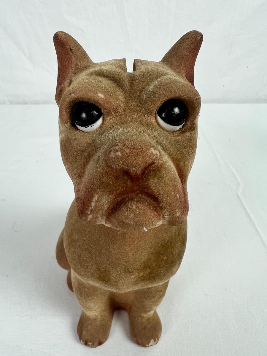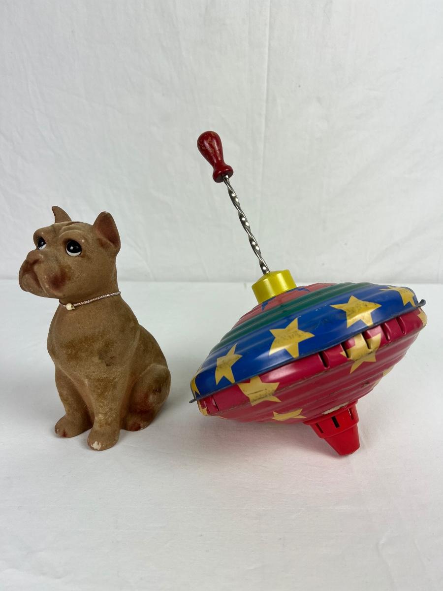 Vintage Fur Felt Dog Coin Bank & Tin Spin Top