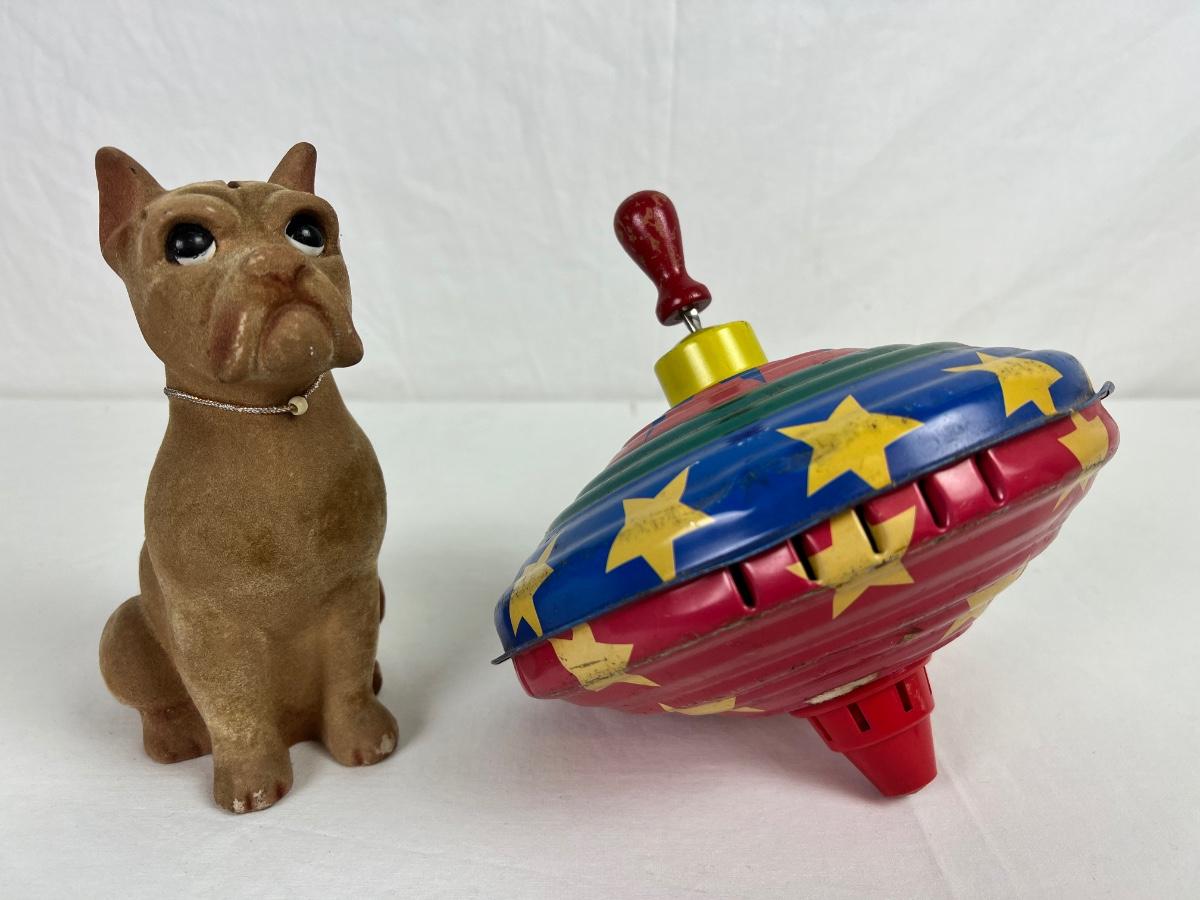 145 Vintage Fur Felt Dog Coin Bank & Tin Spin Top