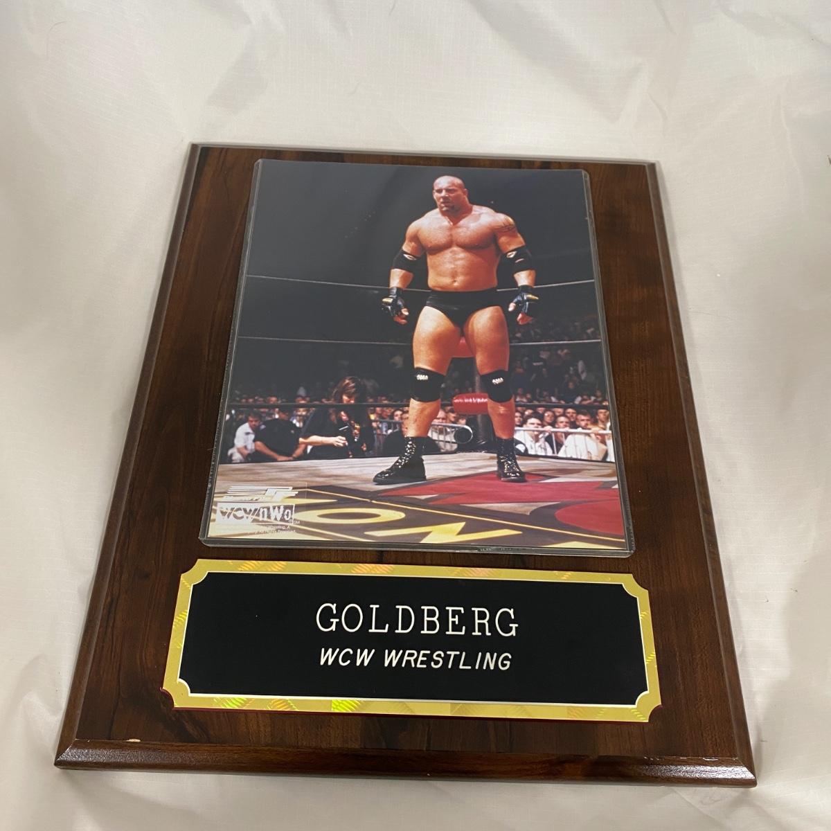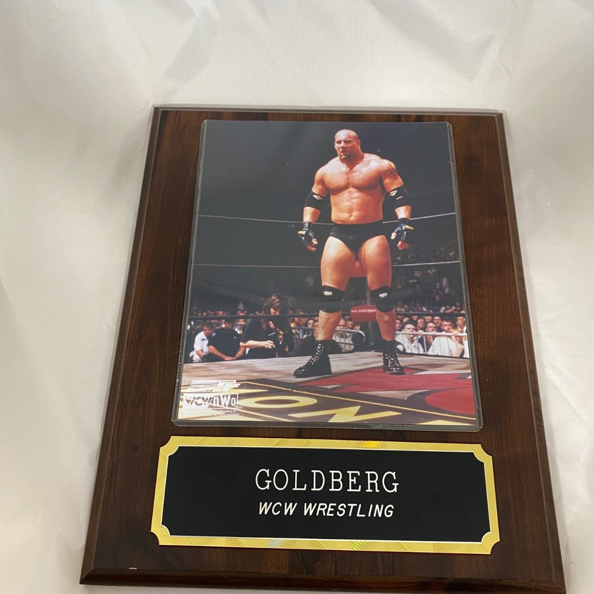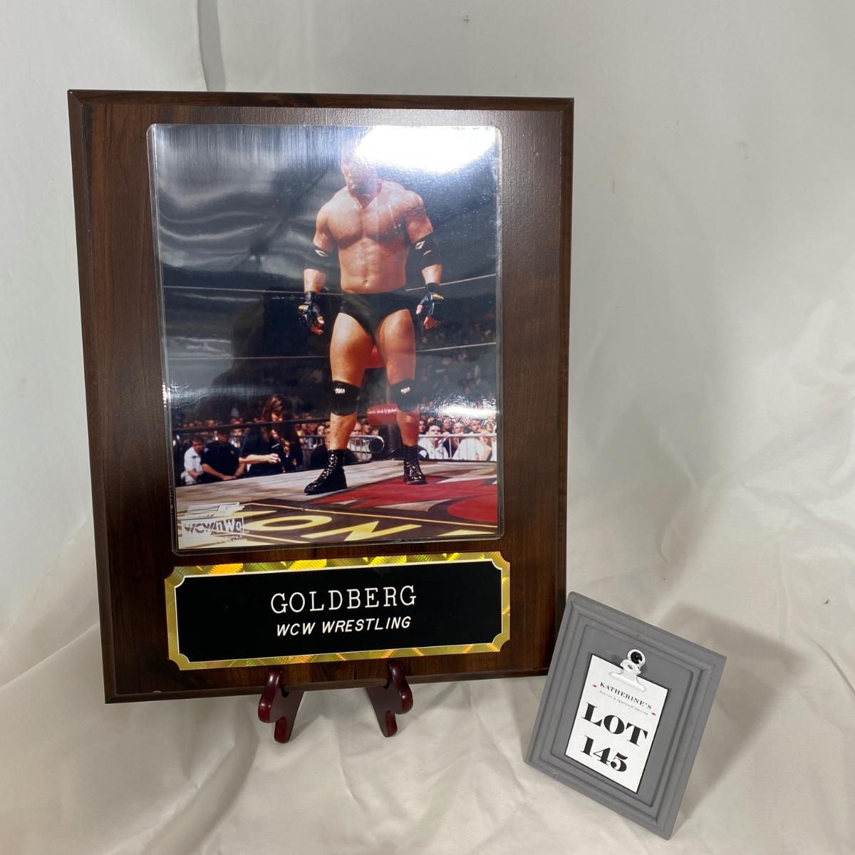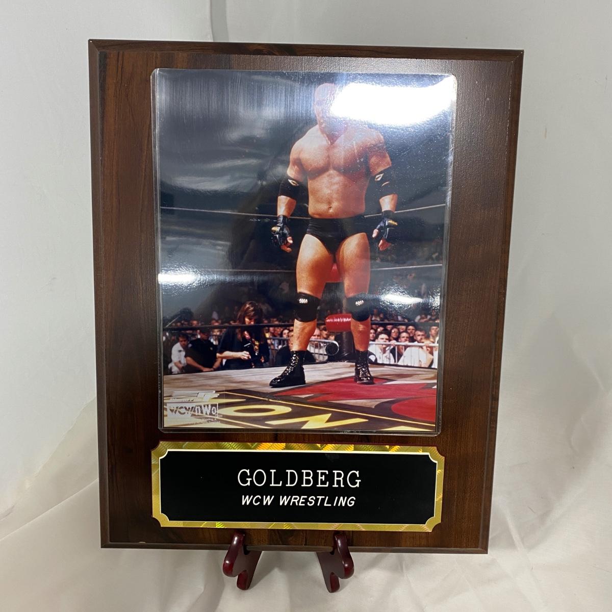 12 inches by 15 inches plaque with Goldberg WCW wrestling. Please see photos for details and condition. ::: Shipping is available on this lot. If you require shipping you must let us know at the close of the auction. We will coordinate with you after the item has been won. Shipping fees will include insurance up to or exceeding the value of all items being mailed. If you have any questions regarding this lot please contact the auctioneer either via this website, by direct email or by phone. PICK UP TIMES and other important information can be found in the TERMS and DESCRIPTION of the auction. Please take a look for pertinent information. Thanks!