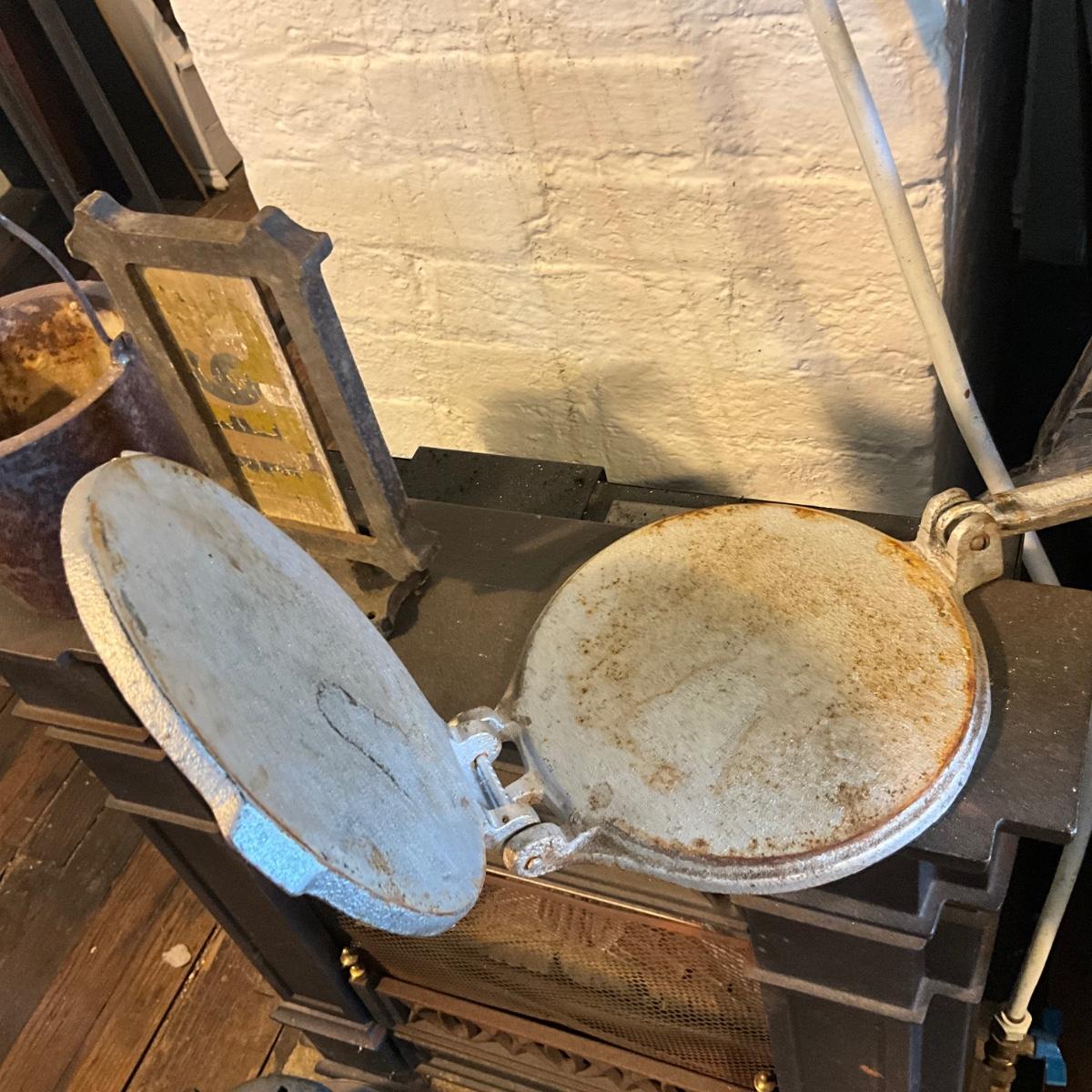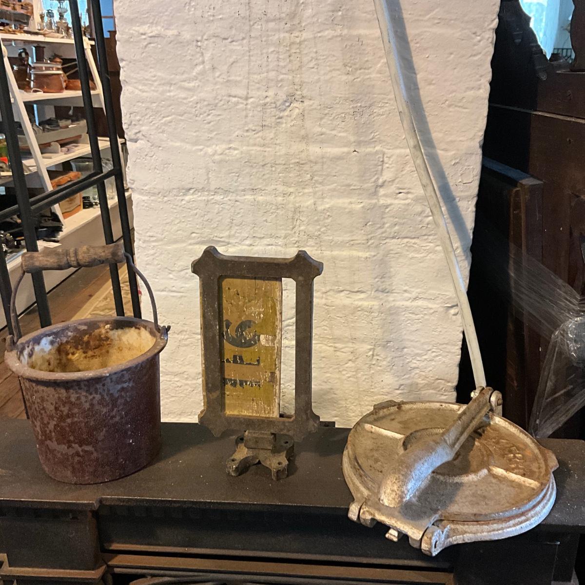 1450 Cast Iron Pale , Tortilla Press & Antique Cast Iron Sign
