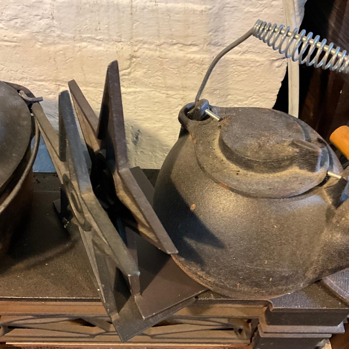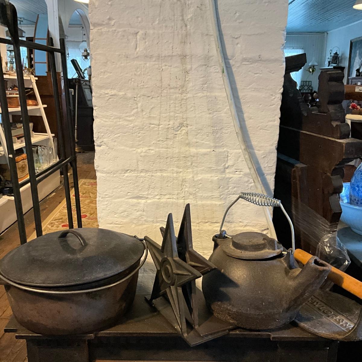 1451 Cast Iron Lot = Covered Roaster , Tea Kettle, Taylor Bull Press , Star Bookends