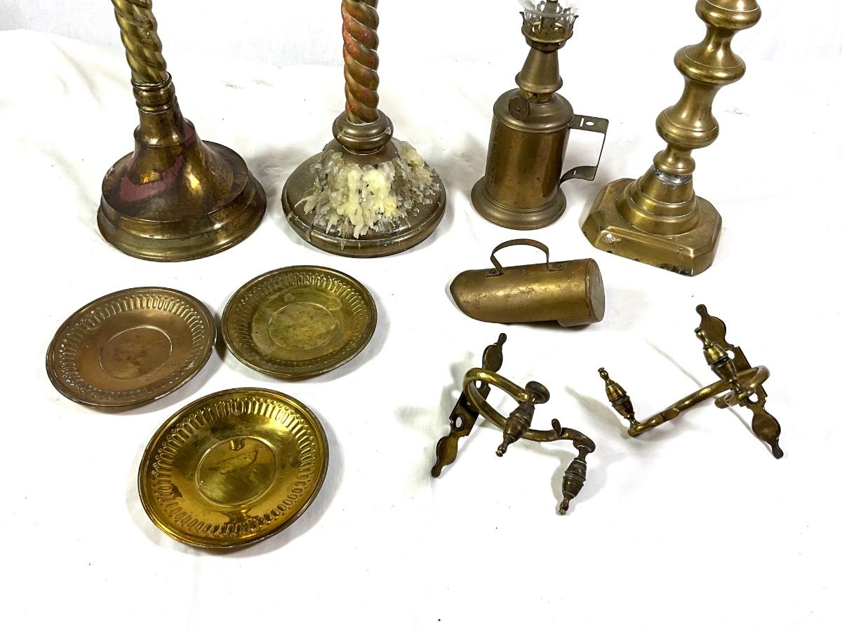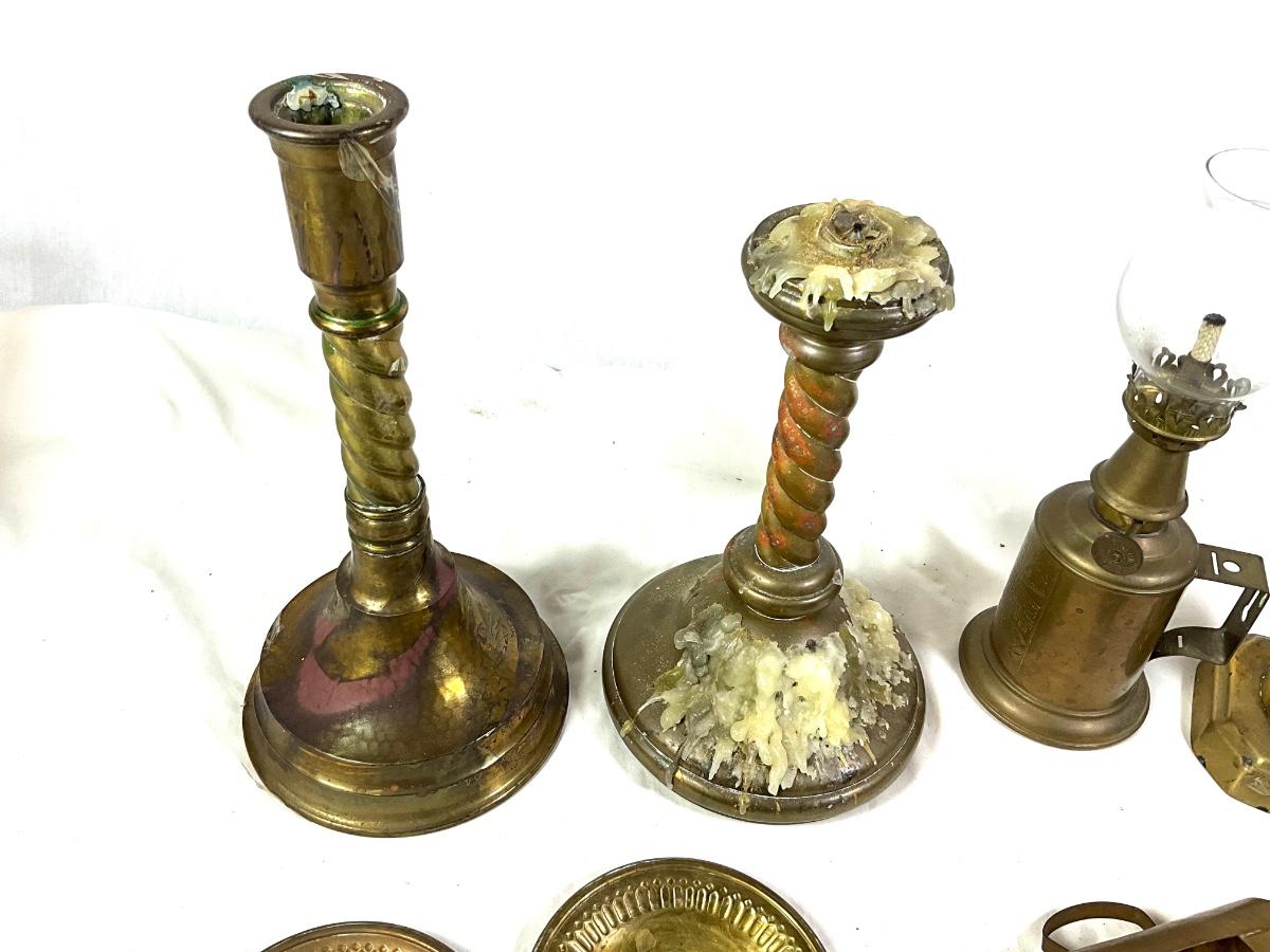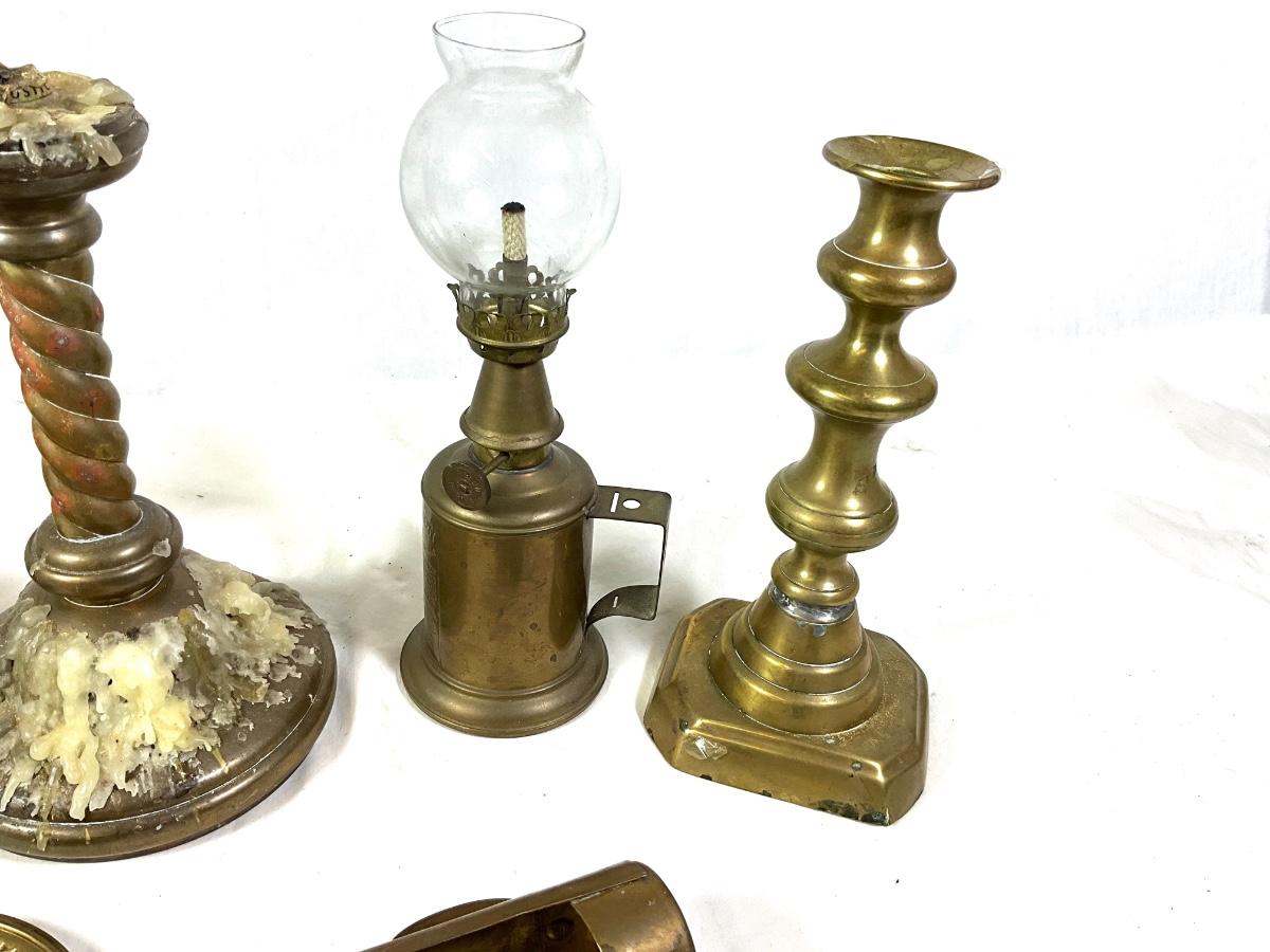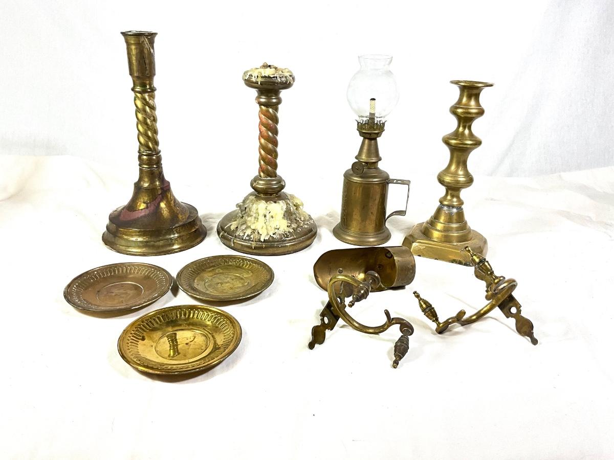Various vintage candlesticks , small French Pigeon oil lamp , vintage push up lamp ,