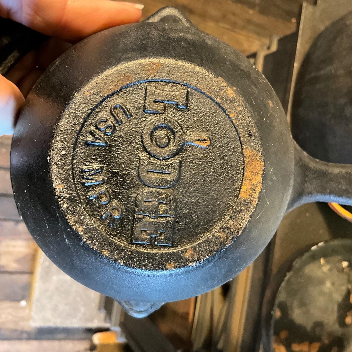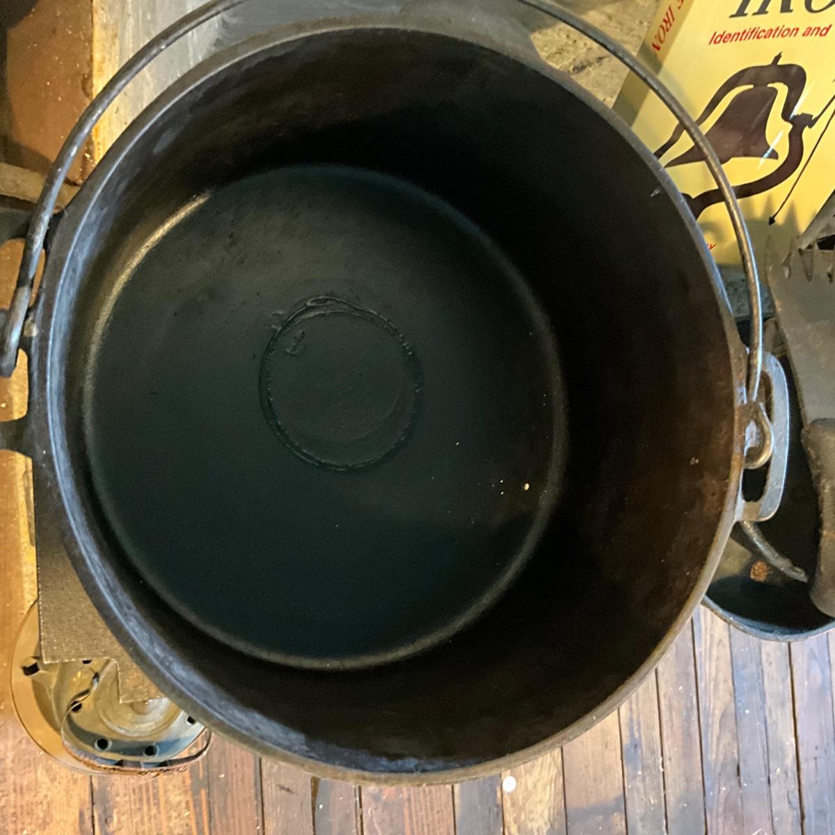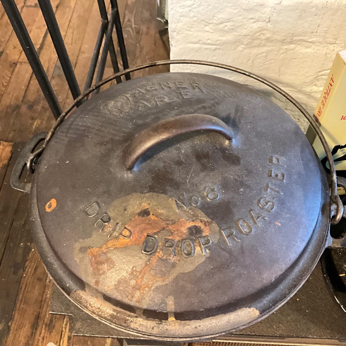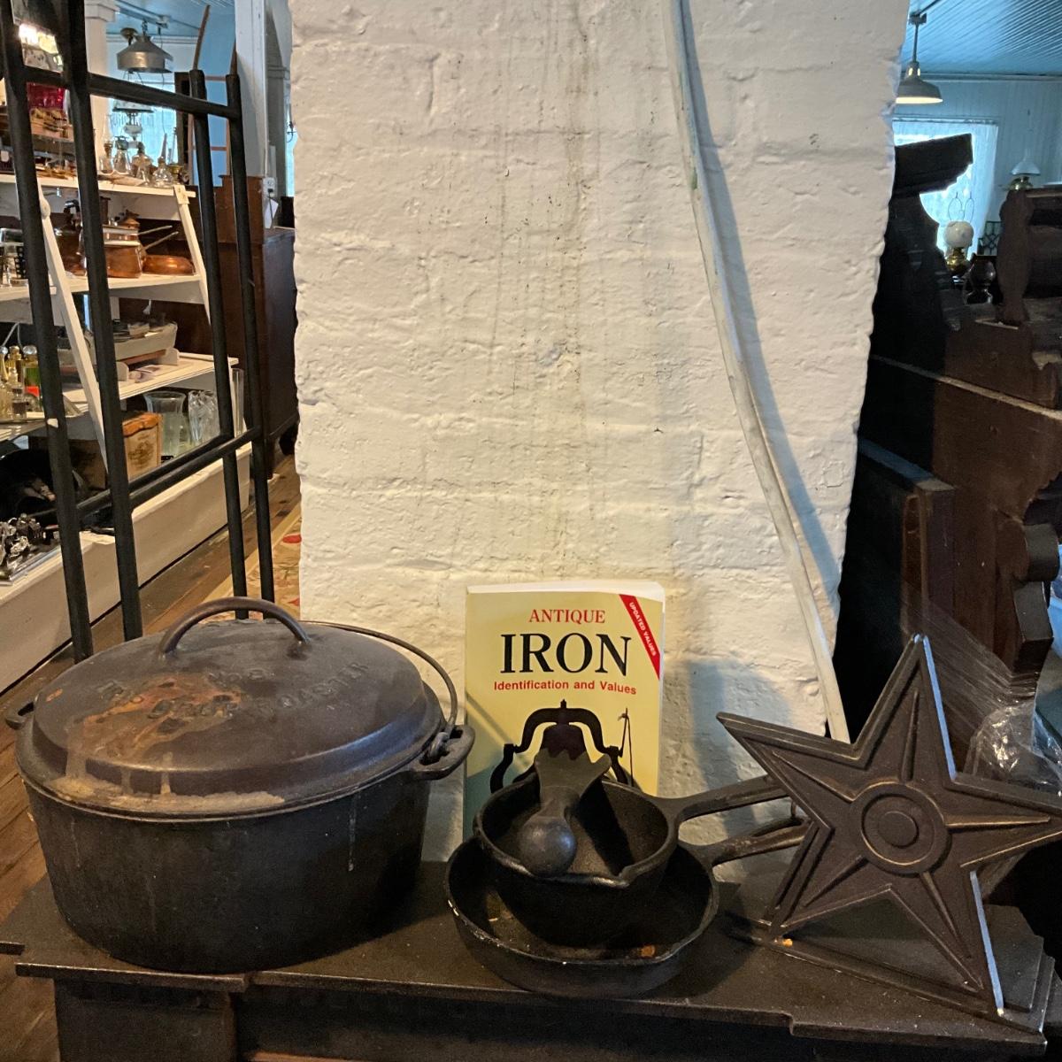 #8 wagnerware cast iron pot , with Antique Iron Book, Ice shaver , two small skillet one is 6.5" diameter, one is lodge ,
