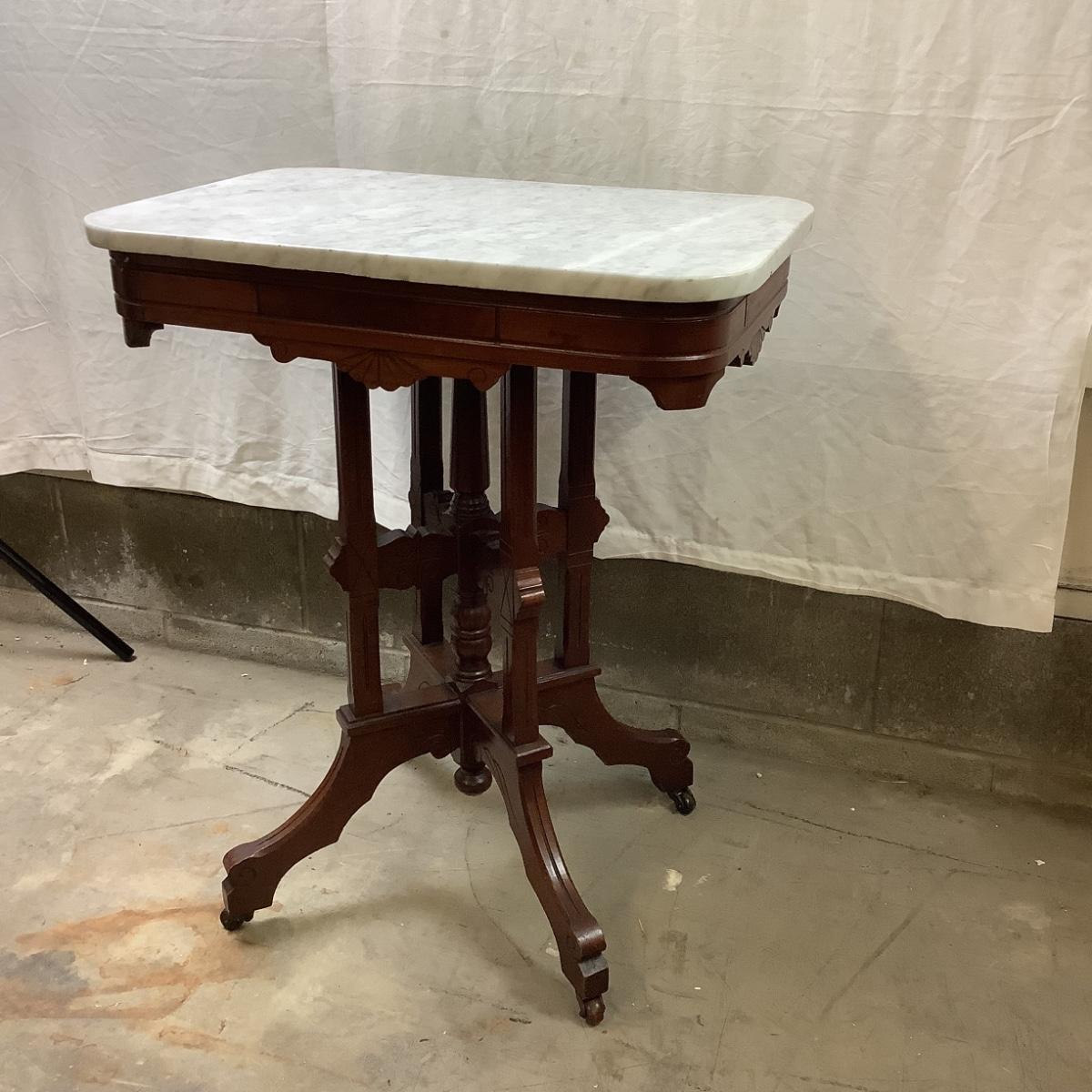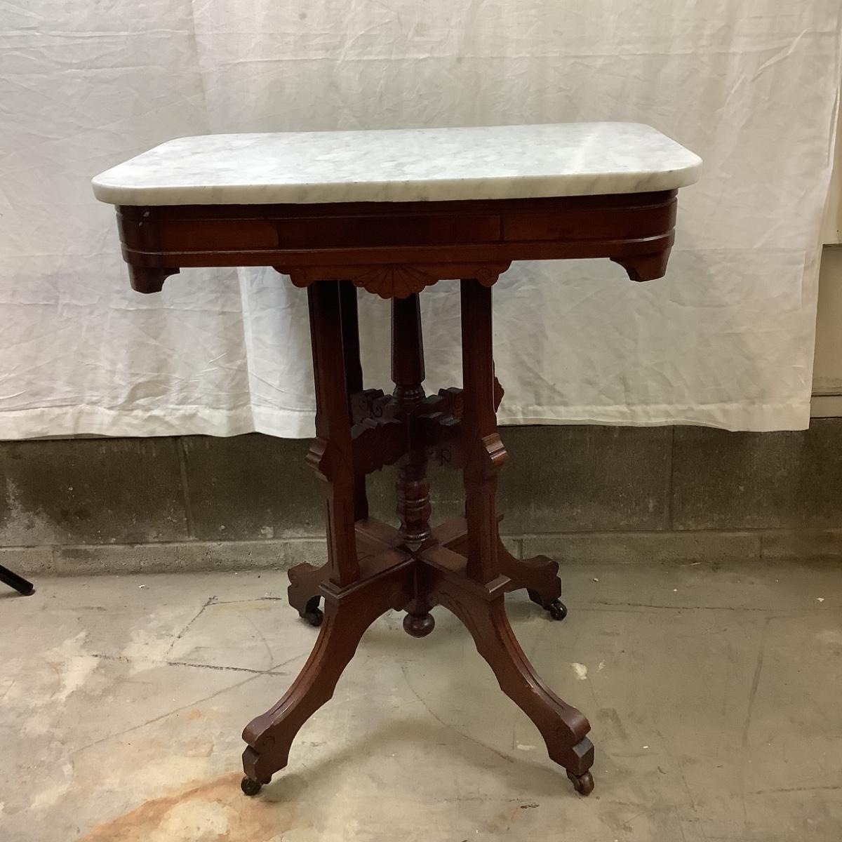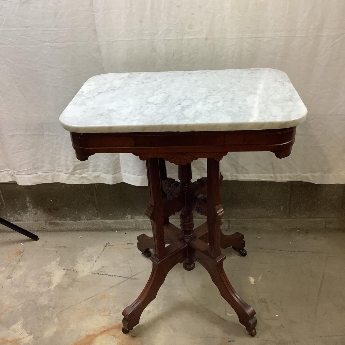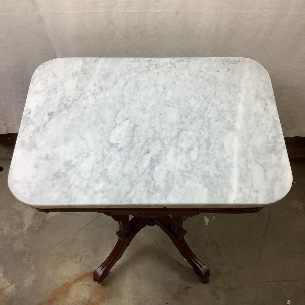1457 Antique Eastlake Burl and Marble Top Parlor Table