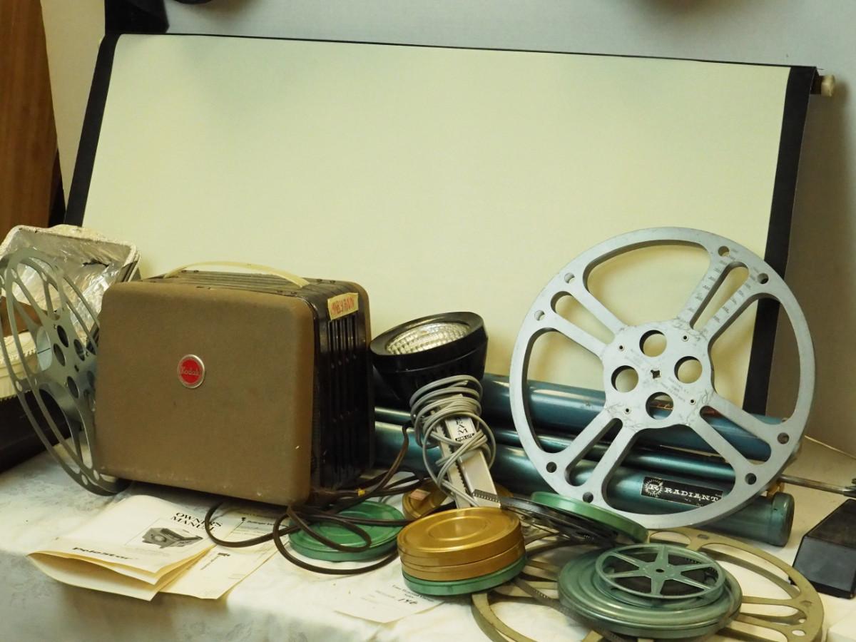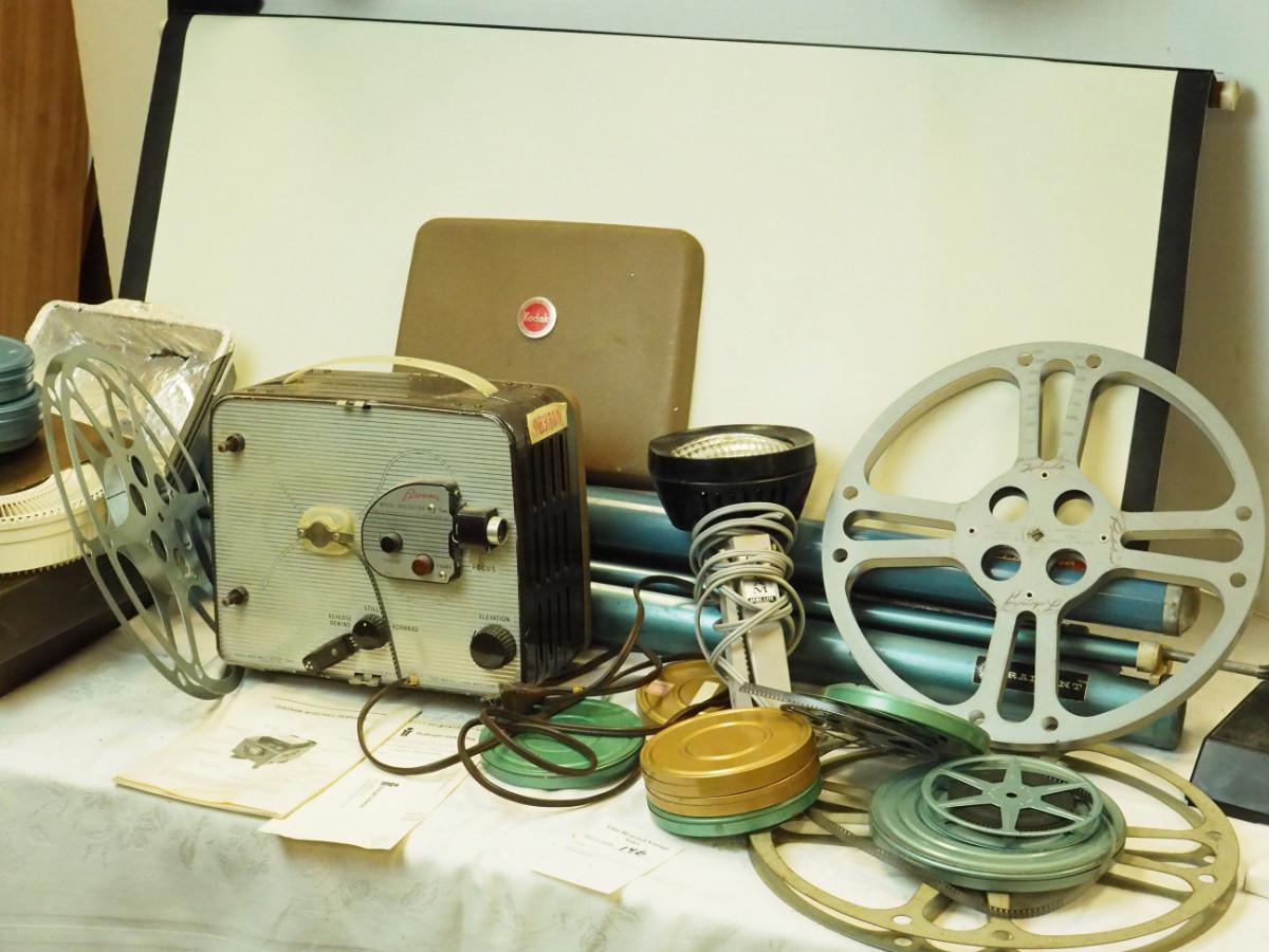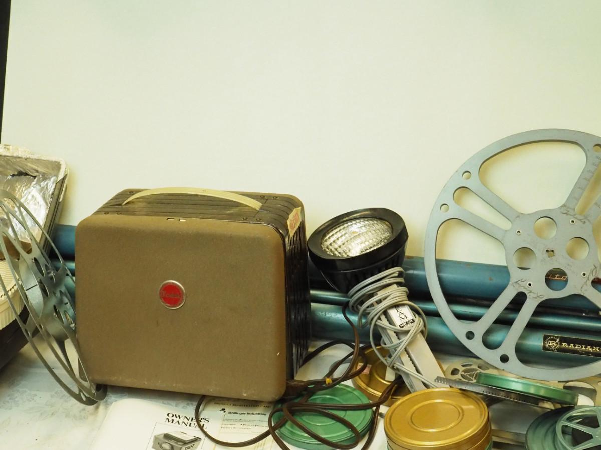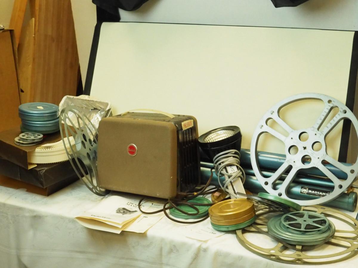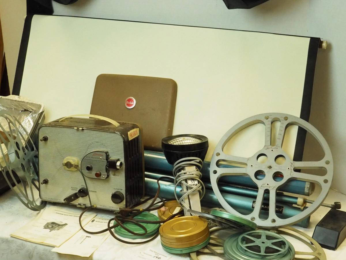 146- Vintage super 8 movie projector, film, reels, screens. Brownie projector, empty and full reels of film.