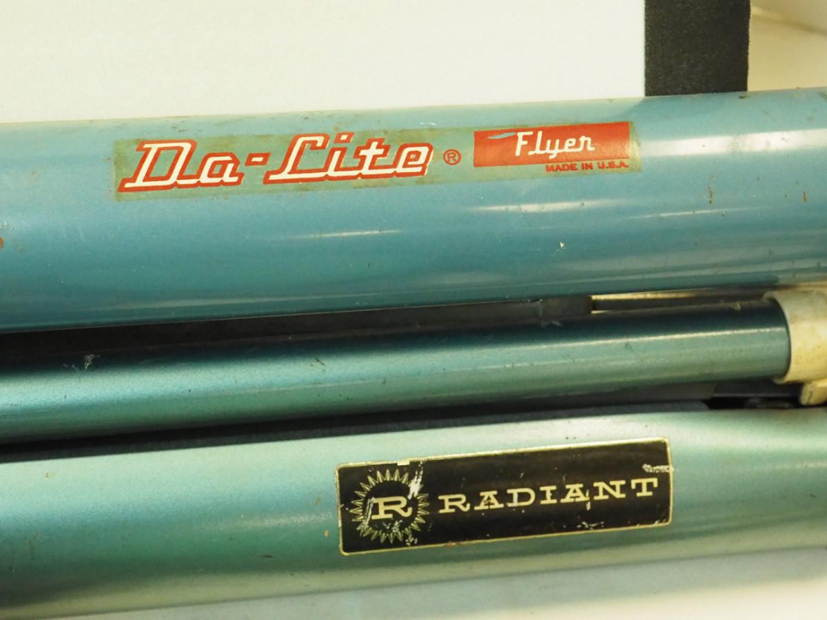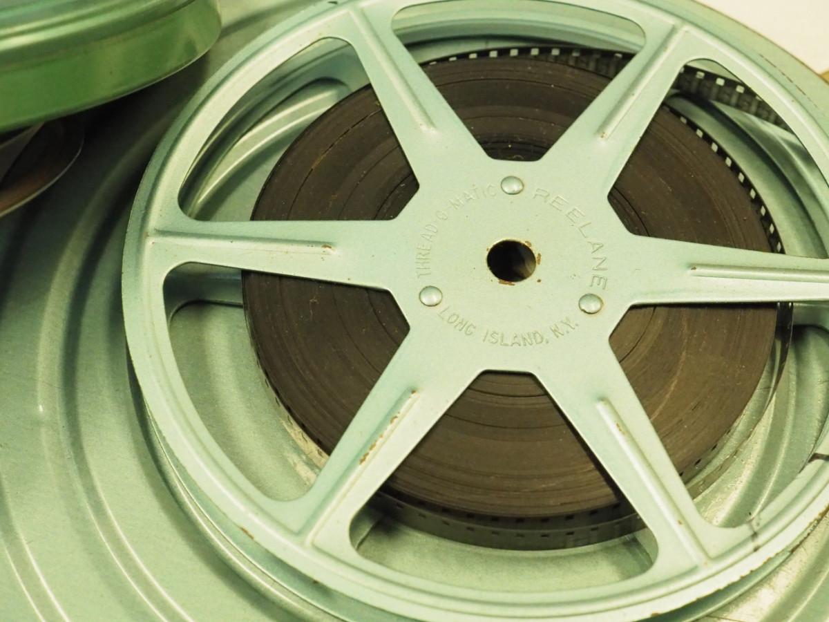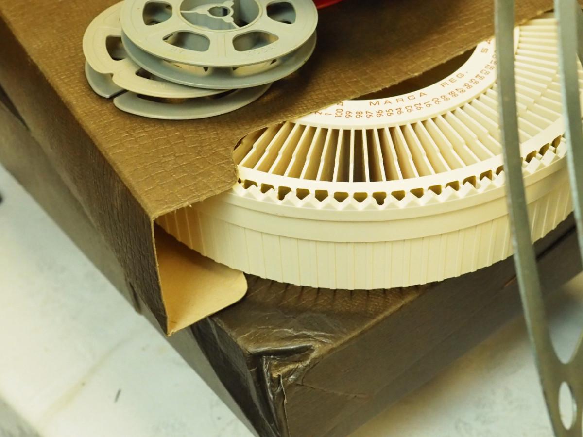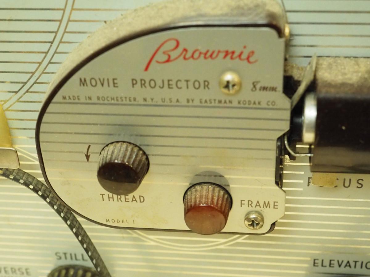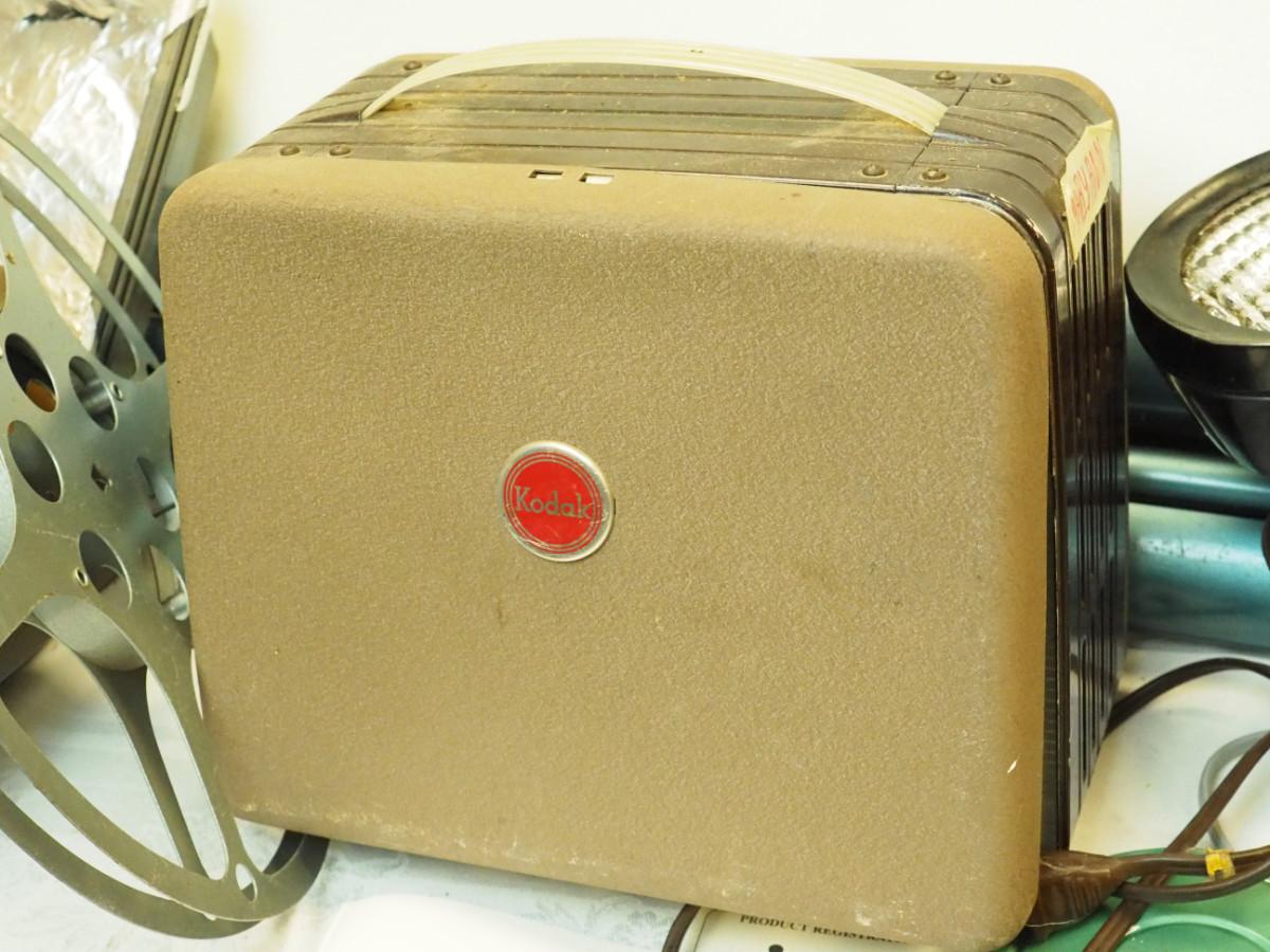 146- Vintage super 8 movie projector, film, reels, screens. Brownie projector, empty and full reels of film.