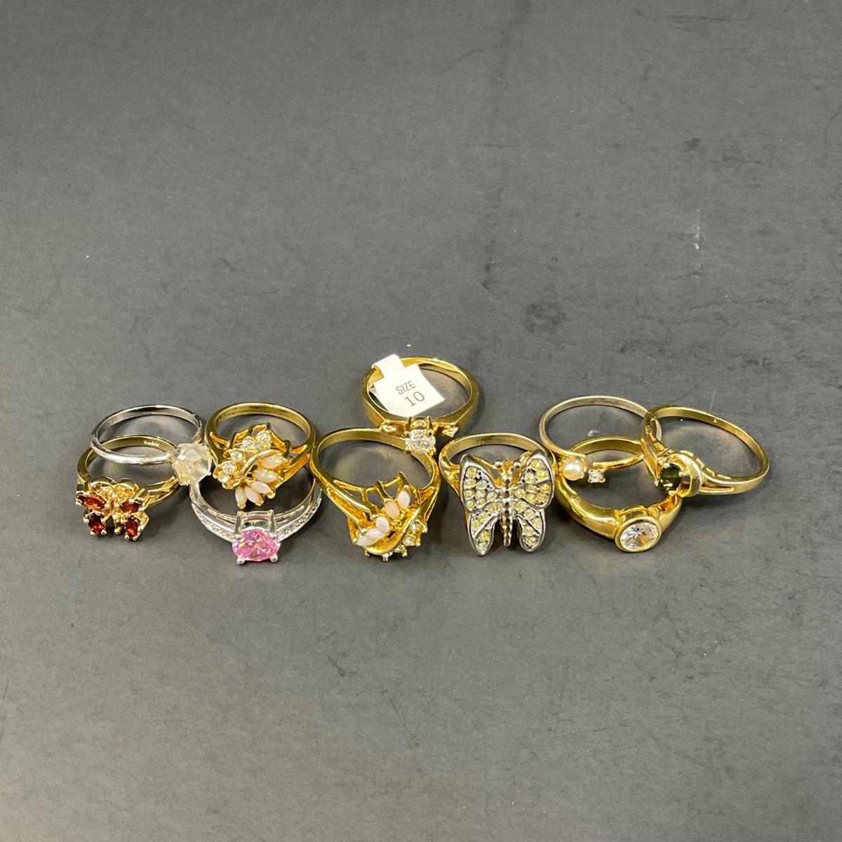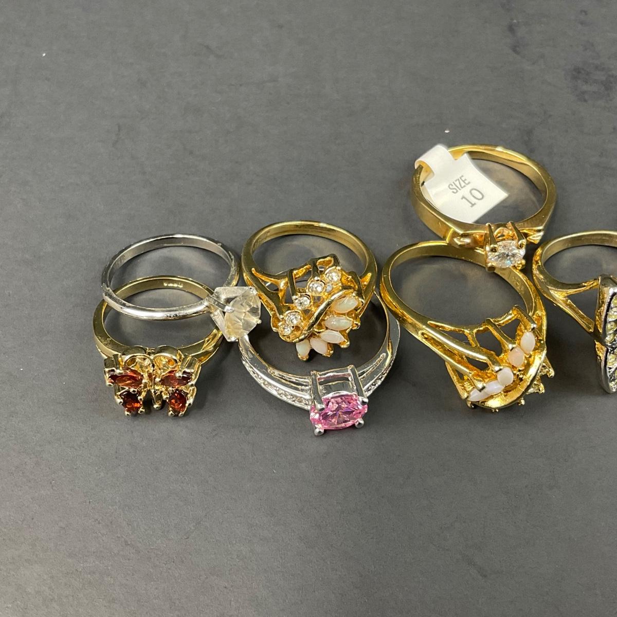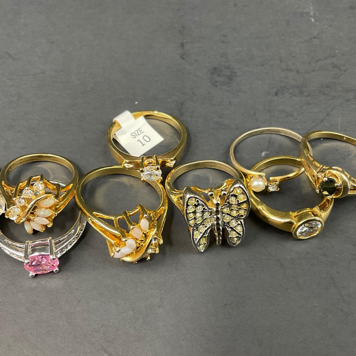 Ten assorted costume jewelry rings ranging from size 6 to size 11.5 there are some adjustable rings as well. Please see photos for details and condition. Any condition statement is given as a courtesy to a client, is an opinion, and should not be treated as a statement of fact. Reference to condition written, oral or within a condition report shall not be regarded as a full account of condition and may not include all defects, alterations, or restorations. Absence of a condition report does not imply a lot is flawless or lacking imperfections or damage. Katherine’s Auction & Appraisal Service shall have no responsibility for any error or omission. Returns shall not be accepted on the basis of condition. ::: Shipping is available on this lot. If you require shipping you must let us know at the close of the auction. We will coordinate with you after the item has been won. Shipping fees will include insurance up to or exceeding the value of all items being mailed. If you have any questions regarding this lot please contact the auctioneer either via this website, by direct email or by phone. PICK UP TIMES and other important information can be found in the TERMS and DESCRIPTION of the auction. Please take a look for pertinent information. Thanks!