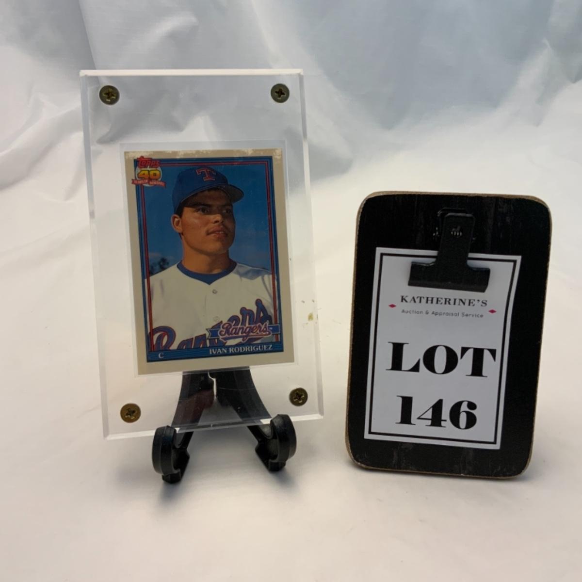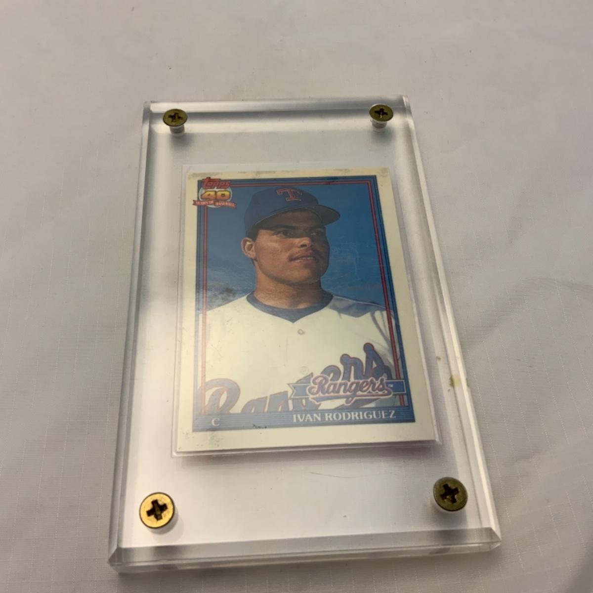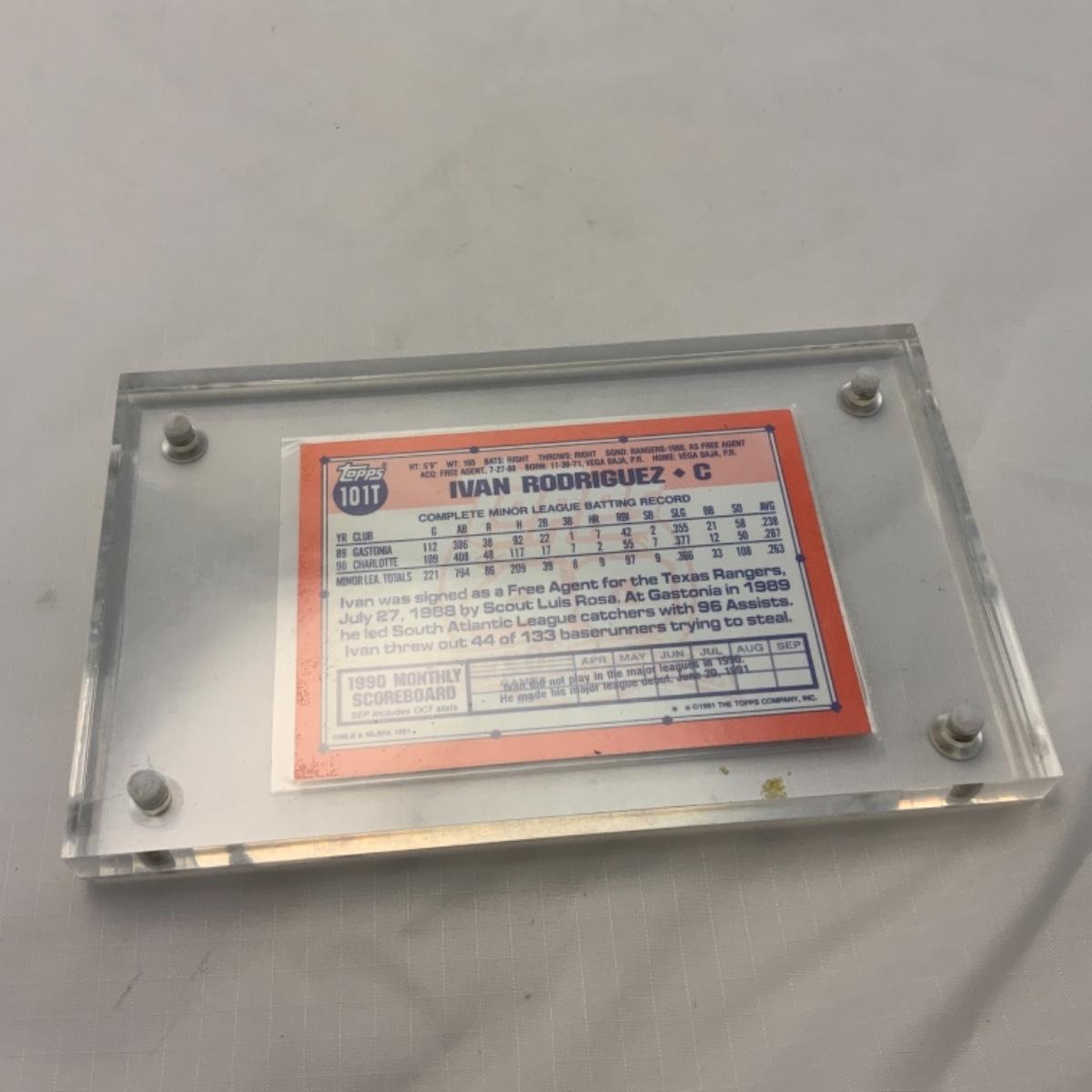 Ivan Rodriguez TOPPS Baseball Card #101T from the 1991 Series. Set in an acrylic Plaque. Card could be removed and sent in for grading if you’re feeling lucky. Card is in exceptional condition. Please see photos for details and condition. ::: Shipping is available on this lot. If you require shipping you must let us know at the close of the auction. We will coordinate with you after the item has been won. Shipping fees will include insurance up to or exceeding the value of all items being mailed. If you have any questions regarding this lot please contact the auctioneer either via this website, by direct email or by phone. PICK UP TIMES and other important information can be found in the TERMS and DESCRIPTION of the auction. Please take a look for pertinent information. Thanks!