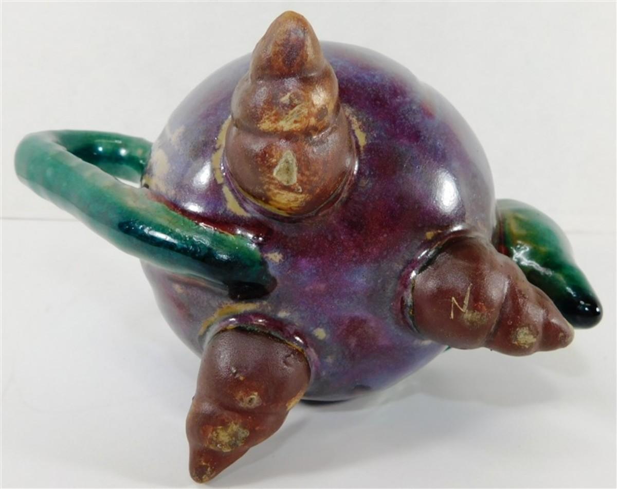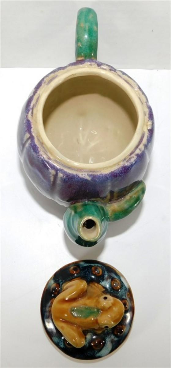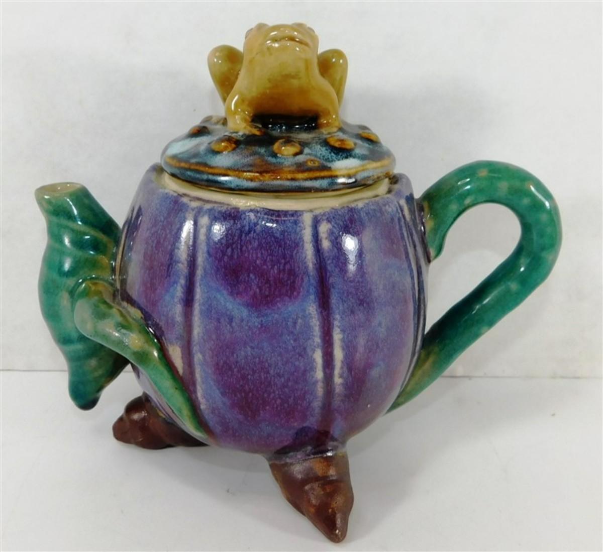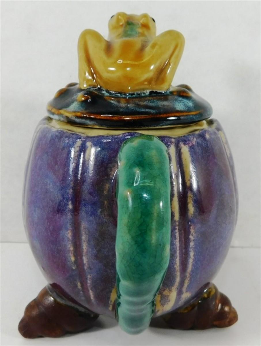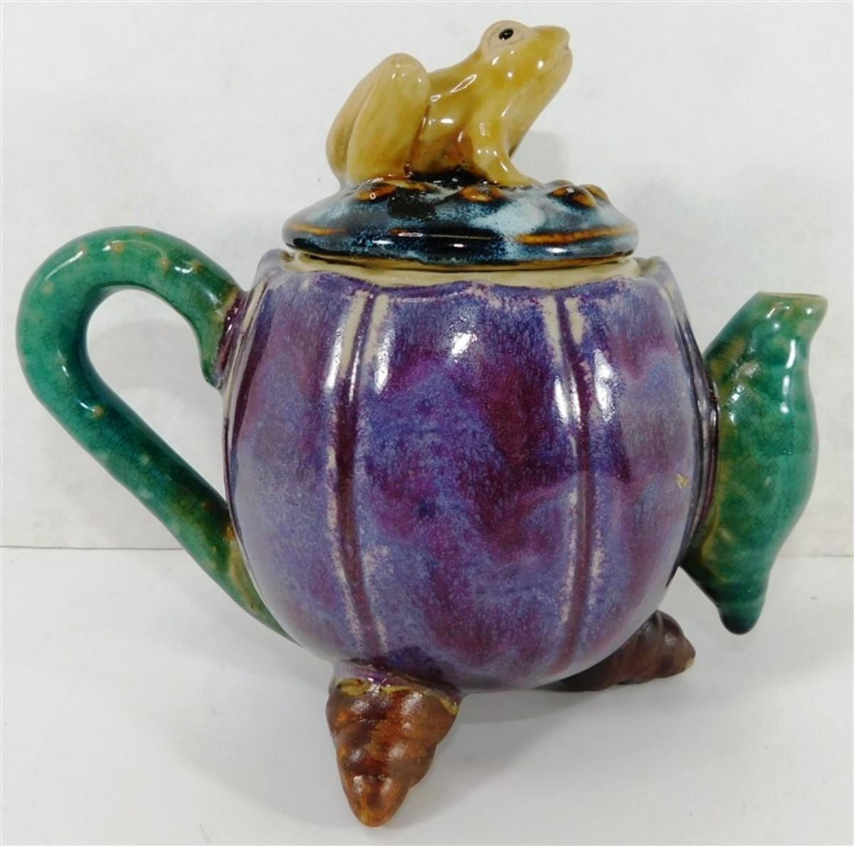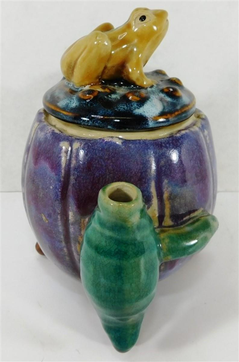146 Majolica Style Stoneware Art Tea Pot w/Frog Conch Shells 7 x 5 1/2