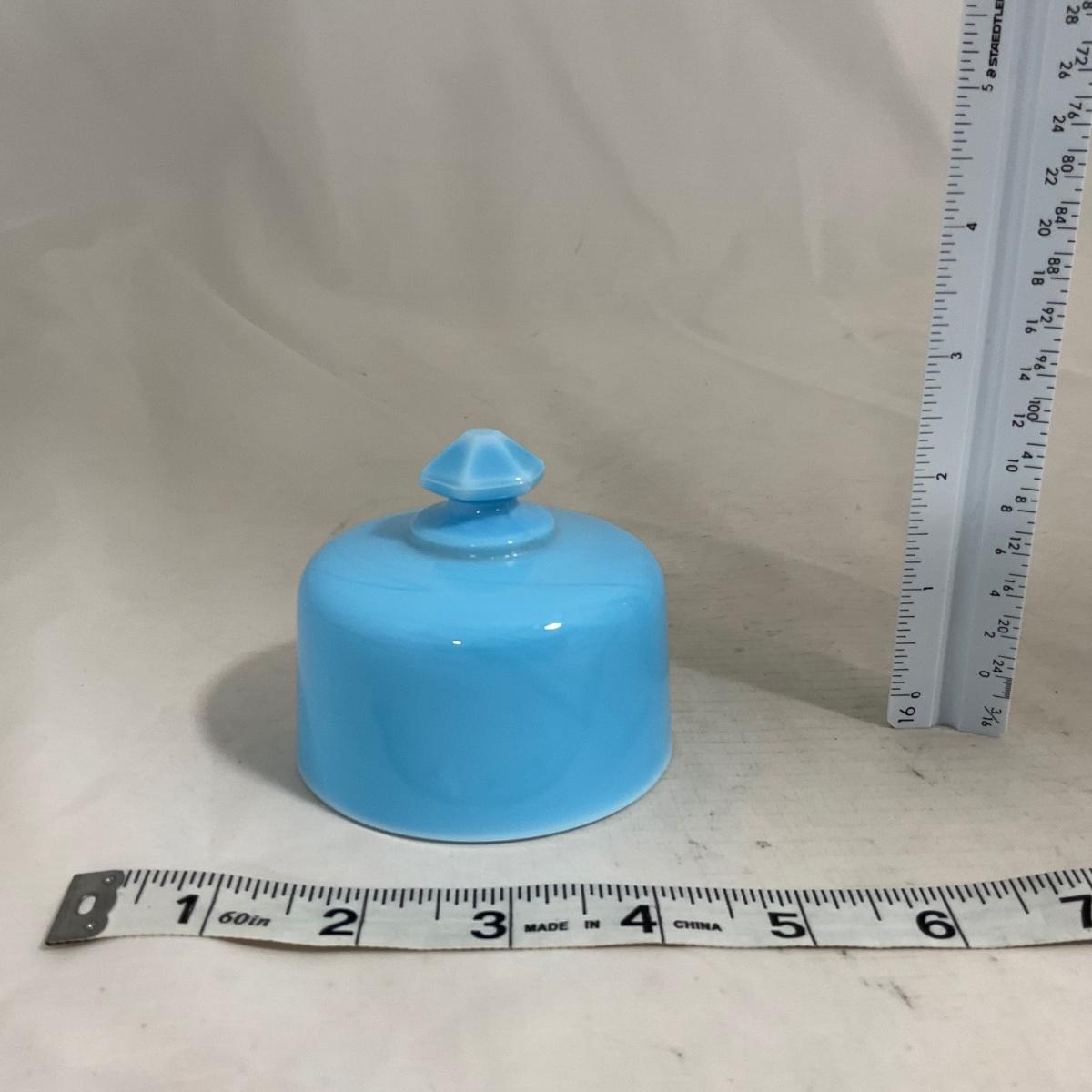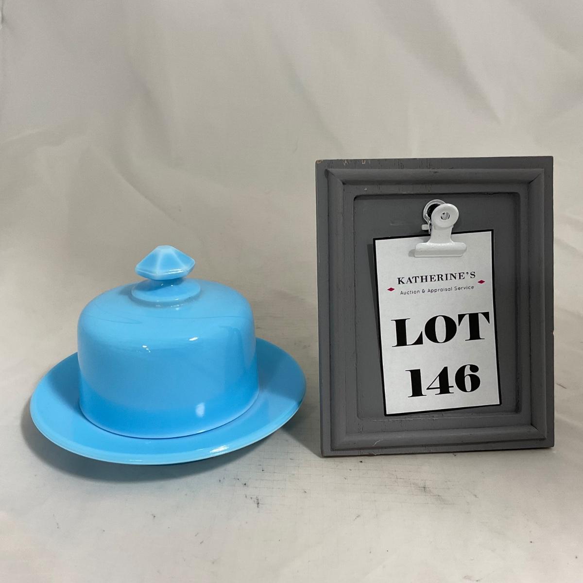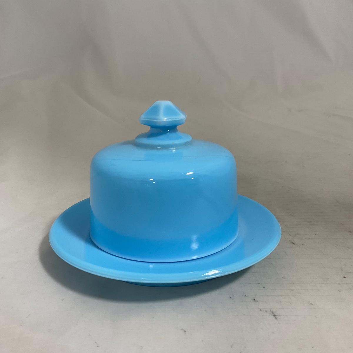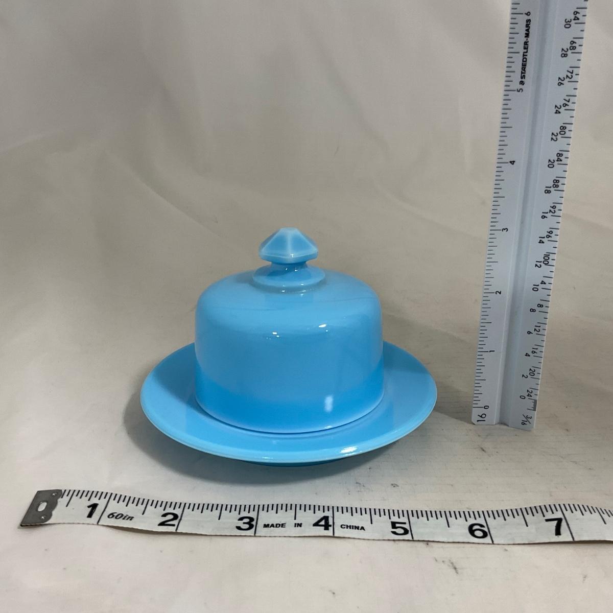 Small blue slag glass covered butter dish. Marked. In reallly good shape. Please see photos for details and condition. ::: Shipping is available on this lot. If you require shipping you must let us know at the close of the auction. We will coordinate with you after the item has been won. Shipping fees will include insurance up to or exceeding the value of all items being mailed. If you have any questions regarding this lot please contact the auctioneer either via this website, by direct email or by phone. PICK UP TIMES and other important information can be found in the TERMS and DESCRIPTION of the auction. Please take a look for pertinent information. Thanks!
