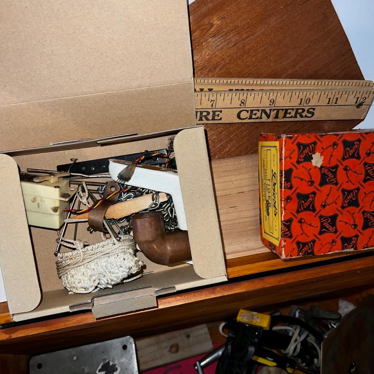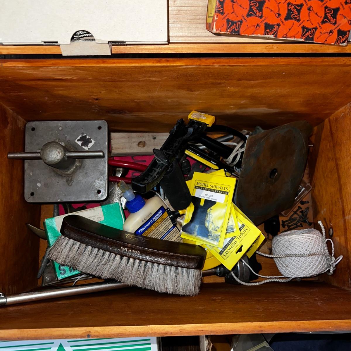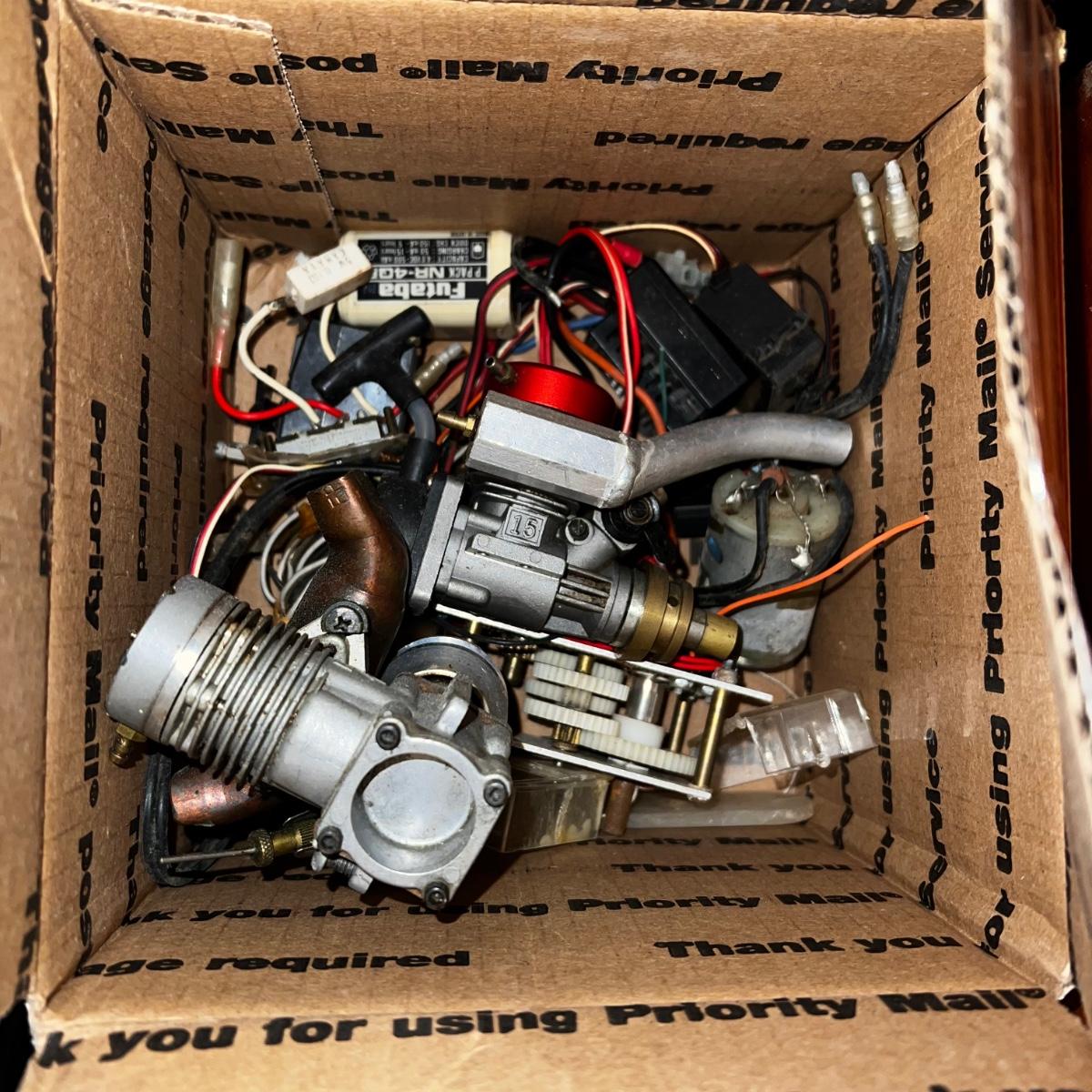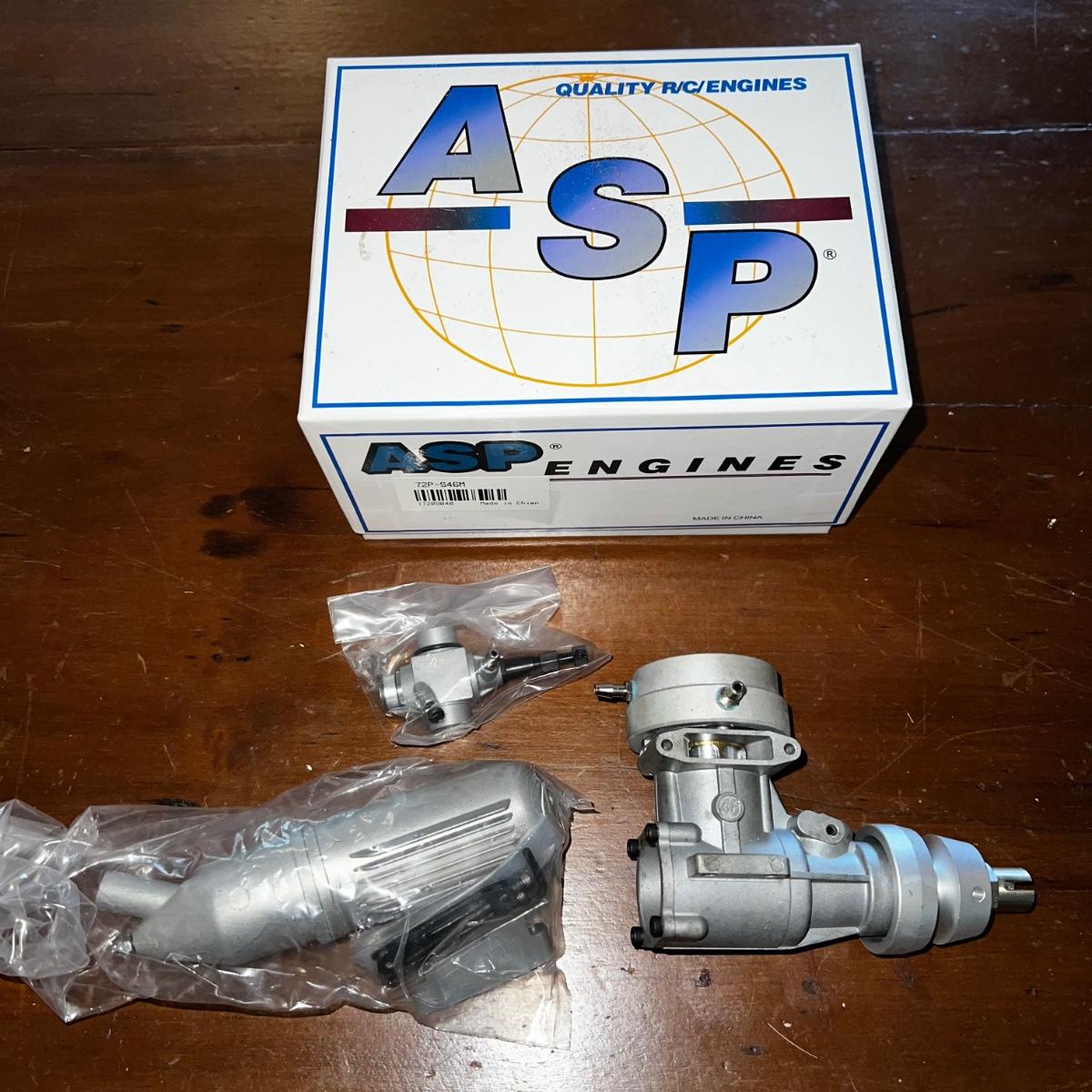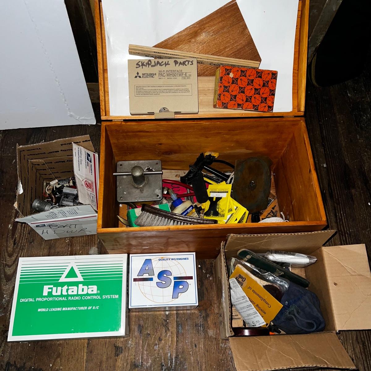 Includes ASP 72P-546M new engine, Futaba Attack-SR controller, miscellaneous used boat engines, also paints, plastic parts, tools, and other items.