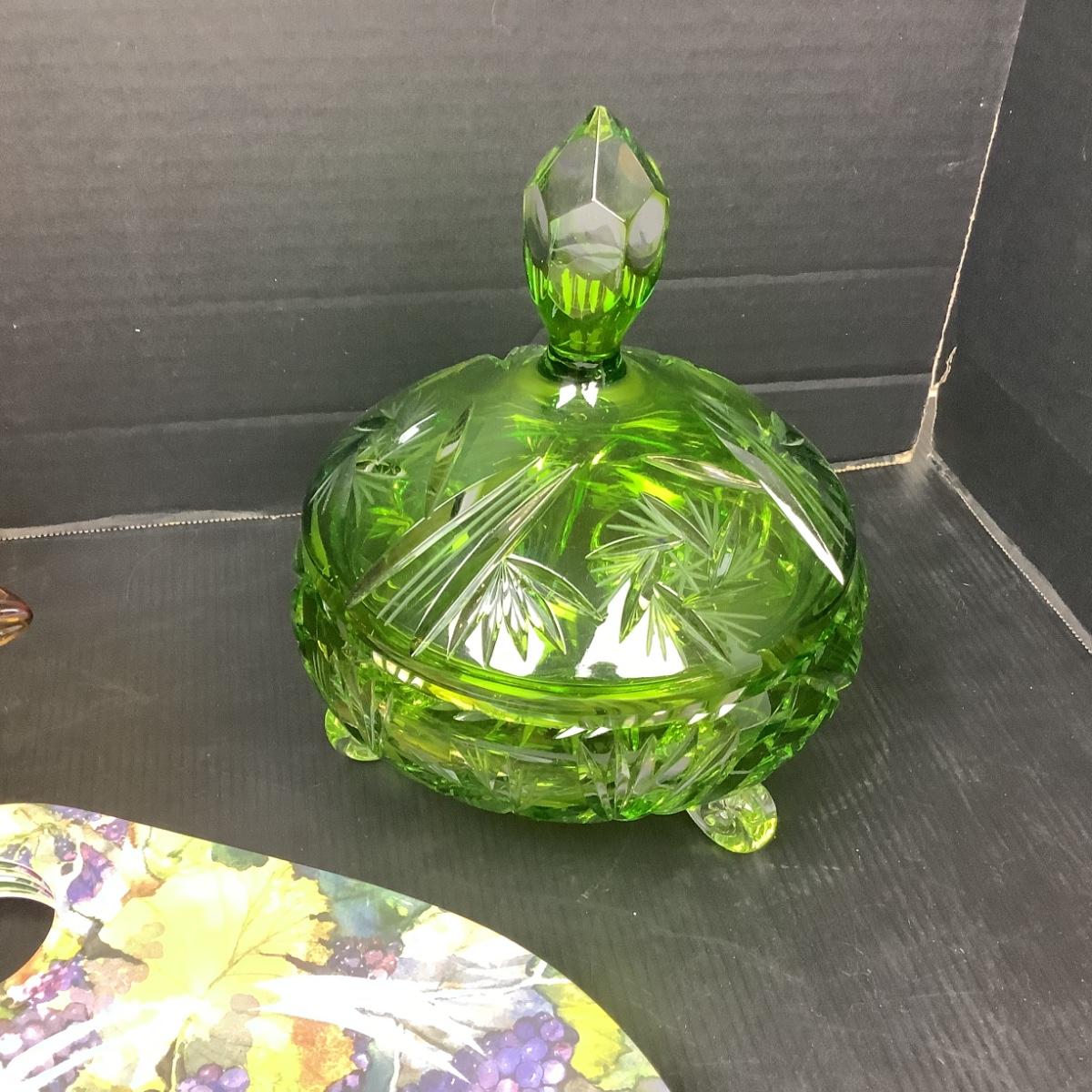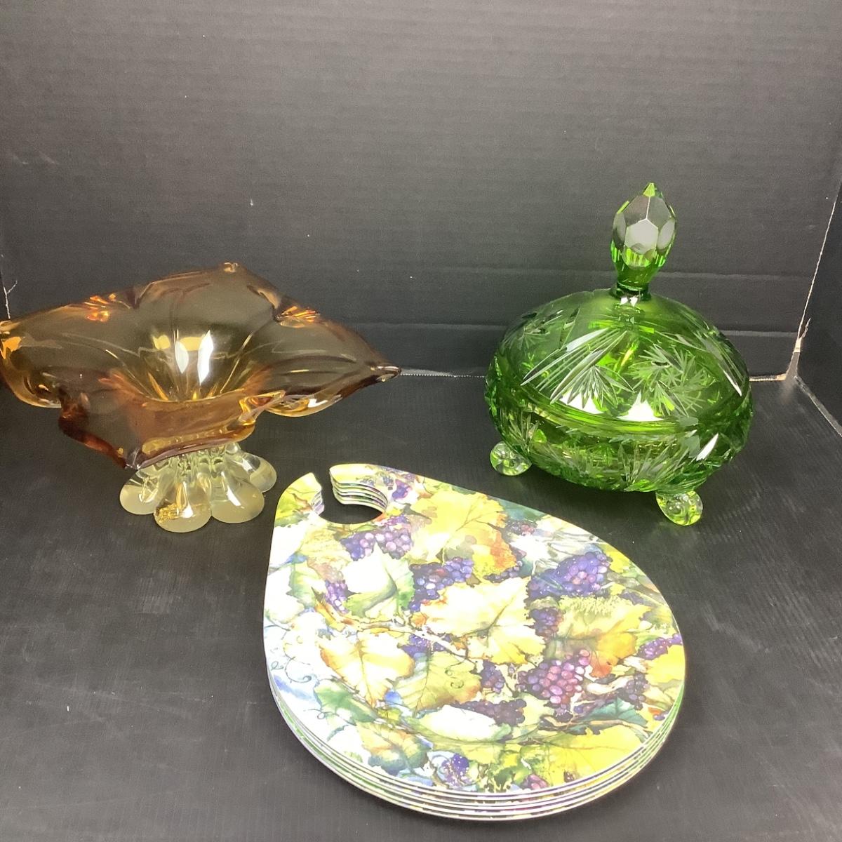 Green etched glass footed dish with lid, amber glass dish and a set of 8