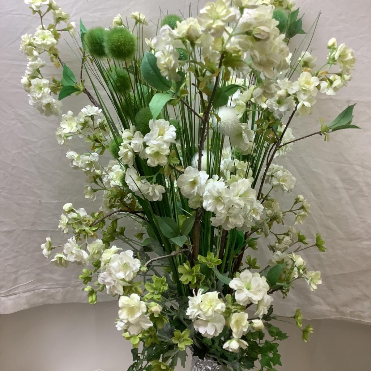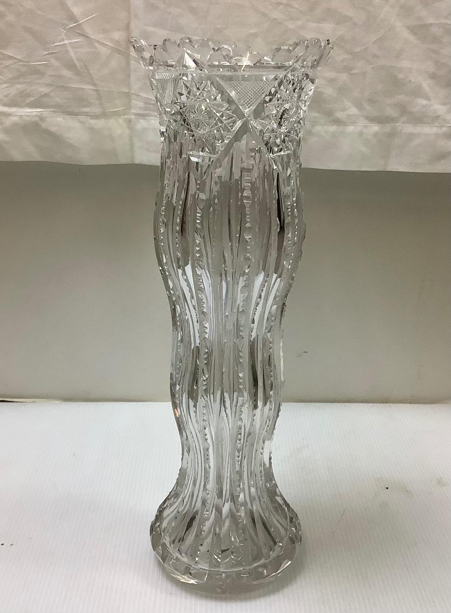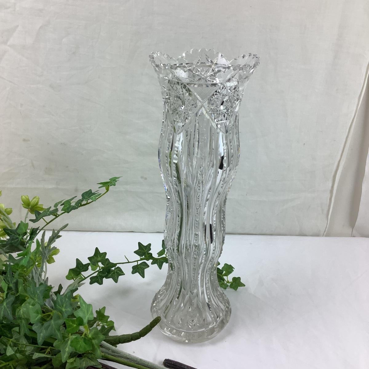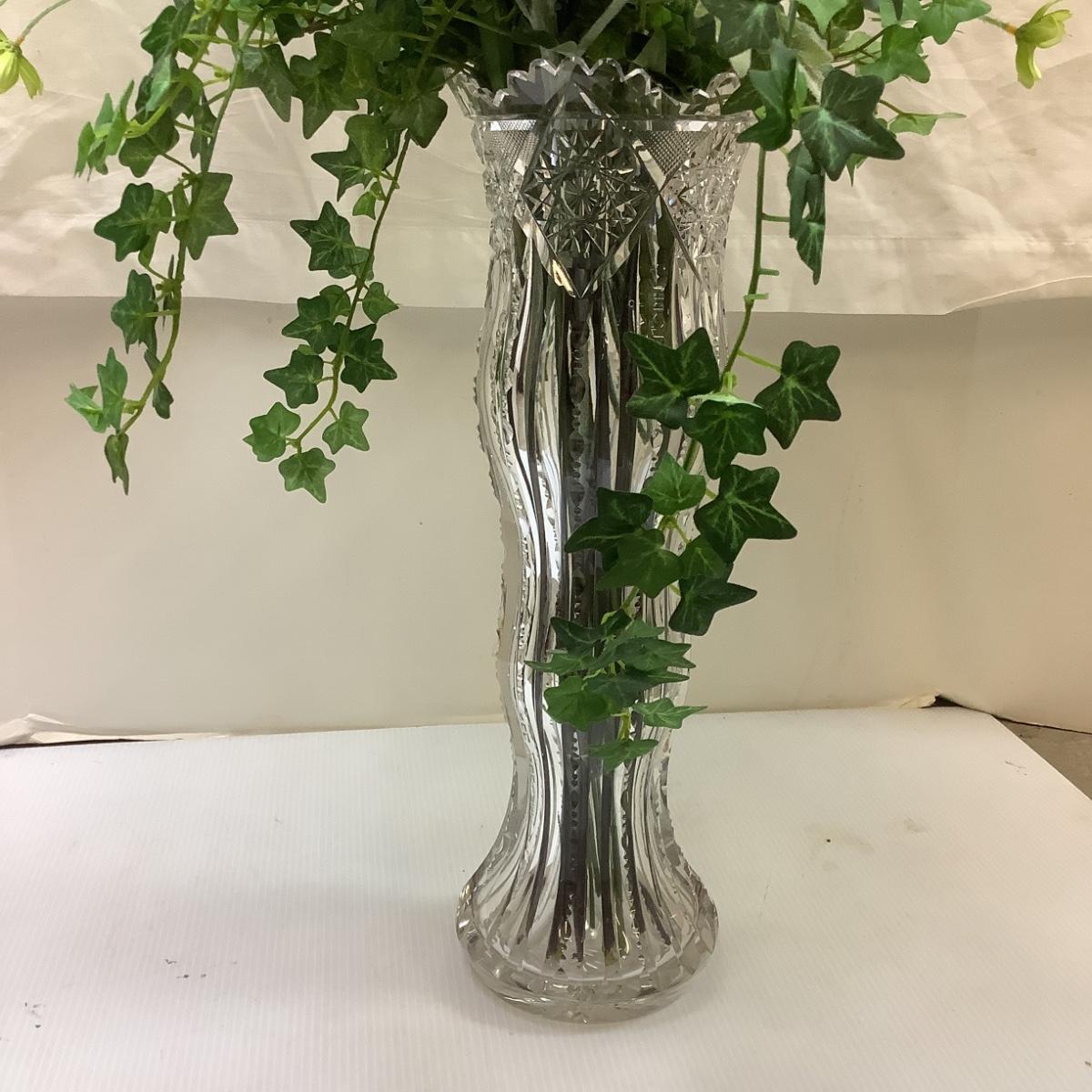 1469 Vintage Cut Glass Vase with Silk Greenery and Flowers