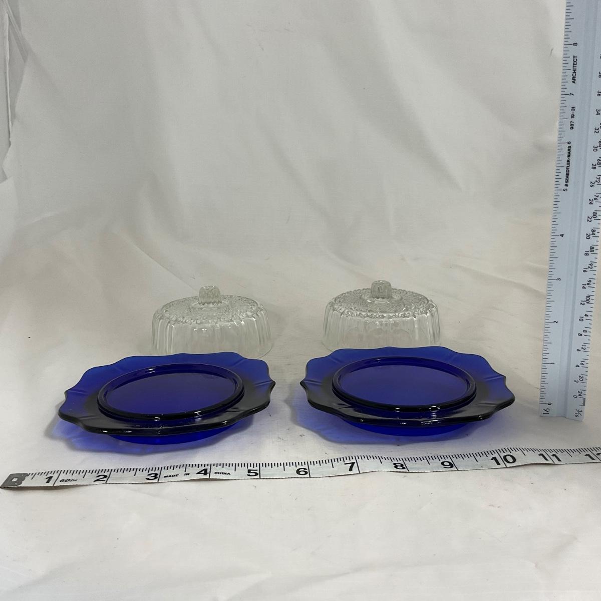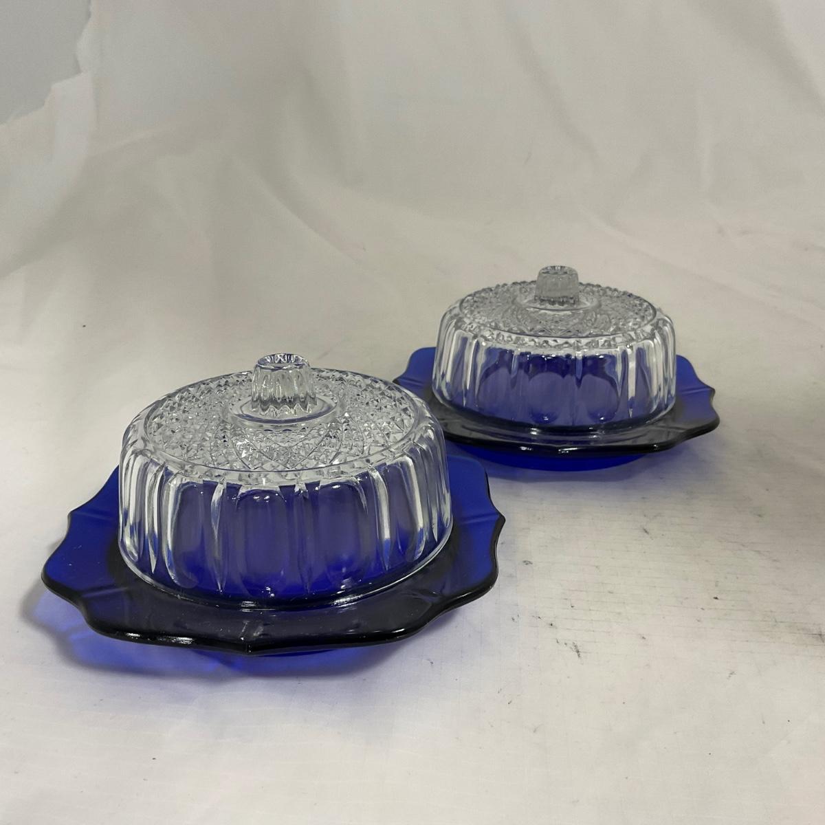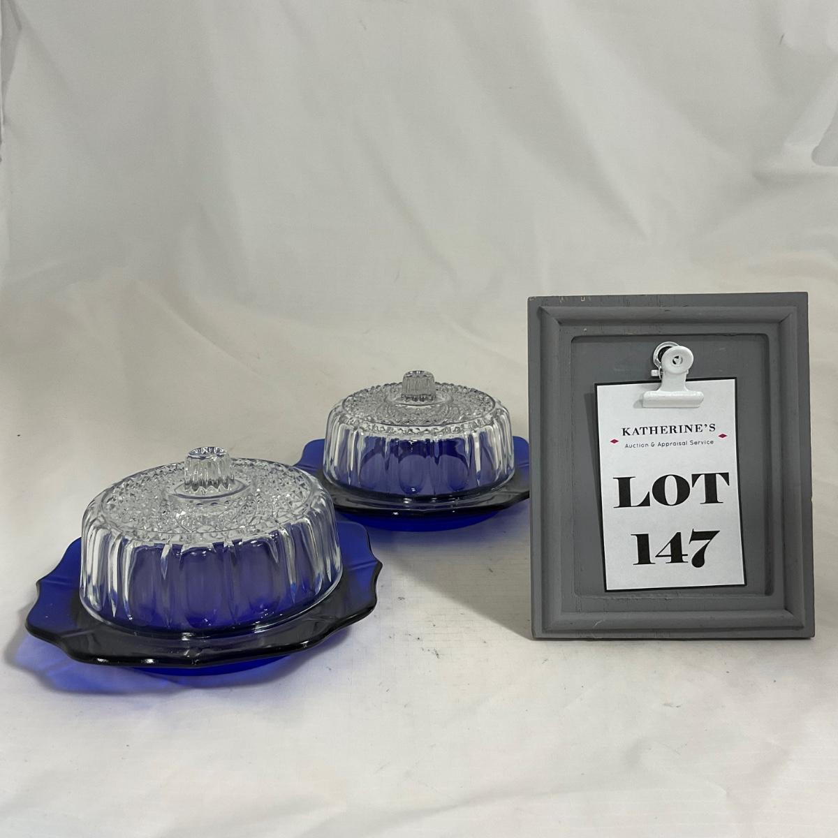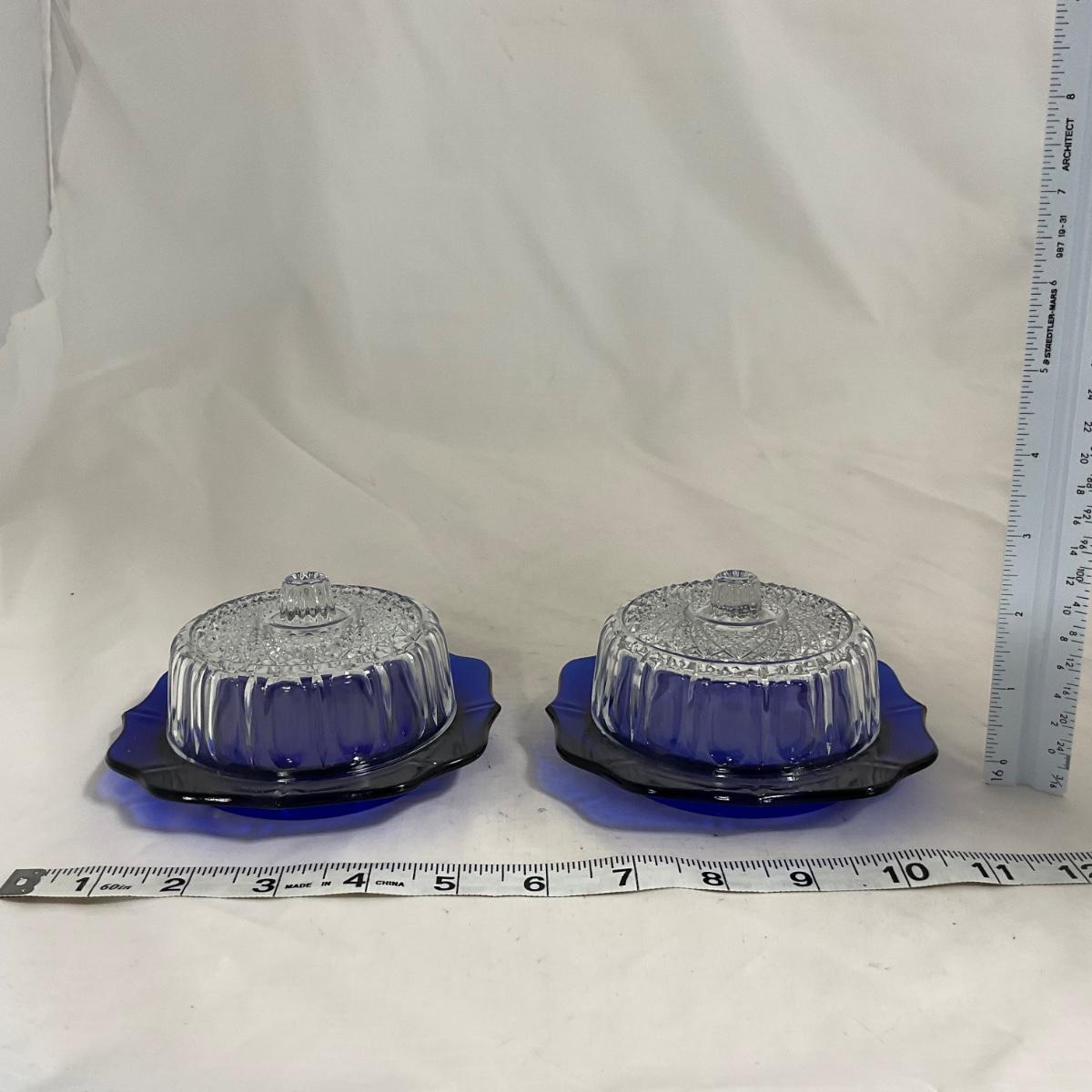 -147- Cobalt & Clear Glass | Set of Two | Covered Butter Dishes