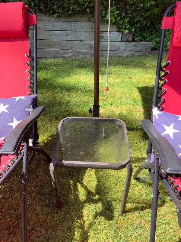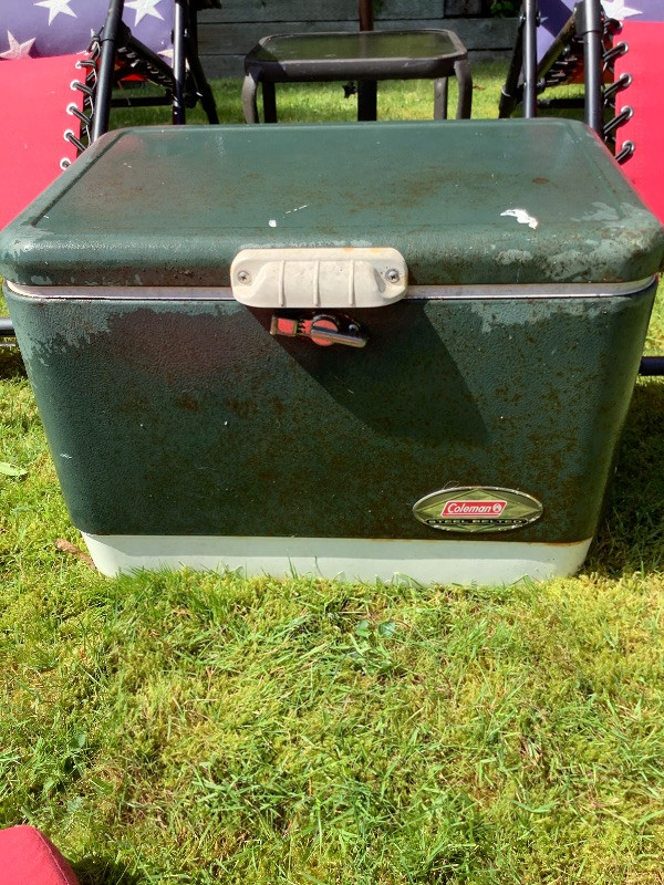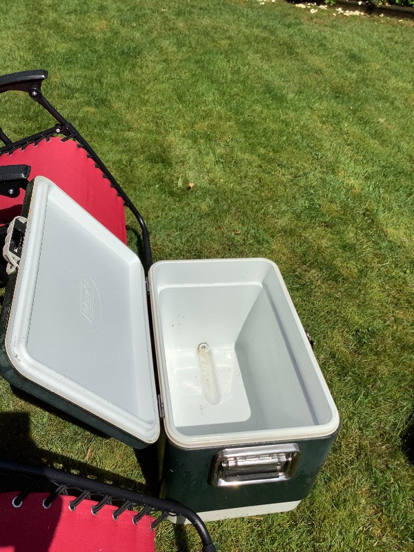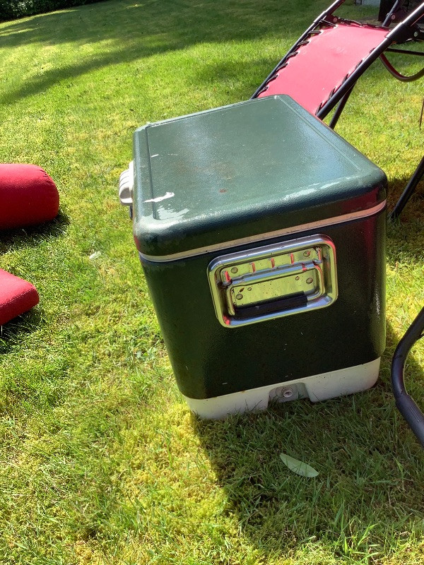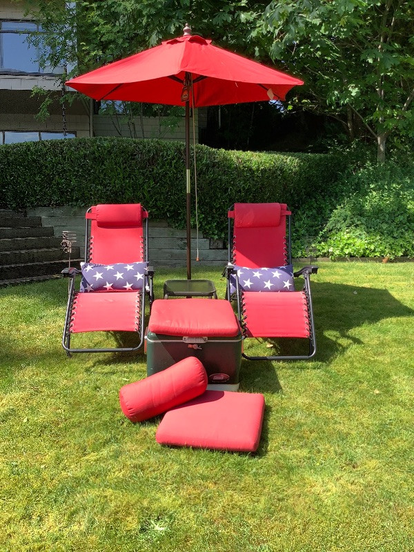 This whole lot of chairs table pillows cooler and umbrella will help you relax relax in style. Cooler is missing it’s drain plug